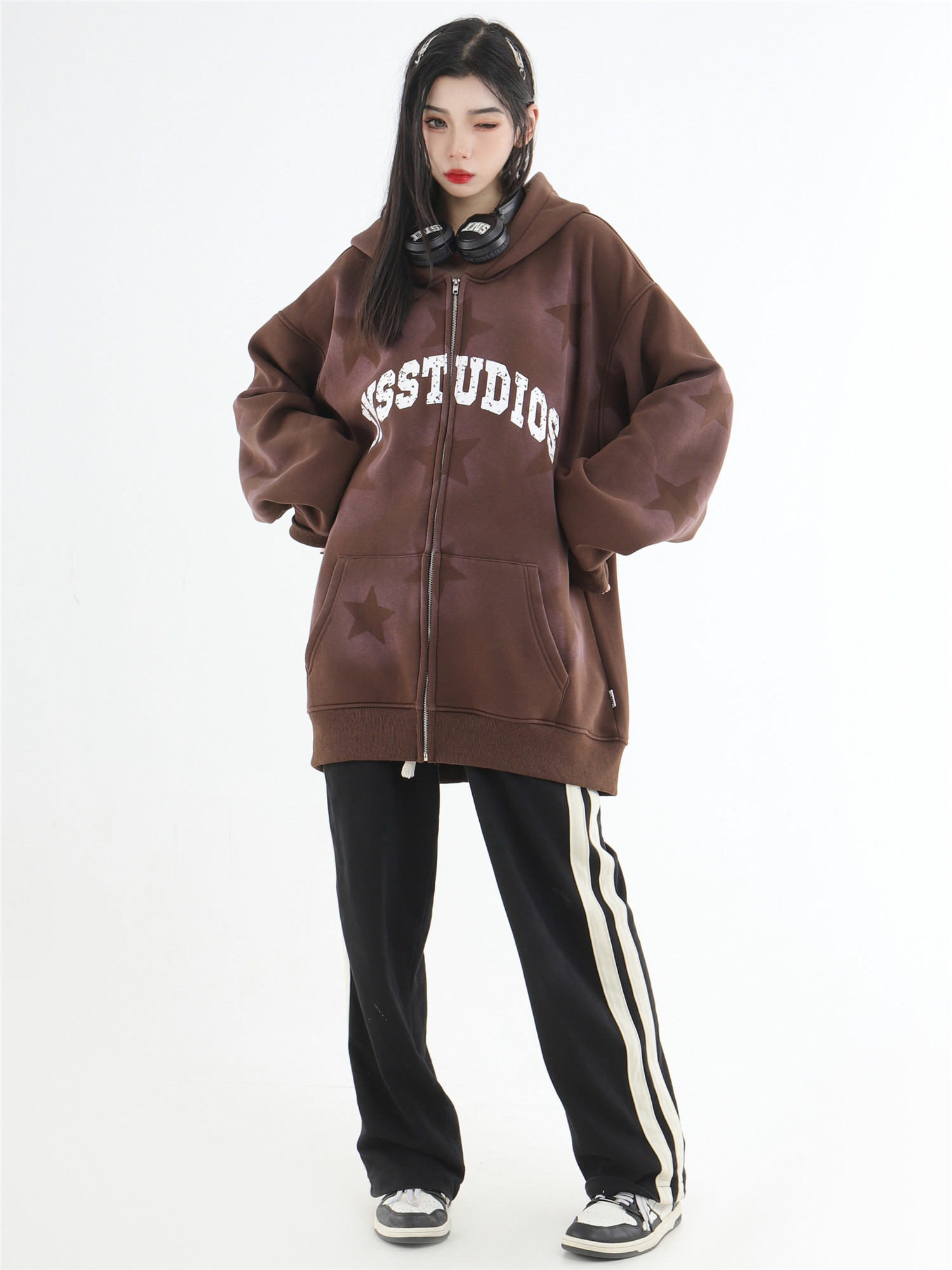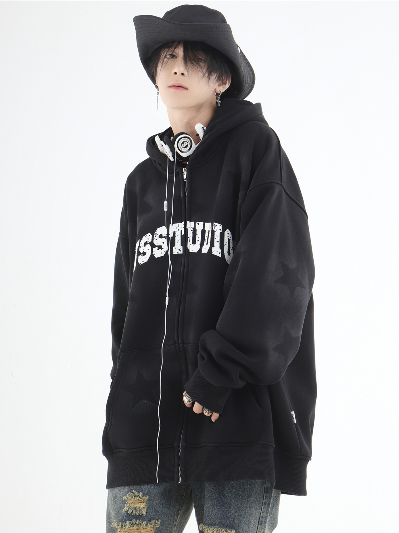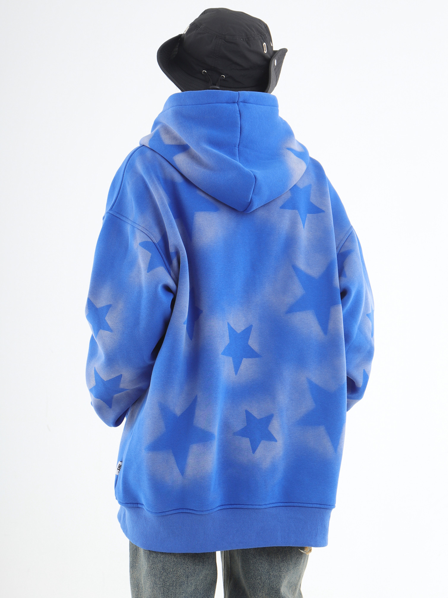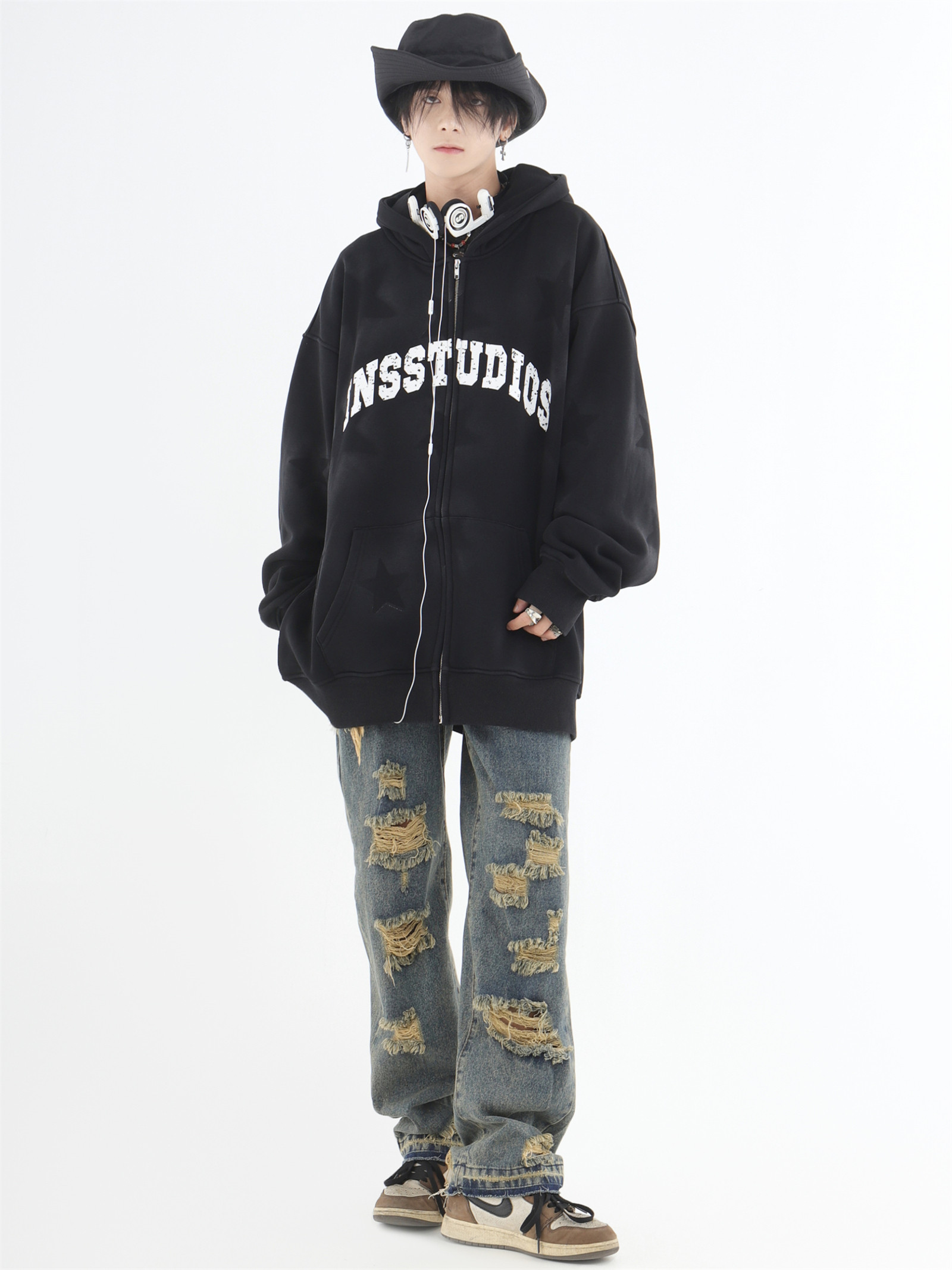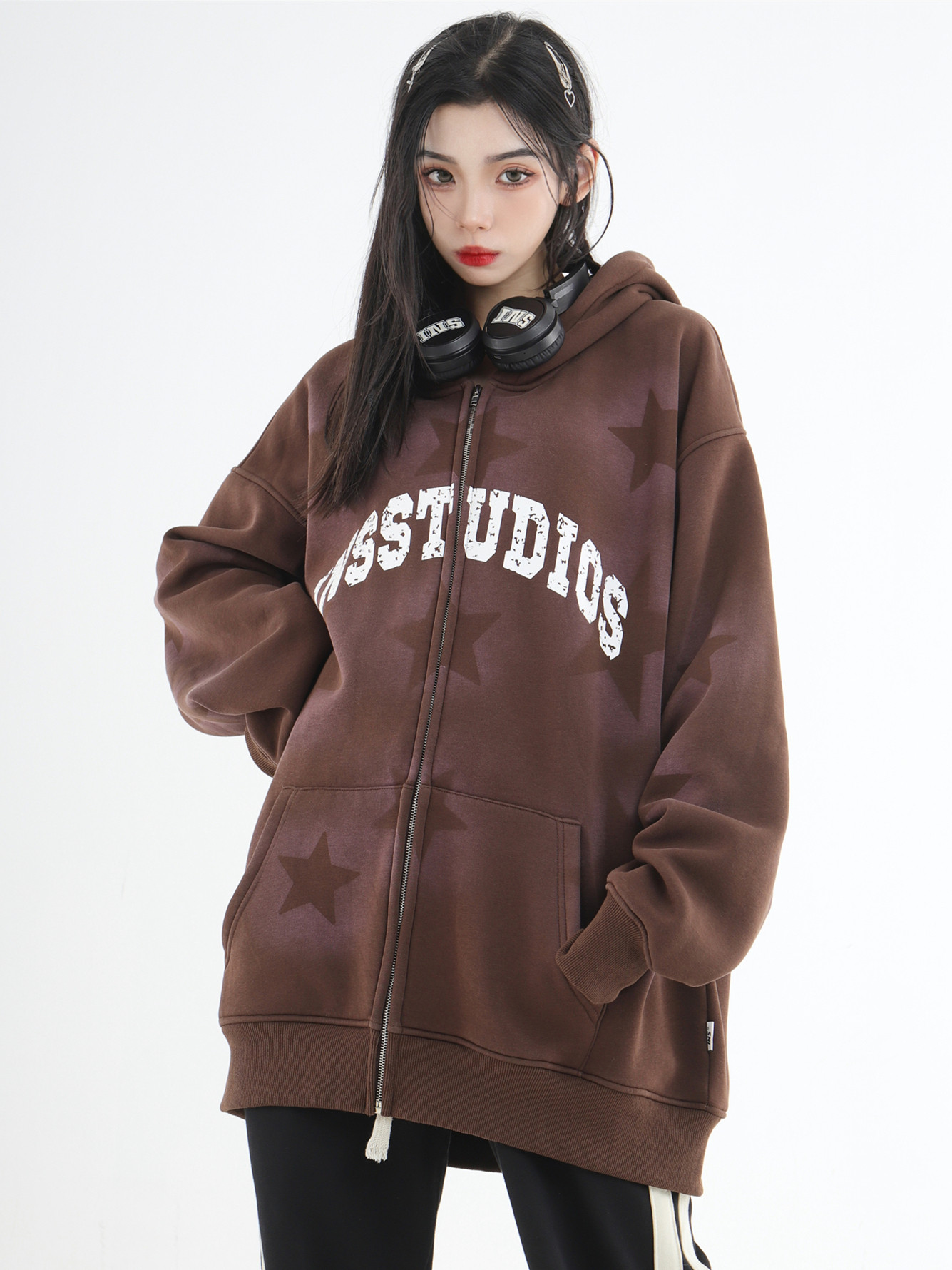 INSstudios 國潮牌情侶美式星星滿印暈染開衫厚棉T加絨拉鍊外套男