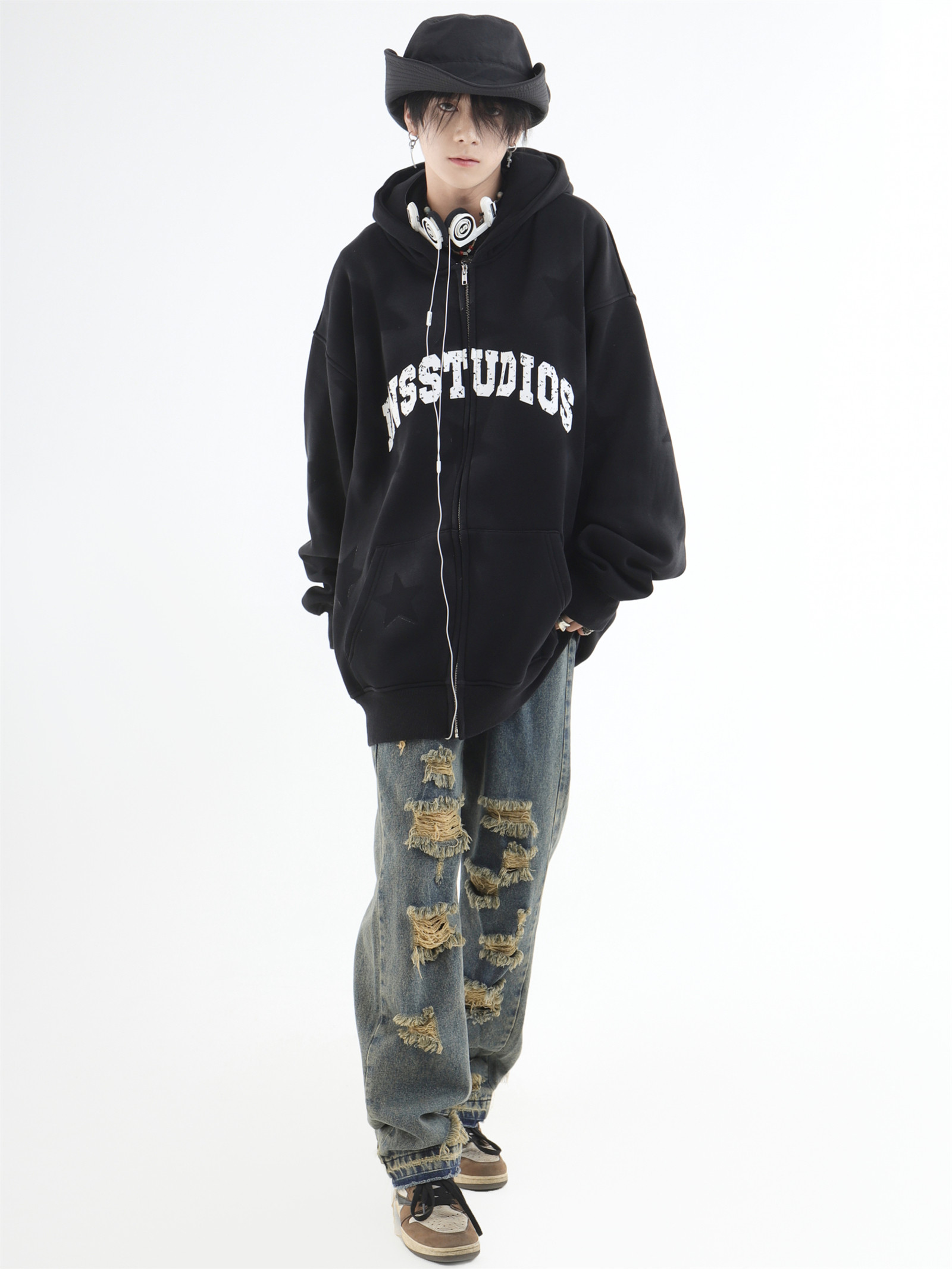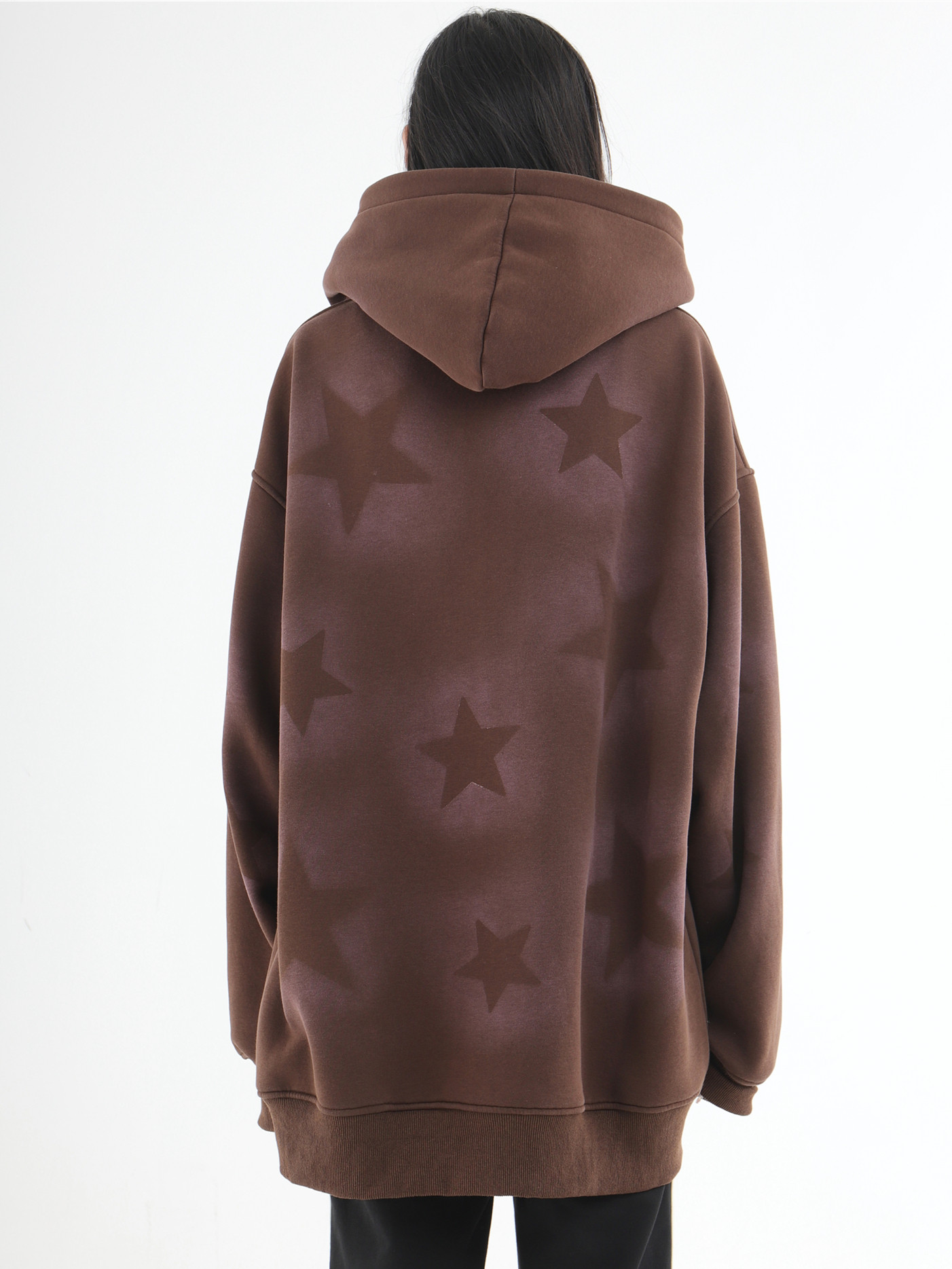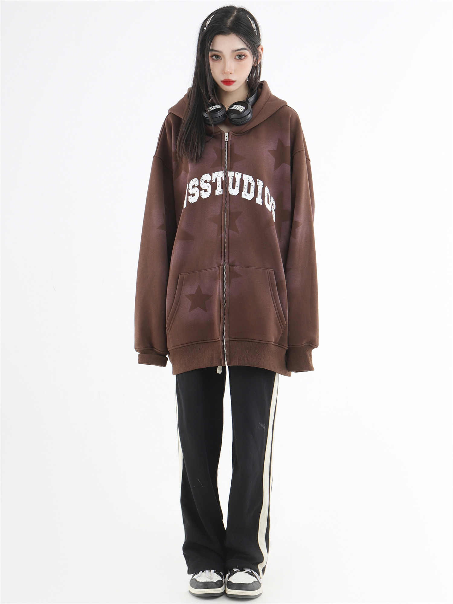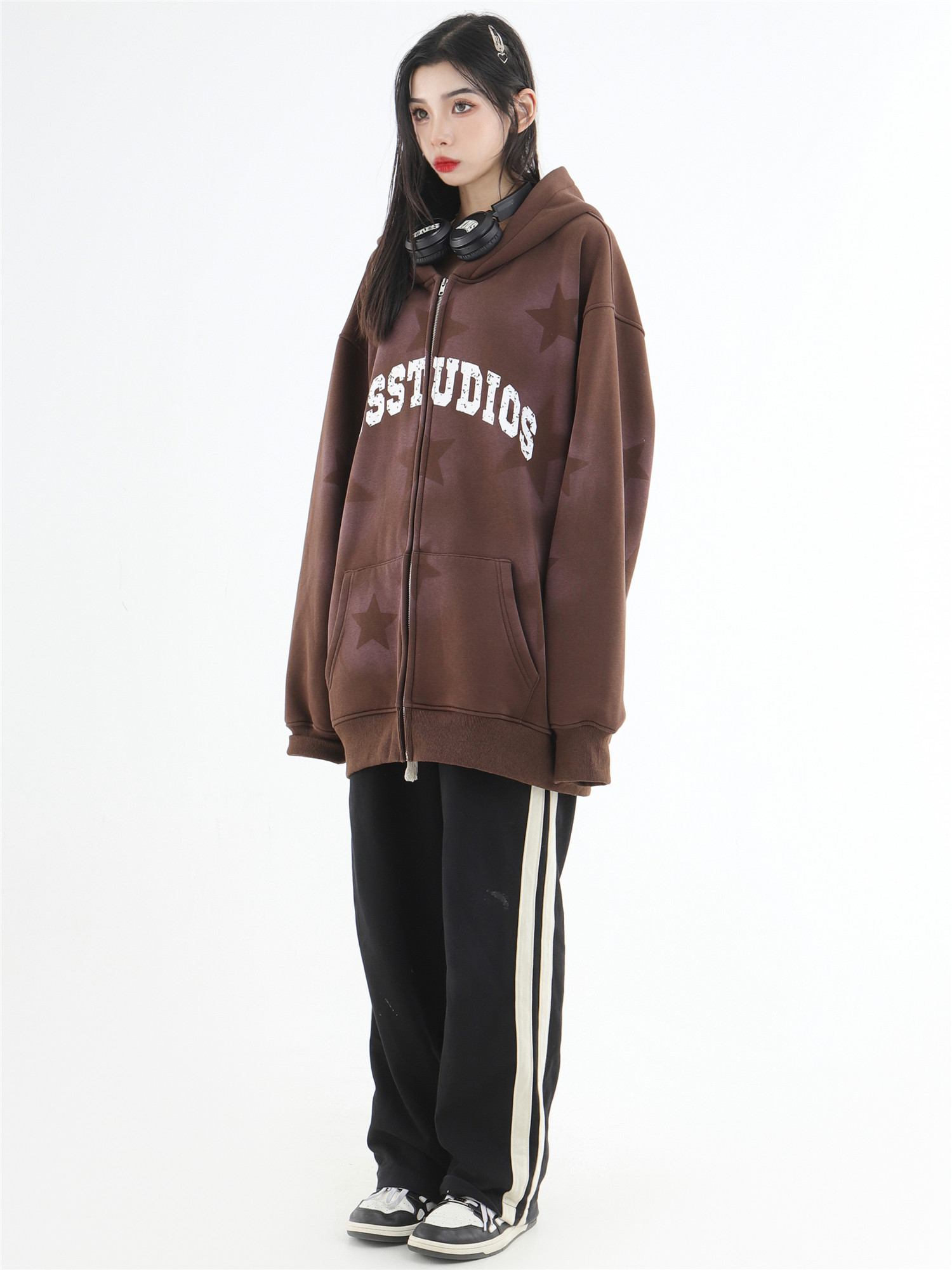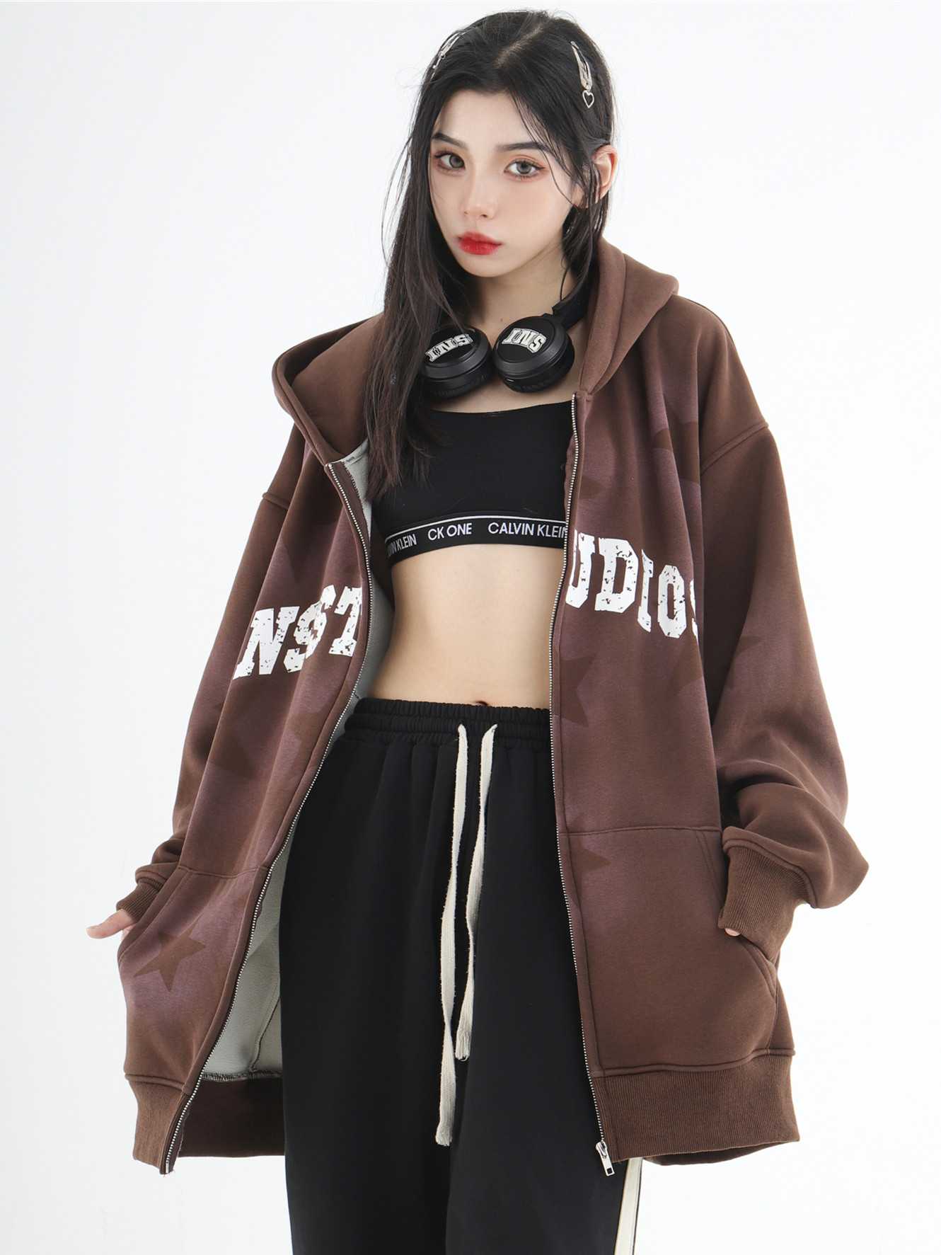 INSstudios 國潮牌情侶美式星星滿印暈染開衫厚棉T加絨拉鍊外套男