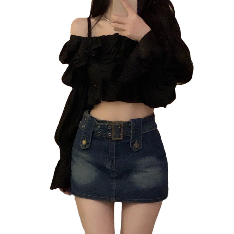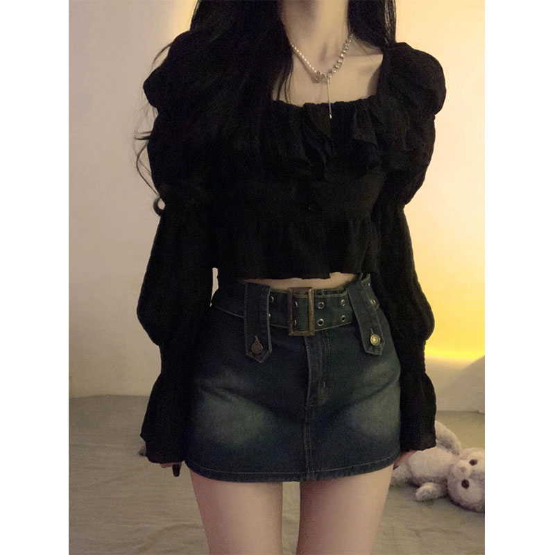 韓系chic褶皺方領襯衫女秋裝純欲荷葉邊短款卡腰小衫別致辣妹上衣