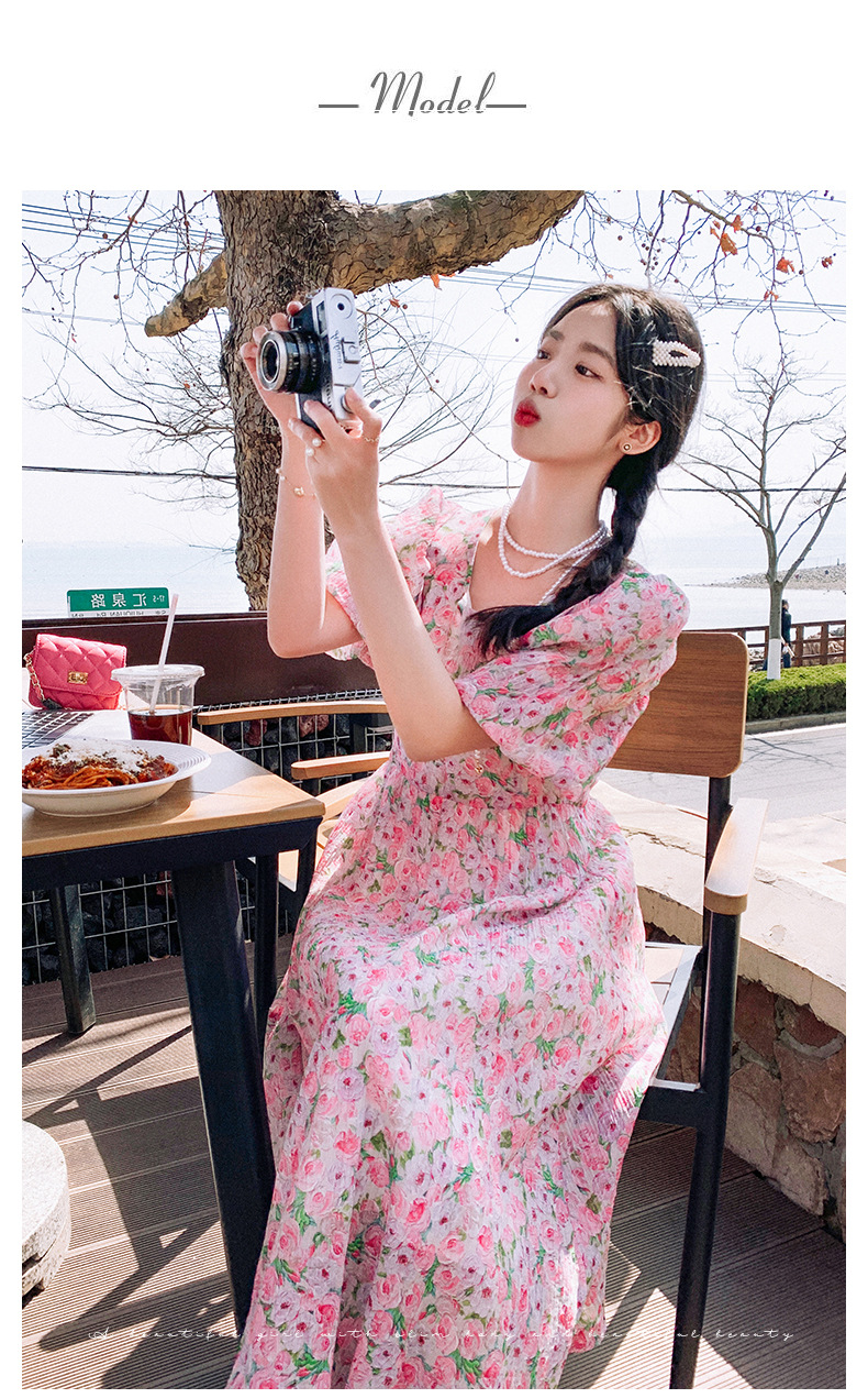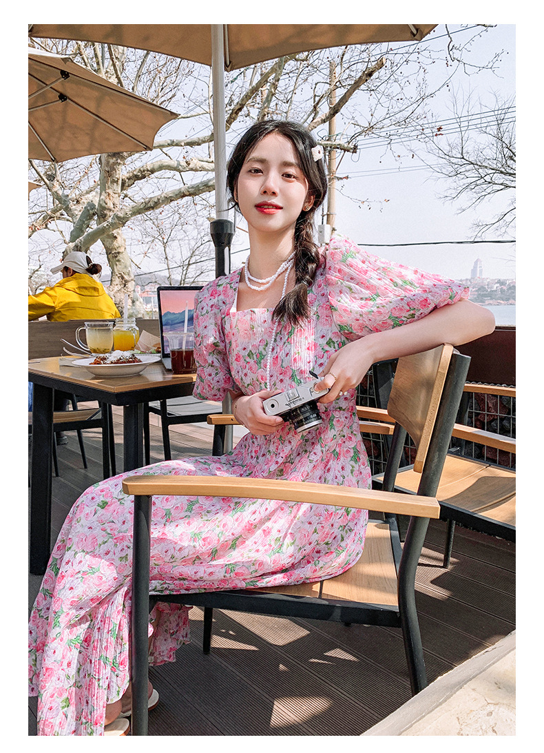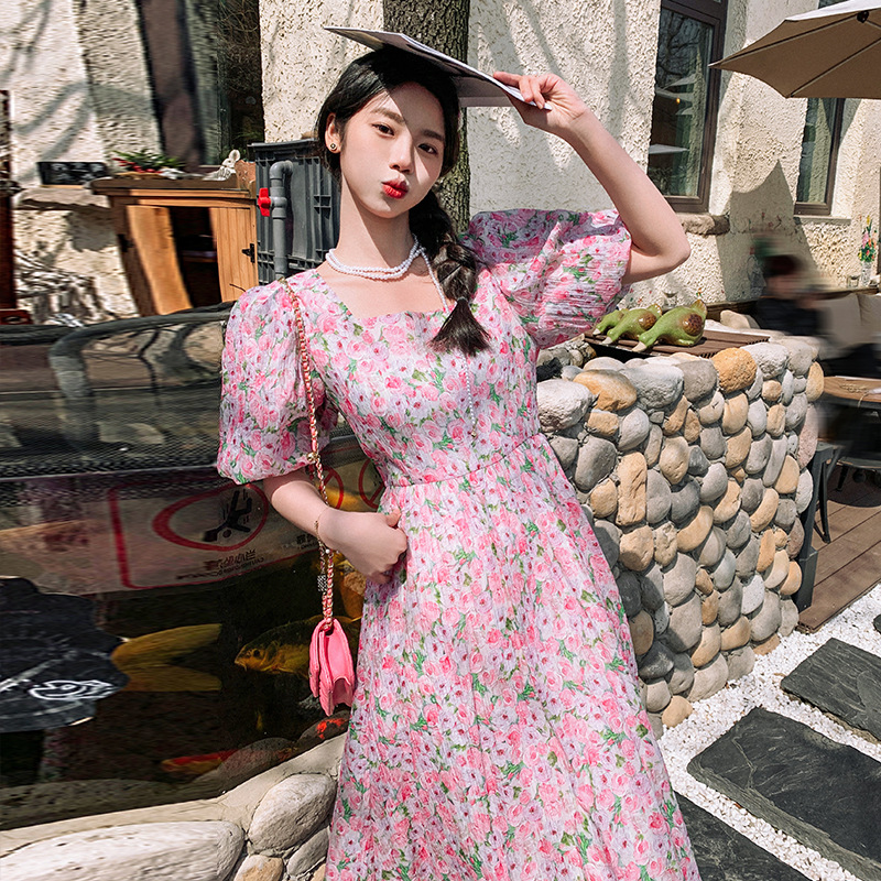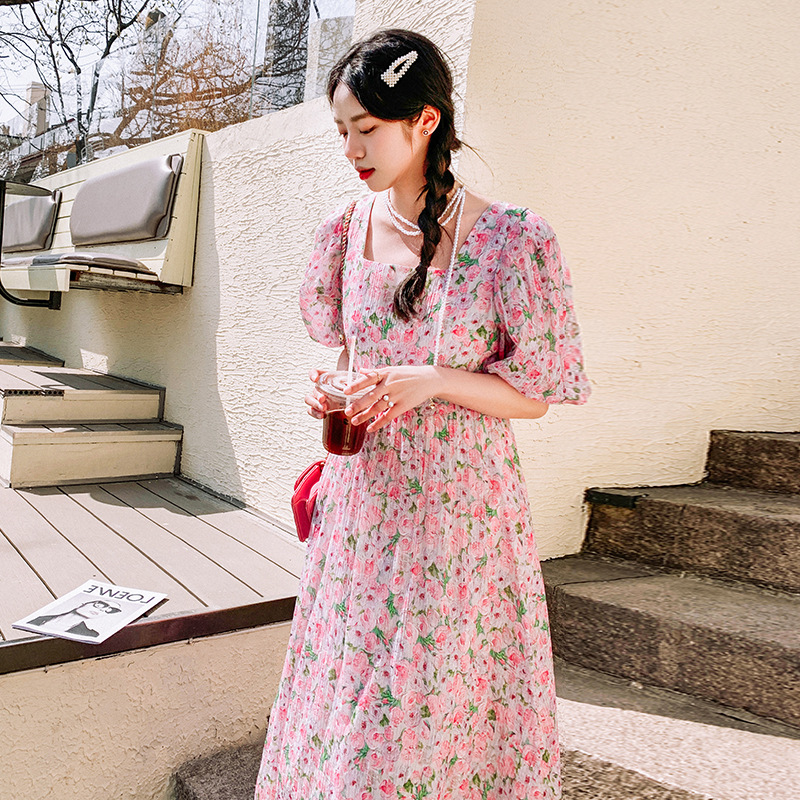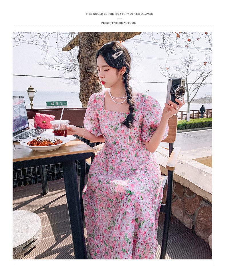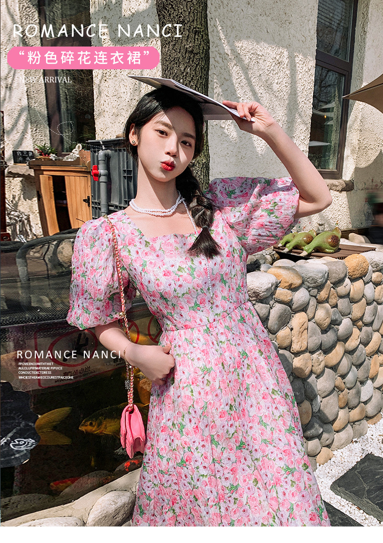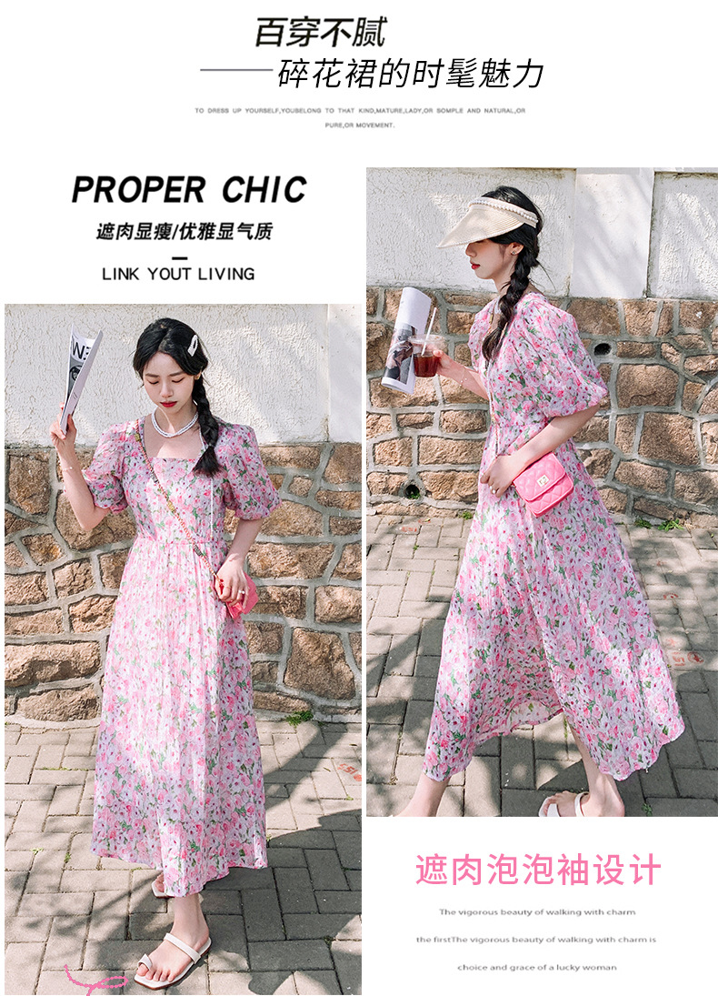 实拍方领泡泡袖碎花连衣裙女2023年夏新款显瘦法式茶歇气质长裙子