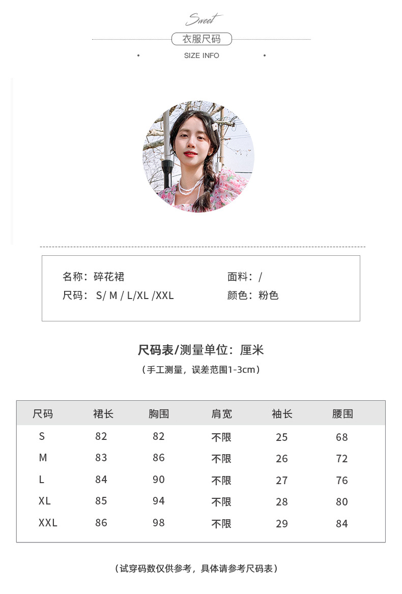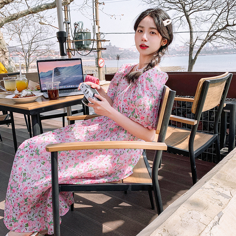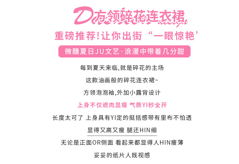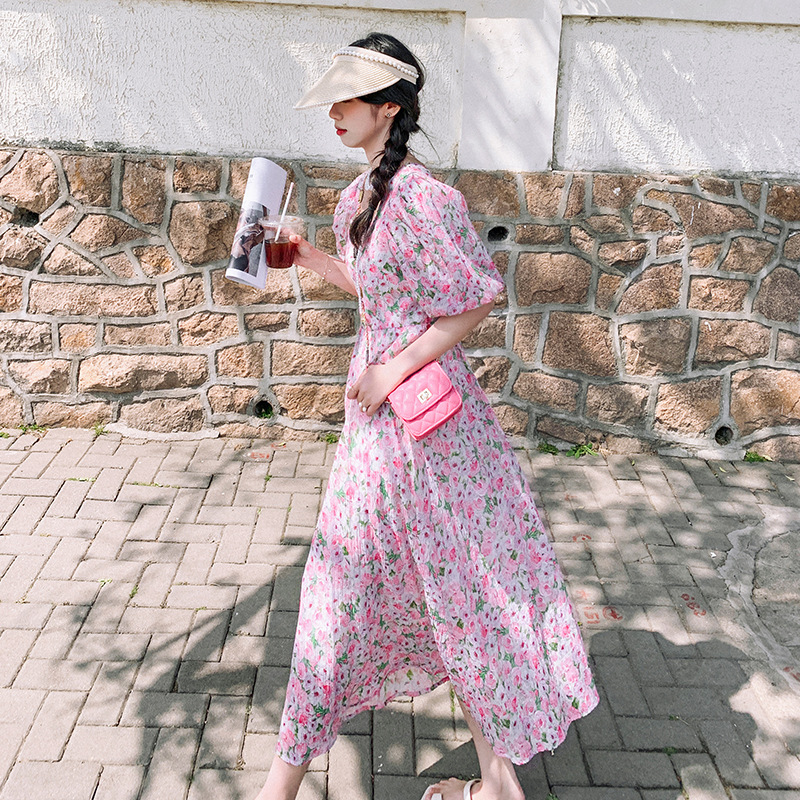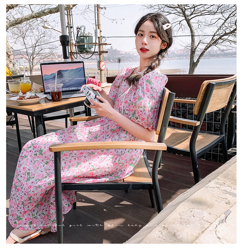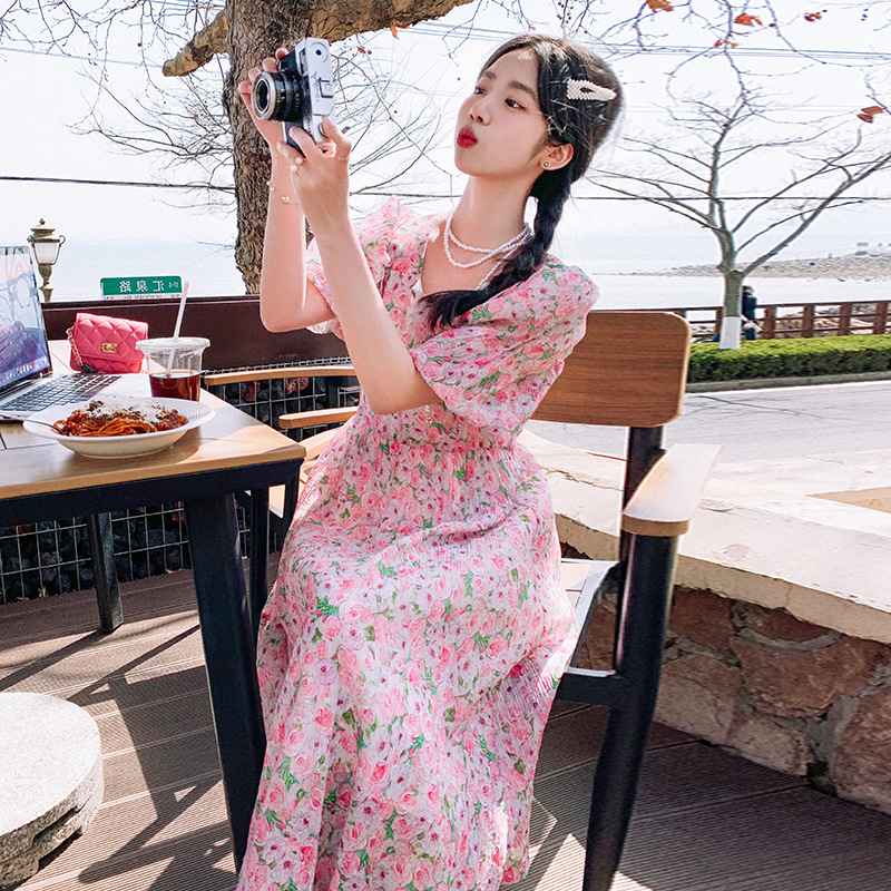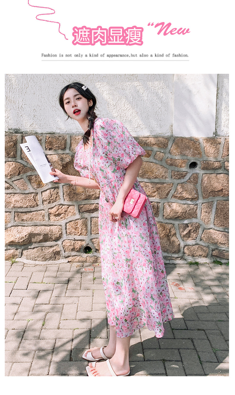 实拍方领泡泡袖碎花连衣裙女2023年夏新款显瘦法式茶歇气质长裙子