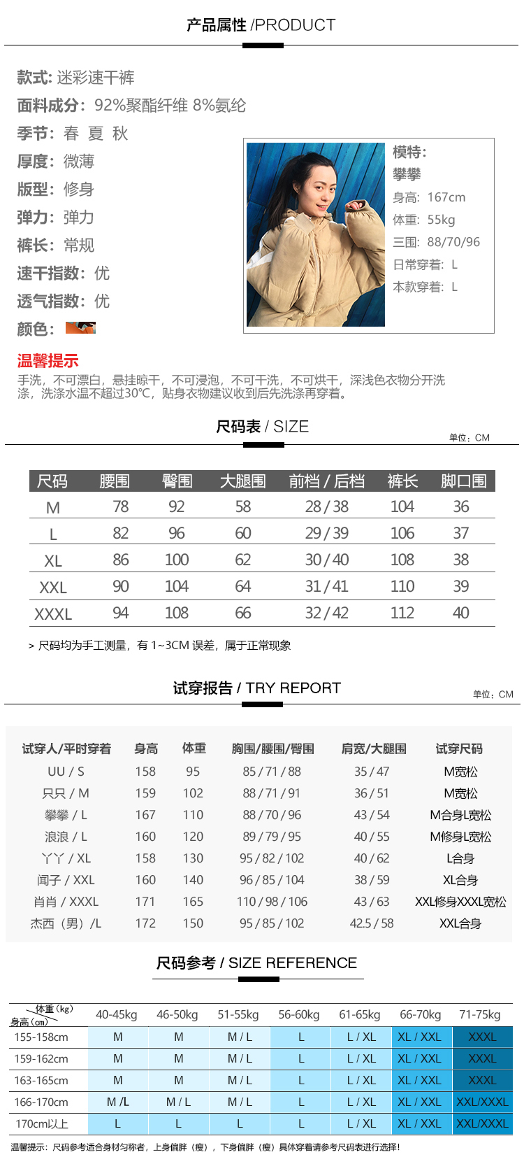 备注: .裤子因为是迷彩印花的 所以每条裤子迷彩花型的位置都会有差异,不会每条都一样的哦!