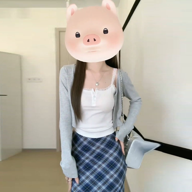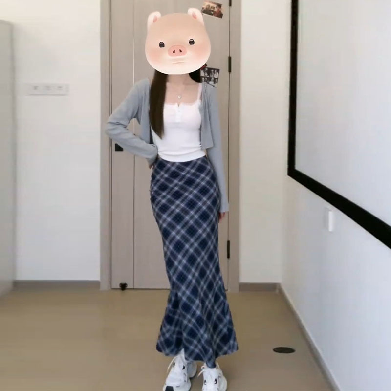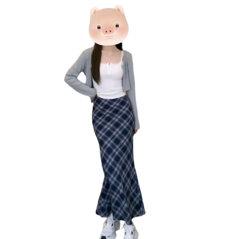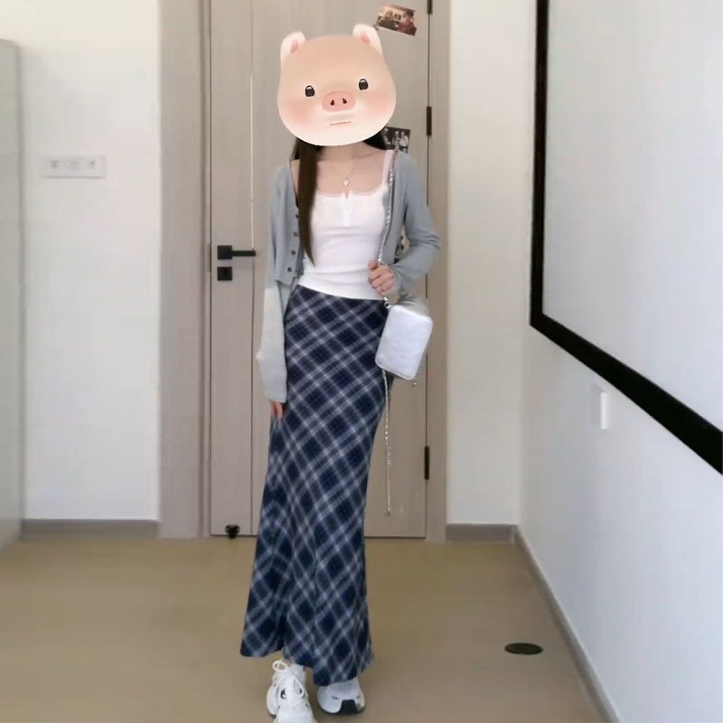 秋季開衫吊帶藍色格子包臀半身洋裝子女夏裝搭配一整套時尚長裙