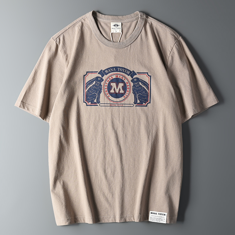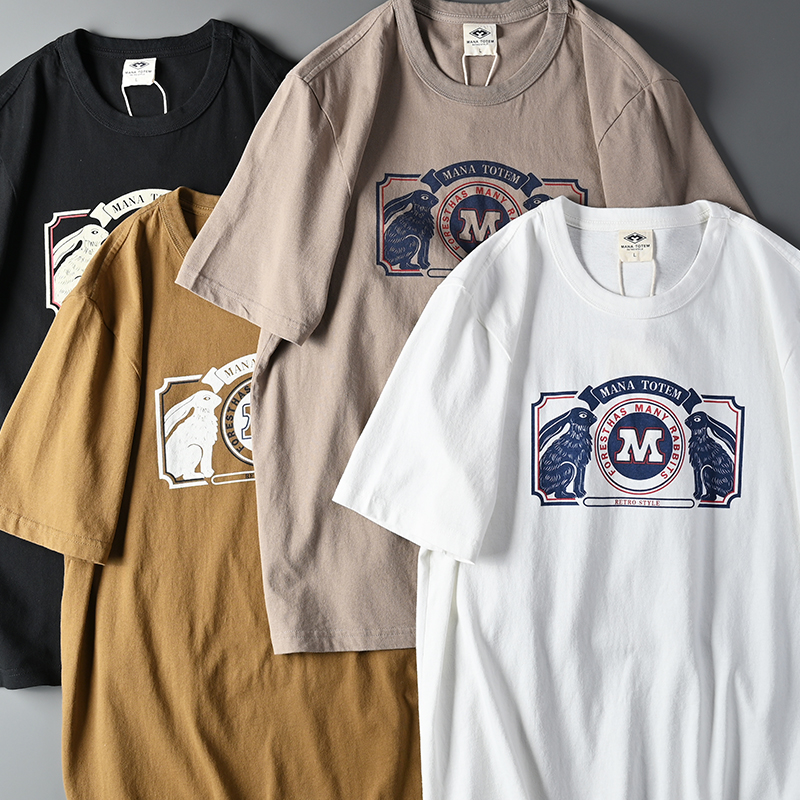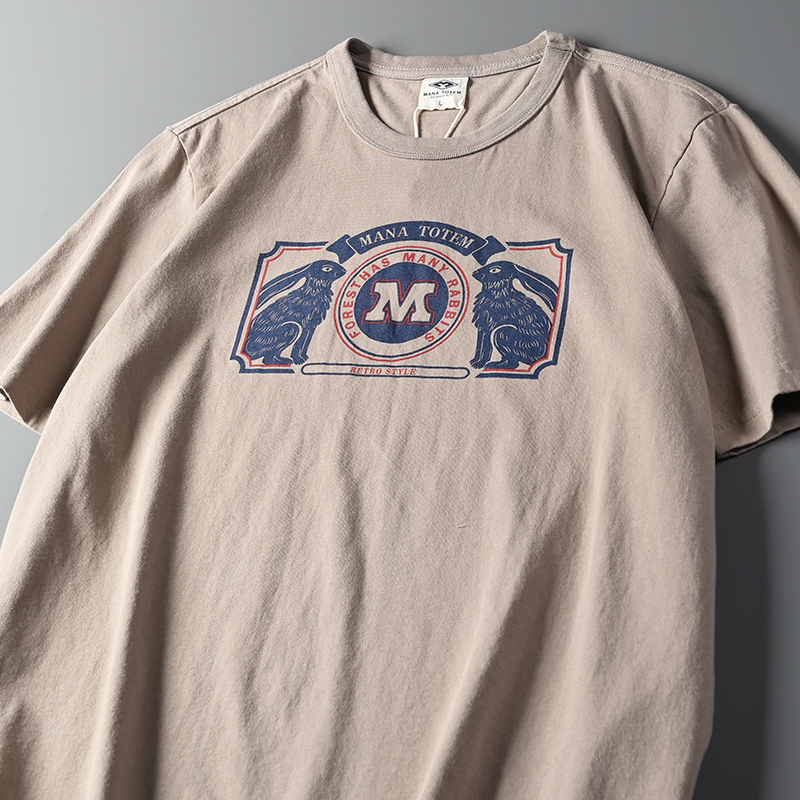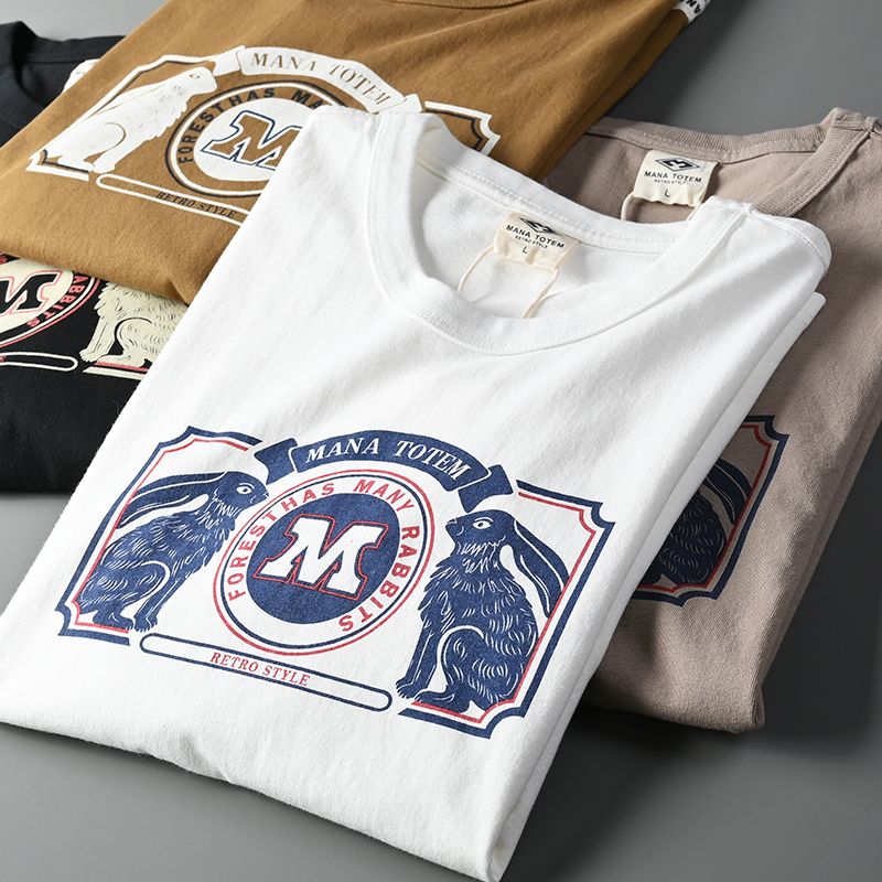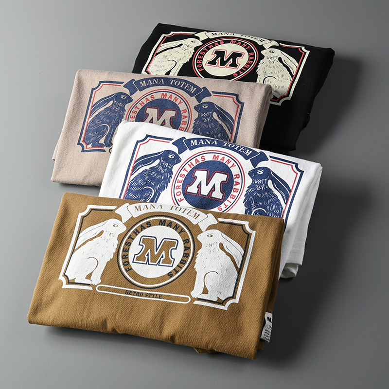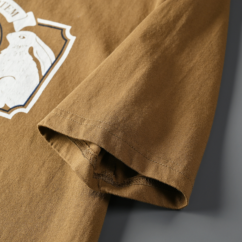 外貿原單客供水洗磨毛棉夏季男士撞色兔子字母印花短袖T恤打底衫