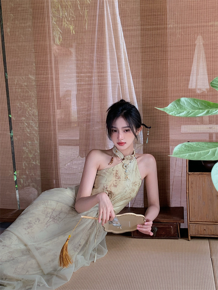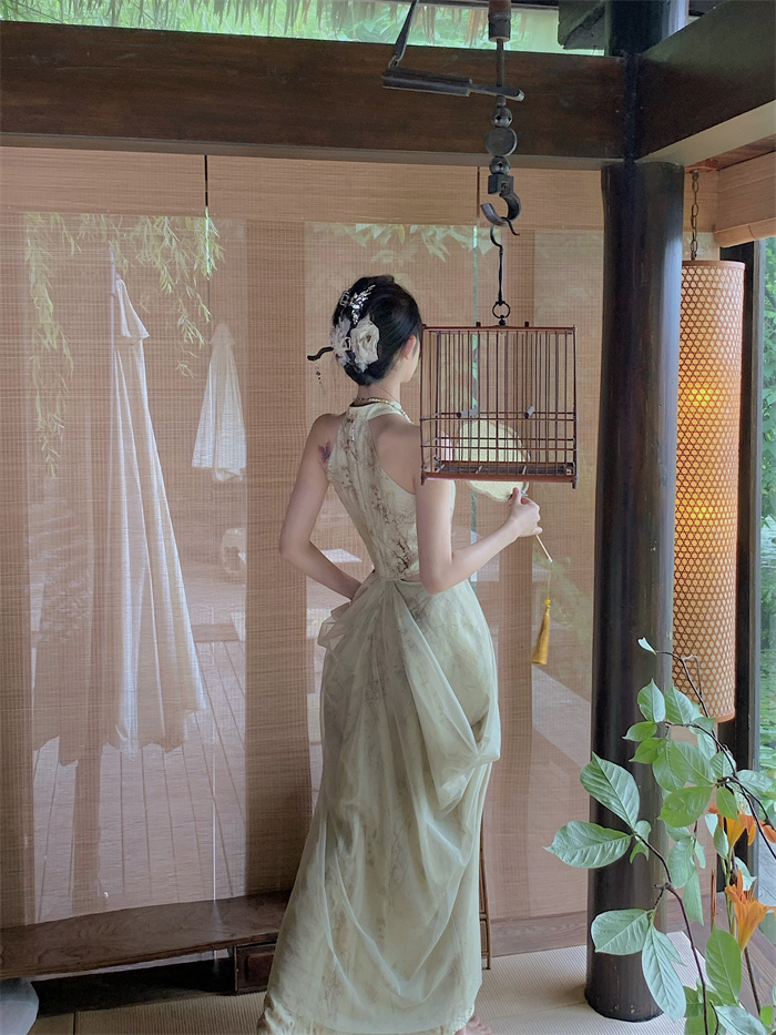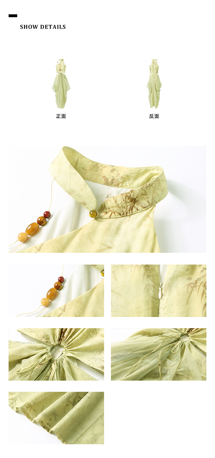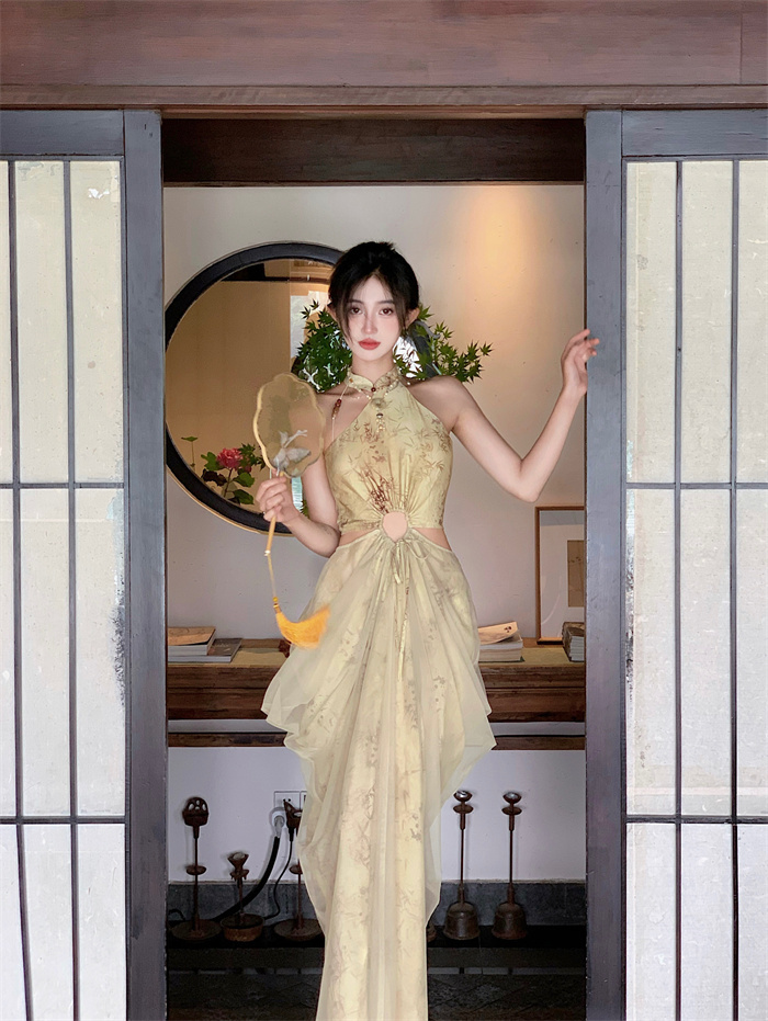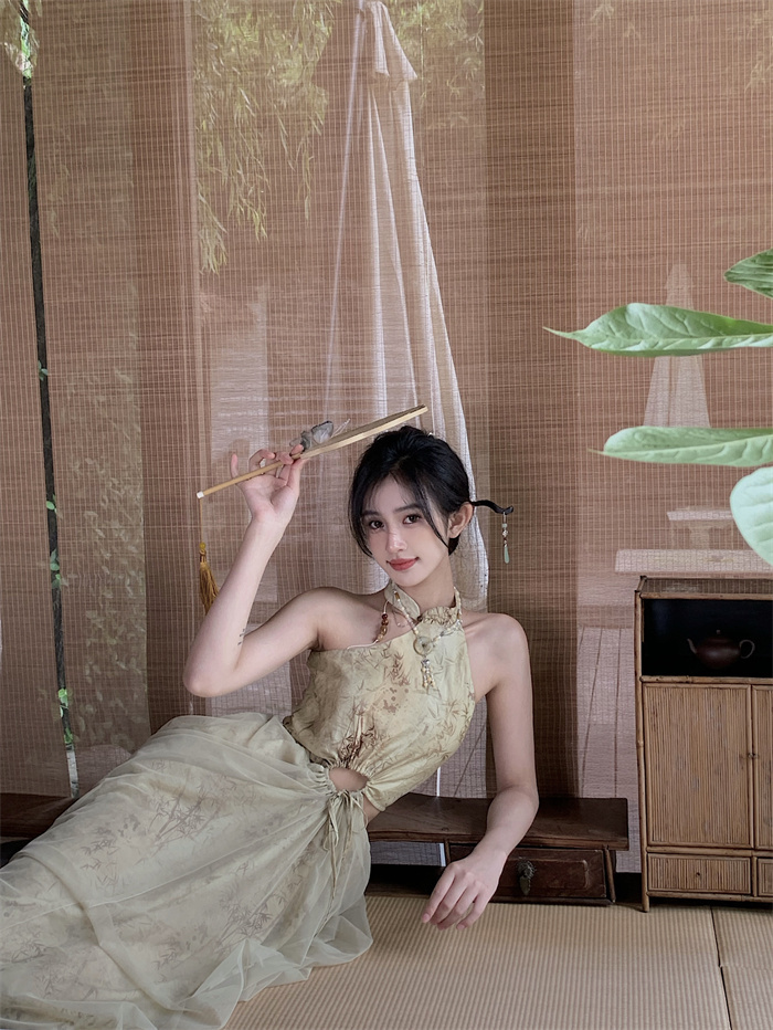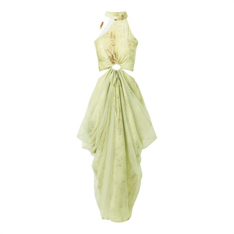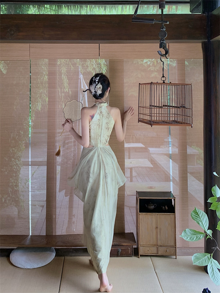 [WALKINDARK]竹葉青·清冷新中式網紗竹子暈染鏤空掛頸洋裝夏女