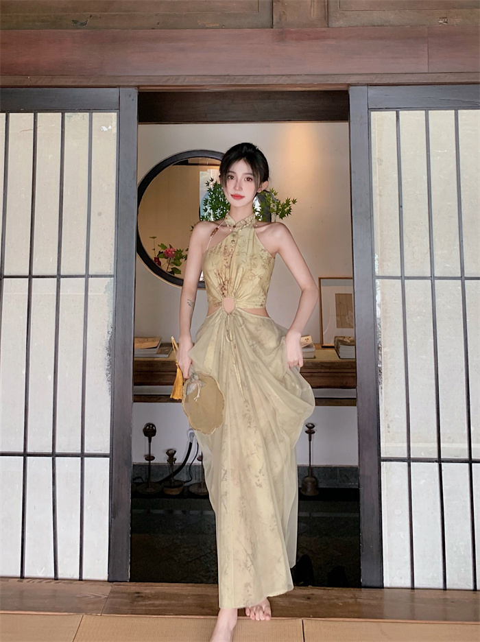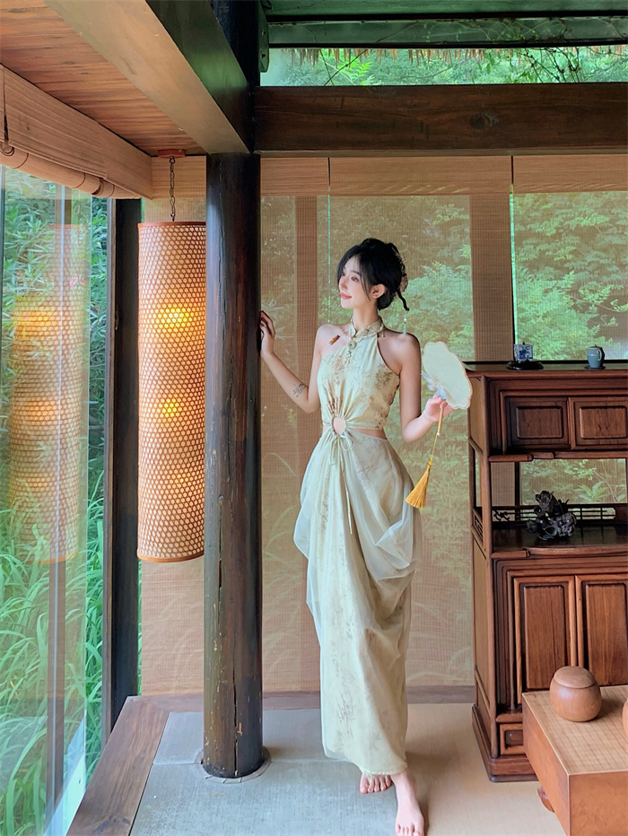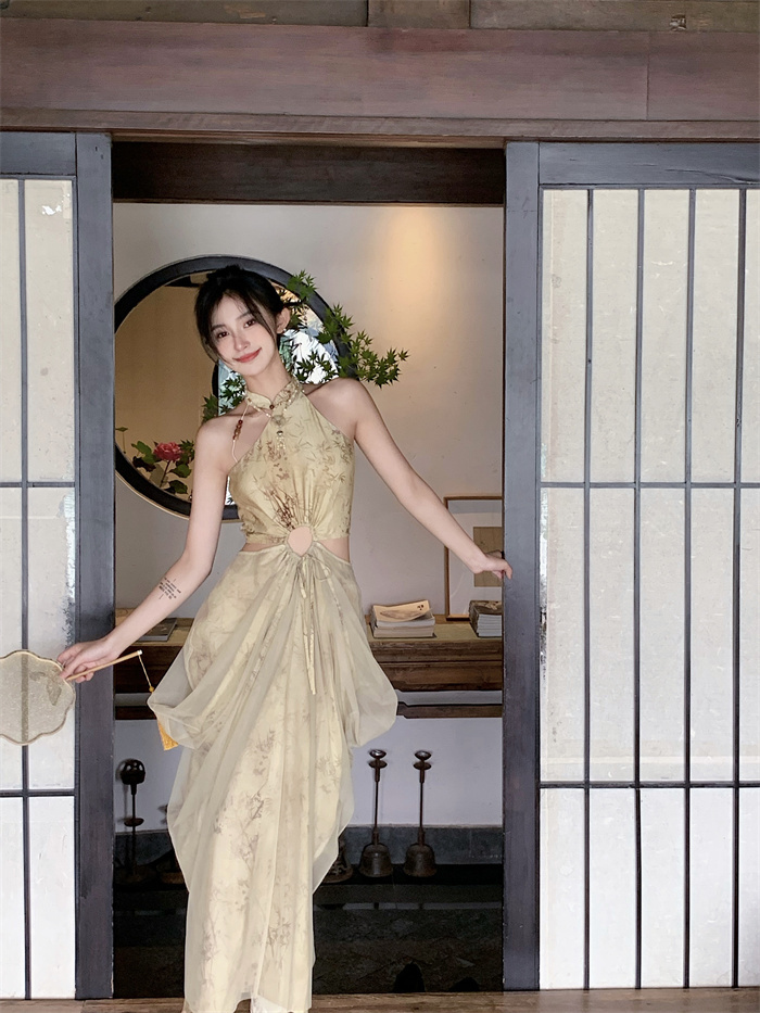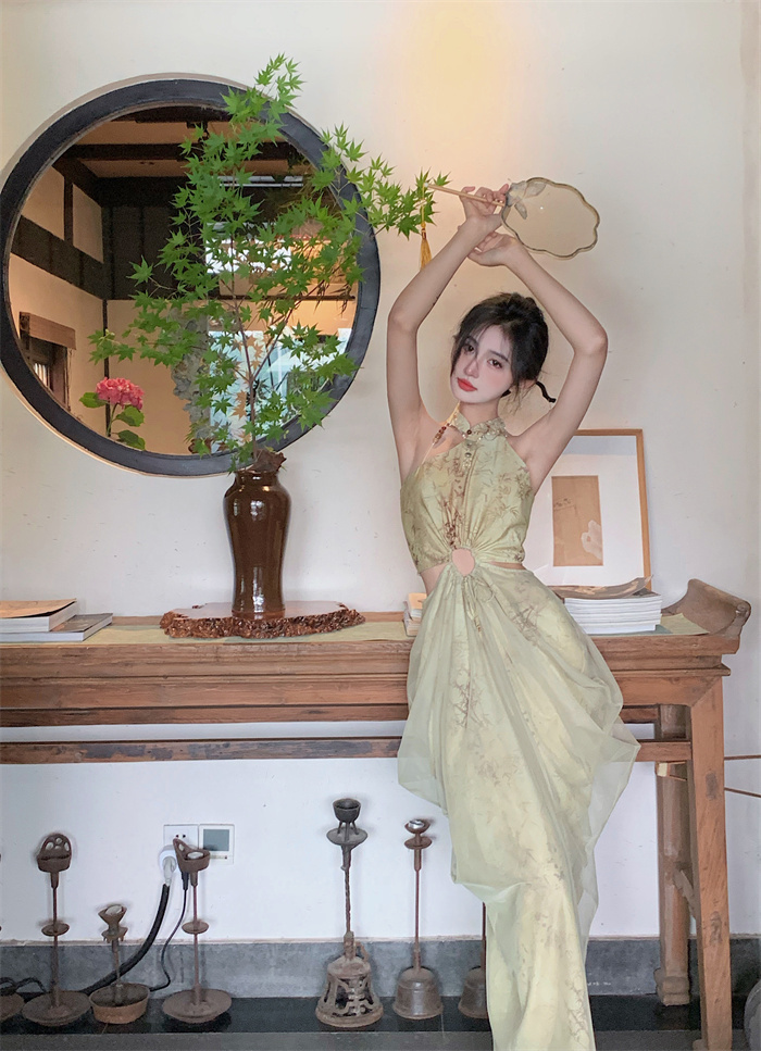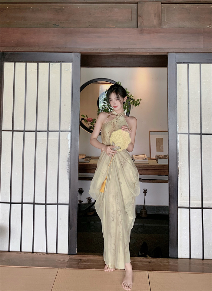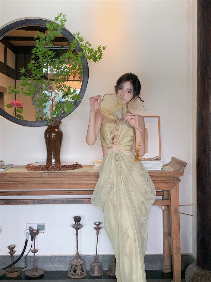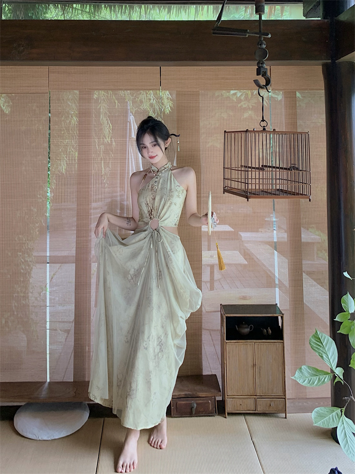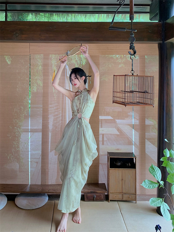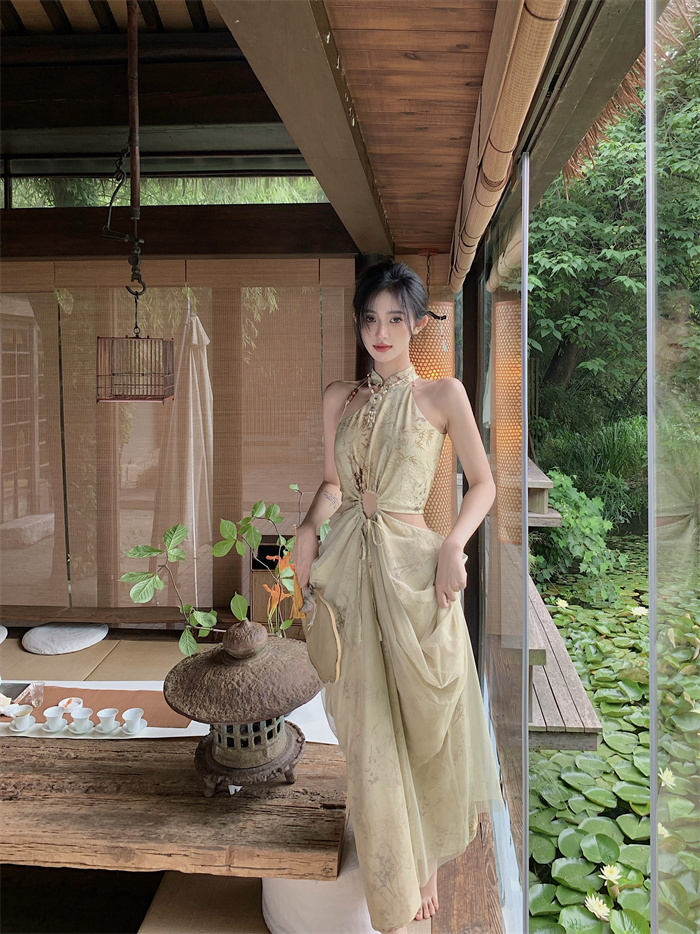 [WALKINDARK]竹葉青·清冷新中式網紗竹子暈染鏤空掛頸洋裝夏女