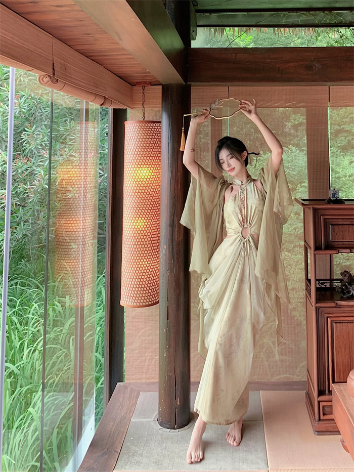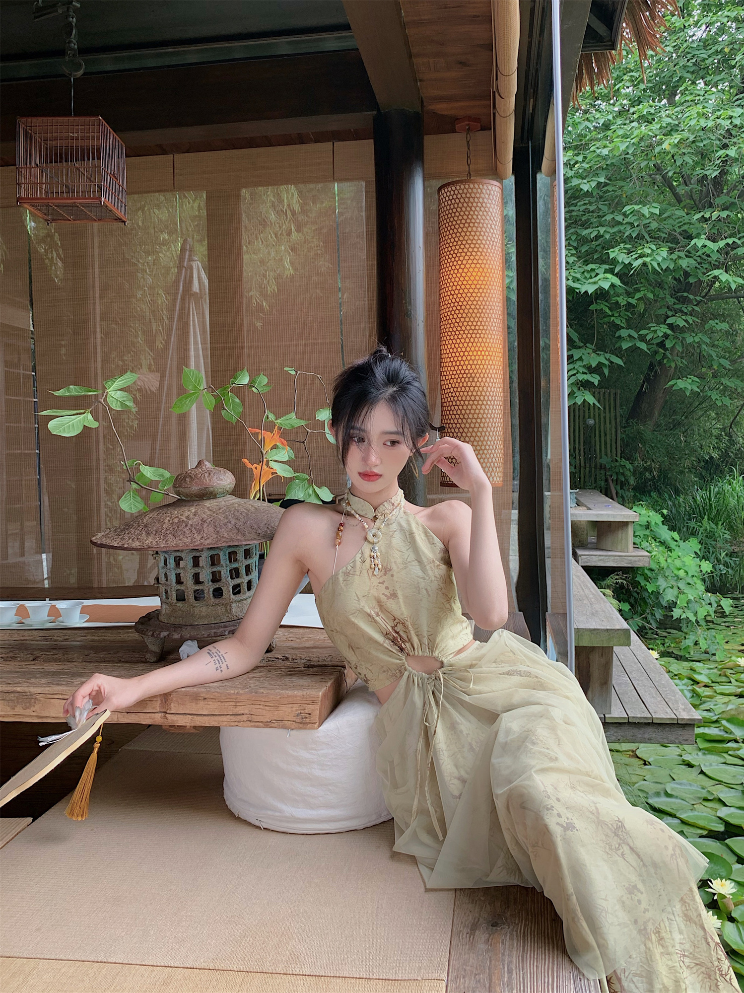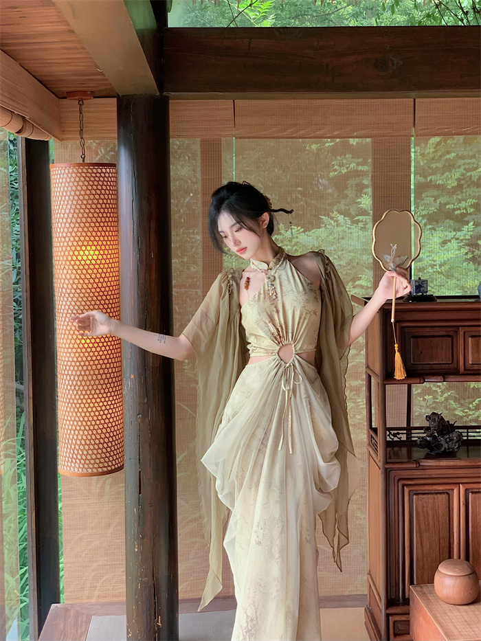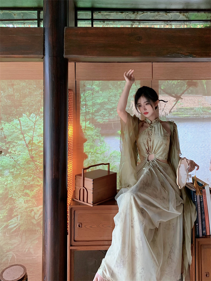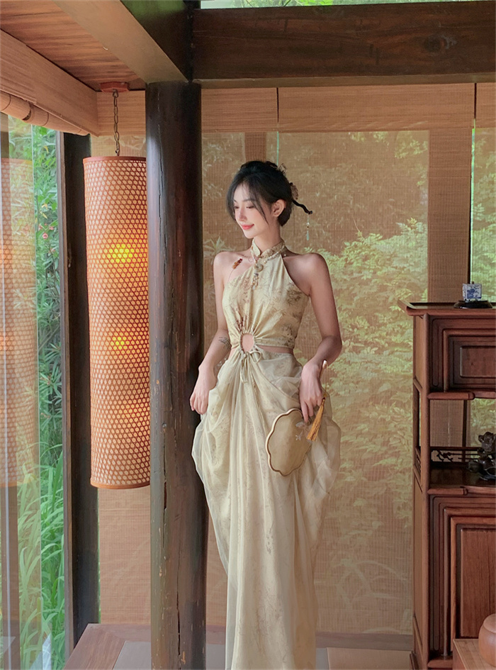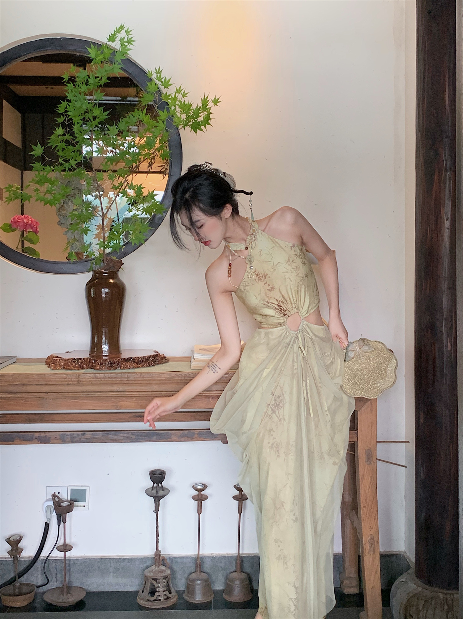 [WALKINDARK]竹葉青·清冷新中式網紗竹子暈染鏤空掛頸洋裝夏女