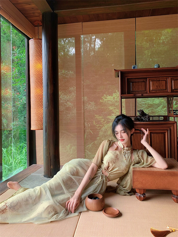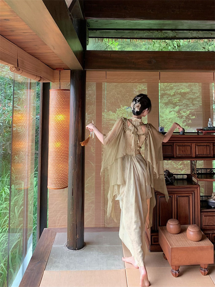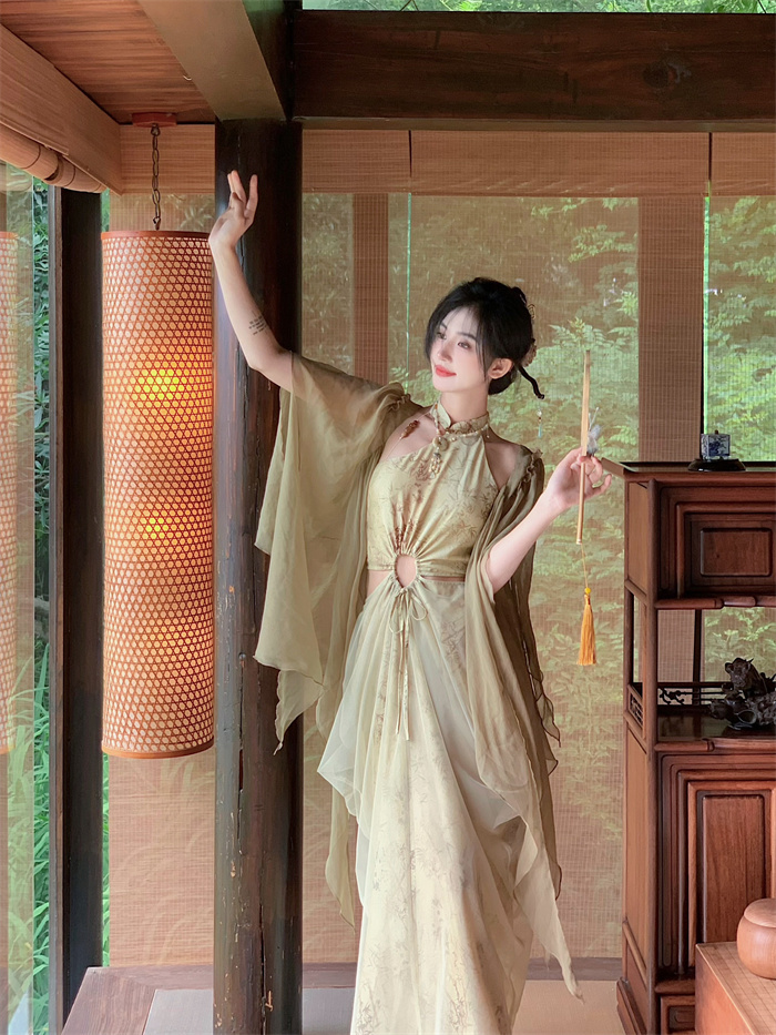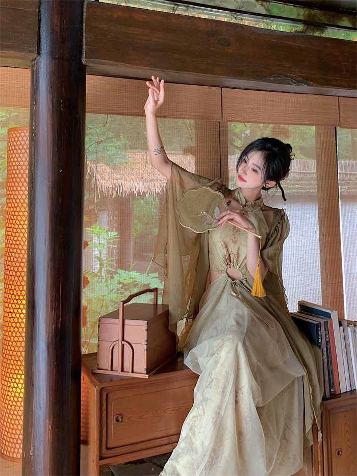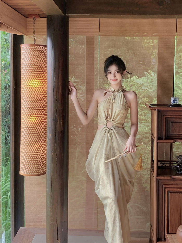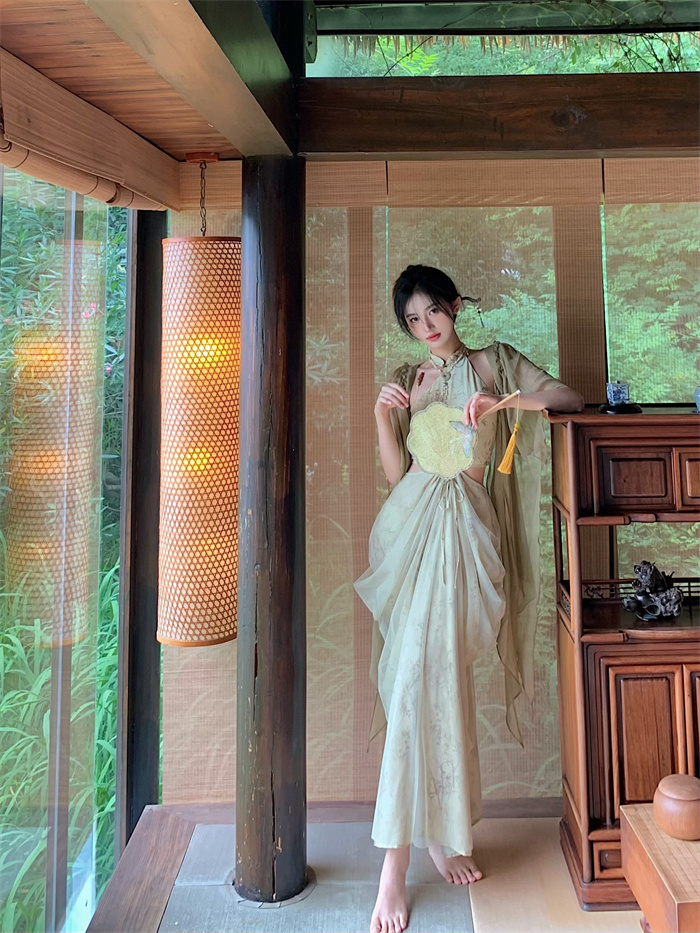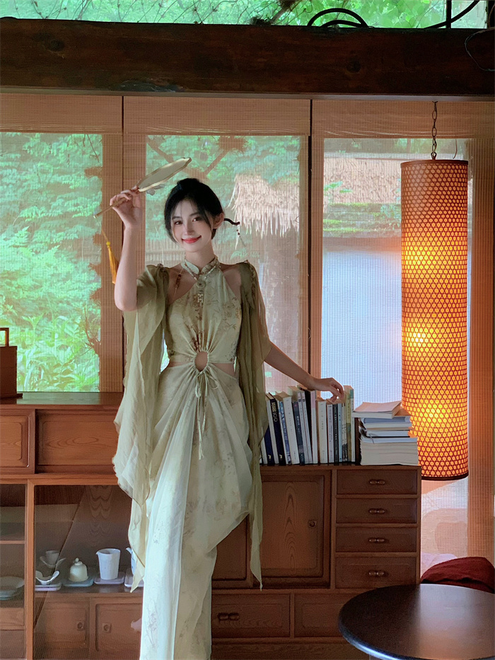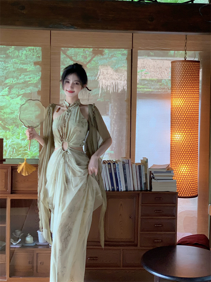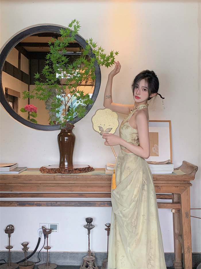 [WALKINDARK]竹葉青·清冷新中式網紗竹子暈染鏤空掛頸洋裝夏女
