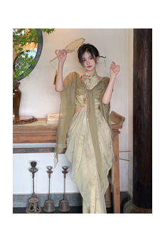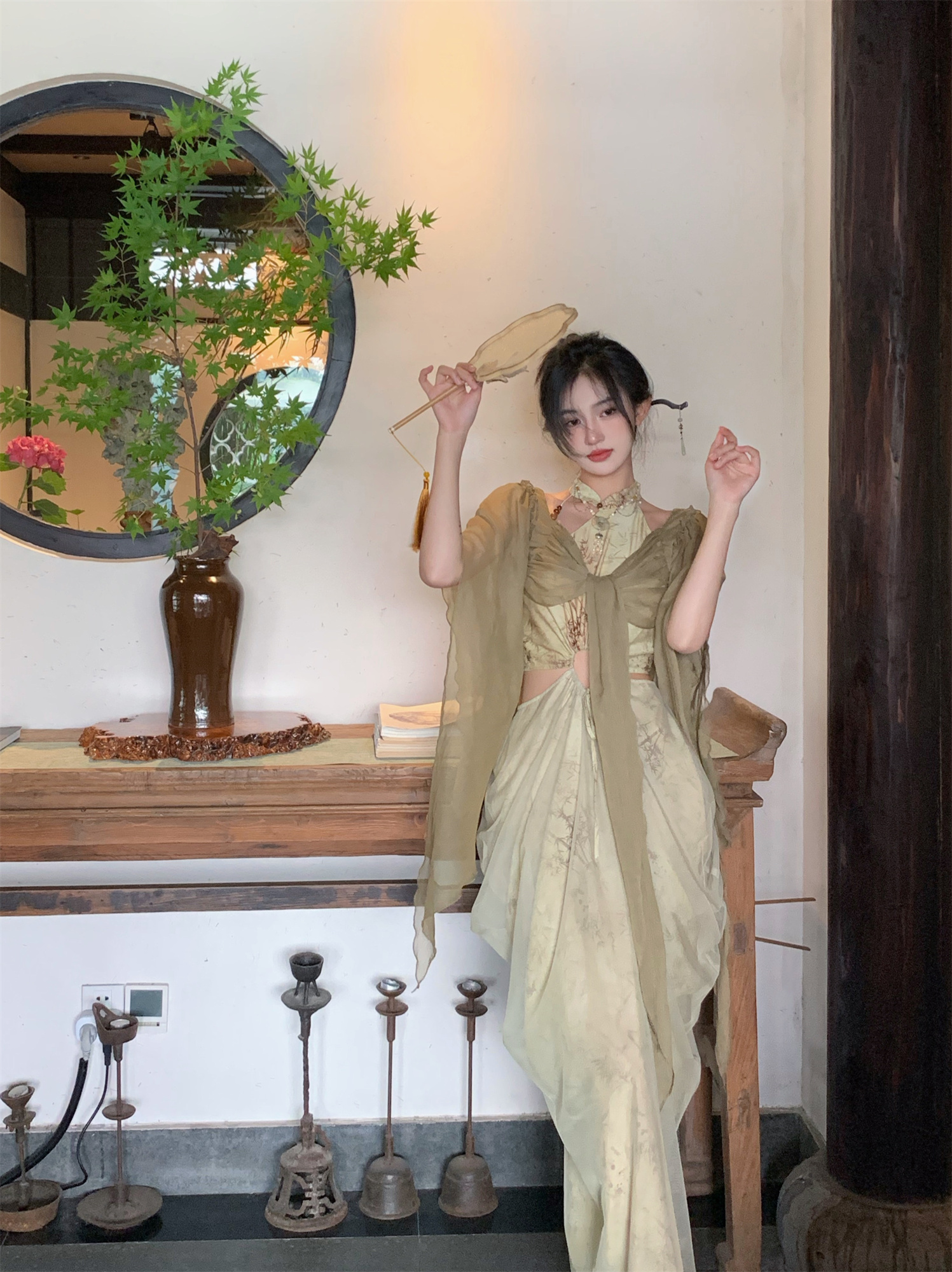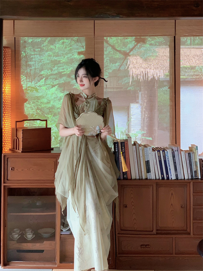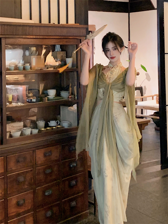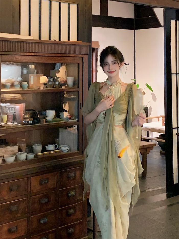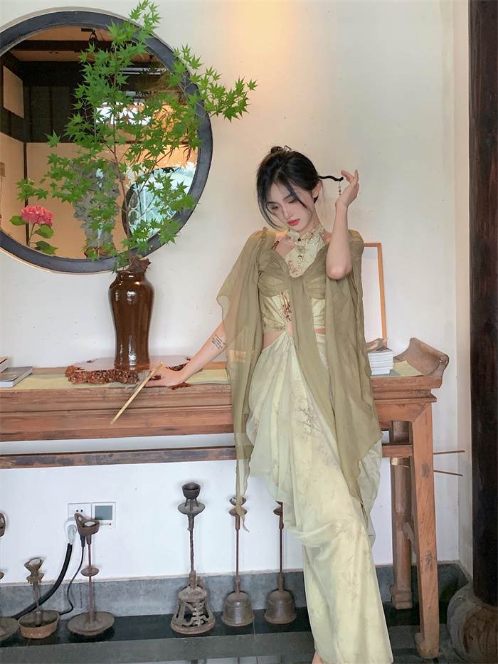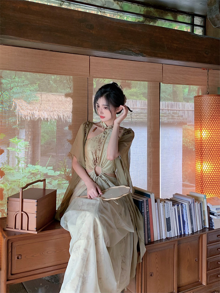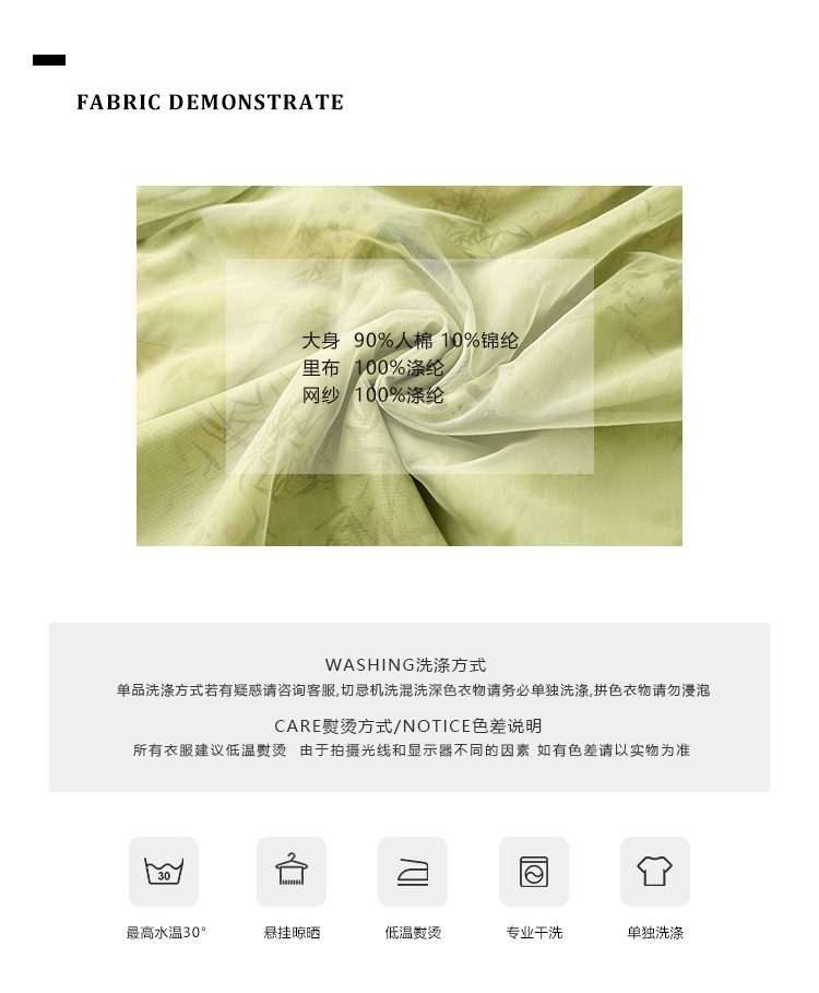 [WALKINDARK]竹葉青·清冷新中式網紗竹子暈染鏤空掛頸洋裝夏女
