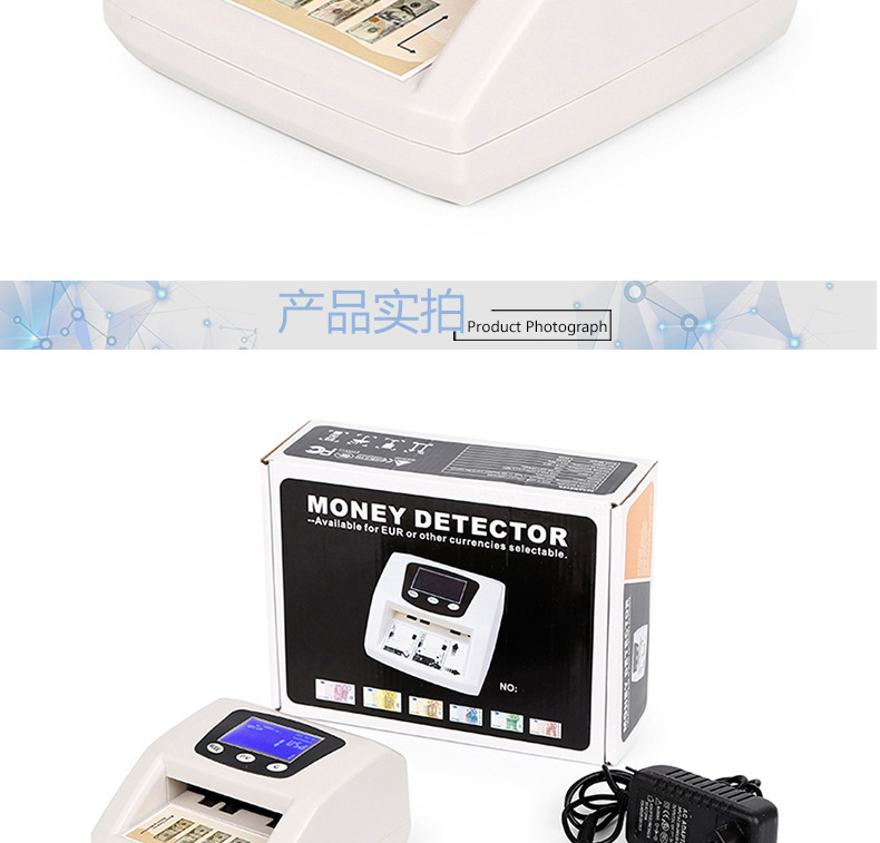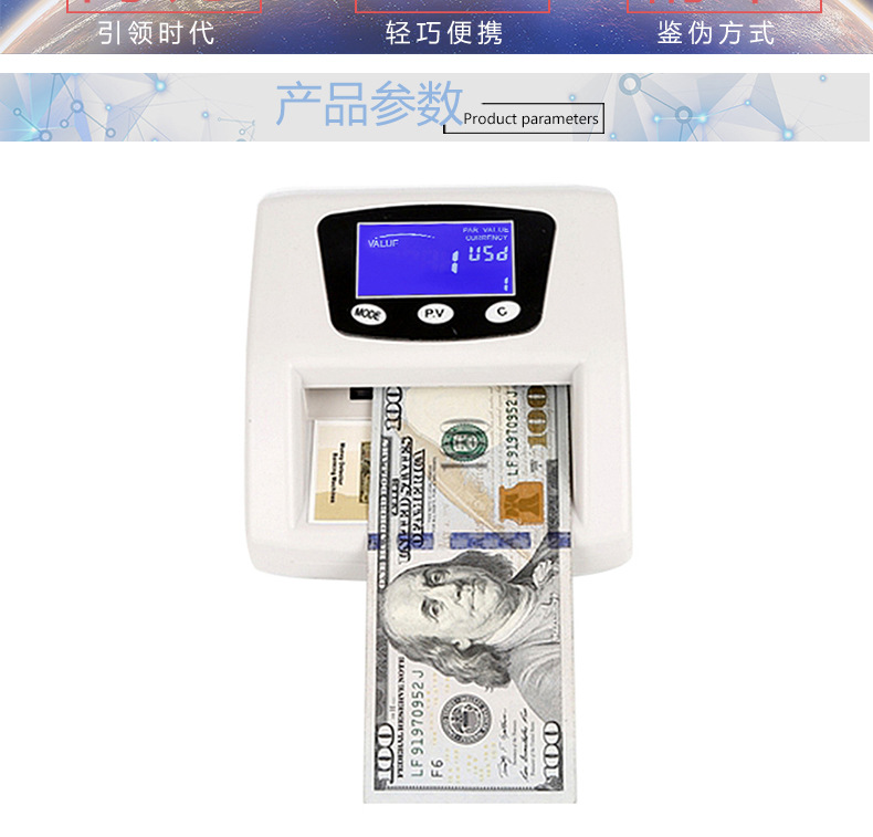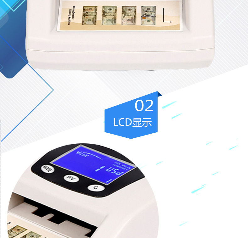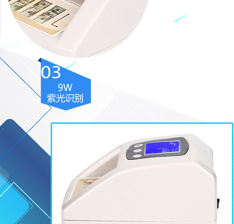 欧元面额识别验钞机: 能快速鉴别欧元钱币真假,识别累计欧元面额,LCD蓝屏清晰显示张数、面额,金额累加等功能,遇到假钱报警自动退回。本机操作简单,小巧实用,携带方便。