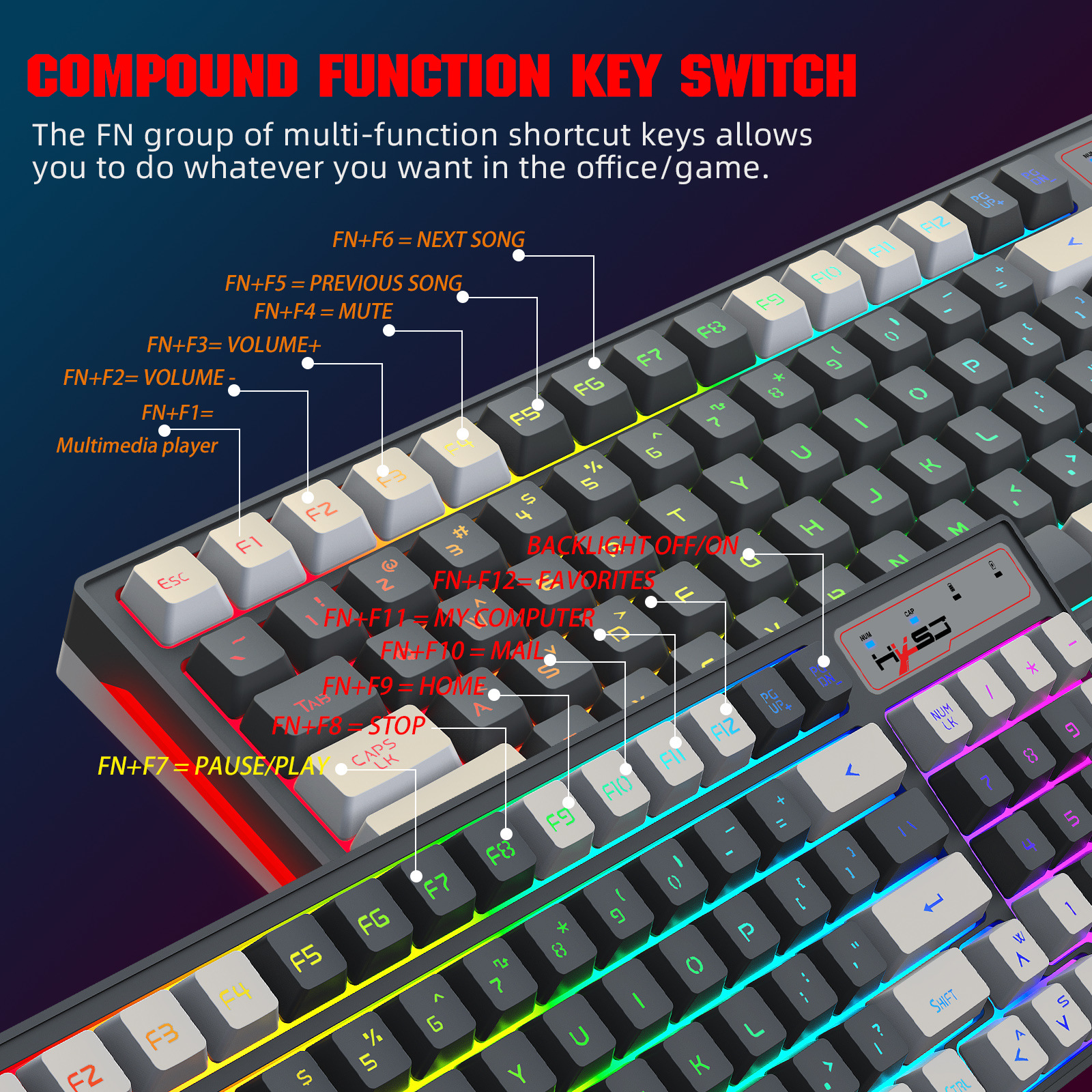 (5) Backlight switch control: FN+PGDN- is to turn off or turn on the backlight.