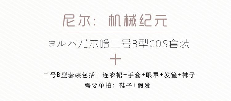 颜色 2b姐衣服全套,2B姐假发(均码送发网),2B姐鞋子(拍下留言尺码!!),2B姐木质剑,2B姐金属剑,2B姐套餐一(衣服+假发),2B姐套餐二(衣服+假发+鞋子),2B姐套餐三(衣服+假发+鞋子+木质剑)