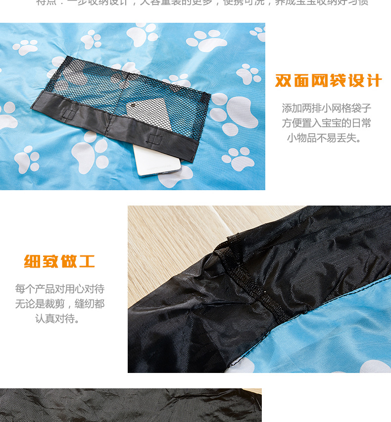 1、多功能:是收纳袋,快速收纳玩具。同时也是隔脏垫,无惧宝宝大小便,也不会弄脏玩具。