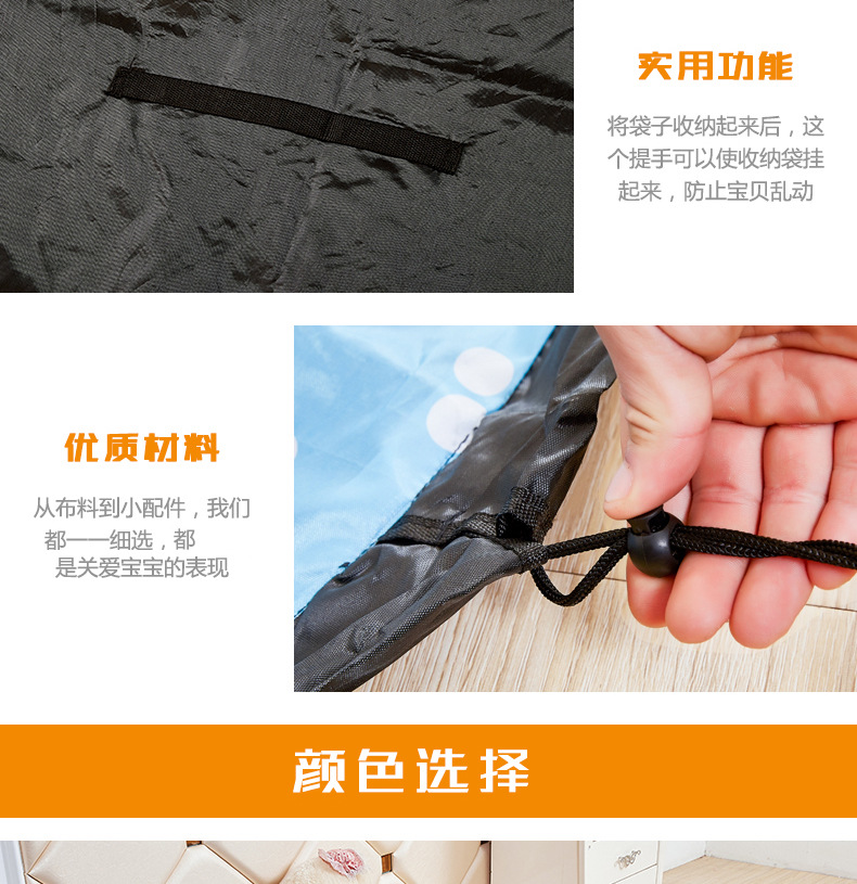 这是一款非常方便快递的玩具收纳袋,平时宝宝在玩玩具时,经常是到处乱扔,收拾起来比较麻烦也很费时间。有了这个收纳袋,可以把宝宝的玩具都放进去,松开绳子摊开立马全部呈现出来,收纳袋也同时变为隔脏地垫,不会弄脏宝宝和玩具。不玩时拉紧绳子可全部收拾起来,非常的方便。