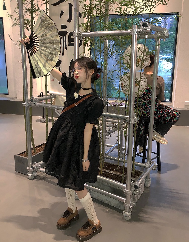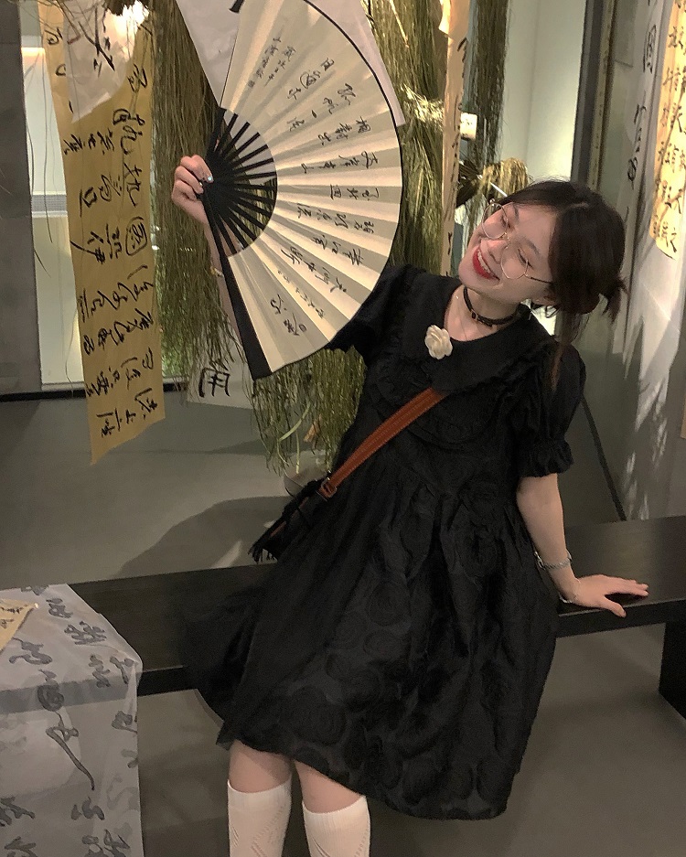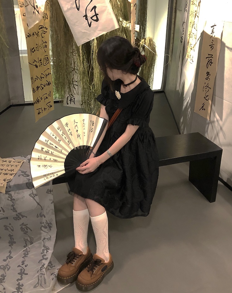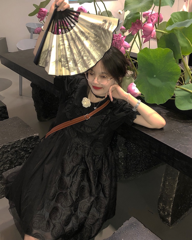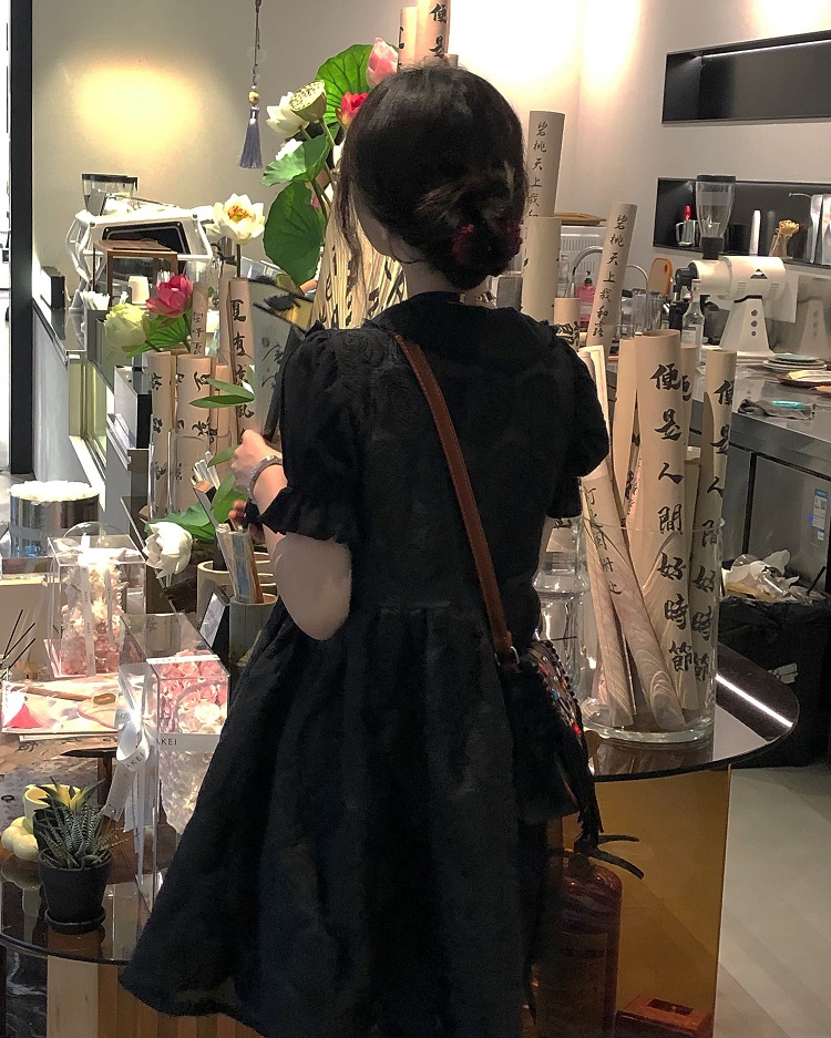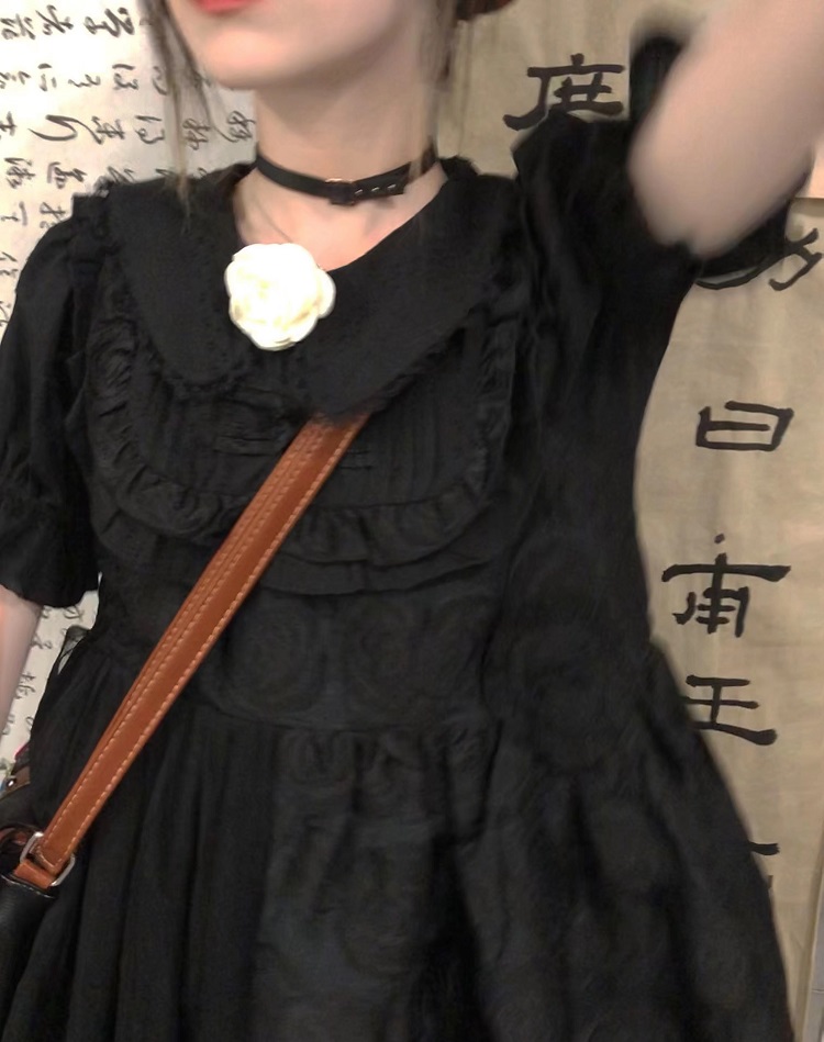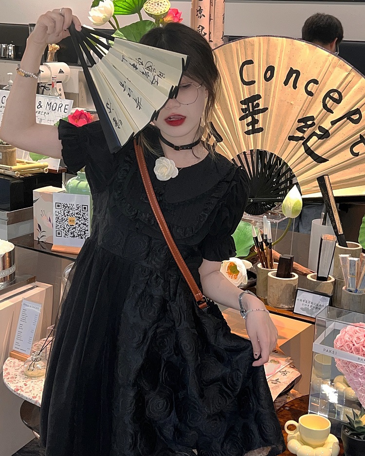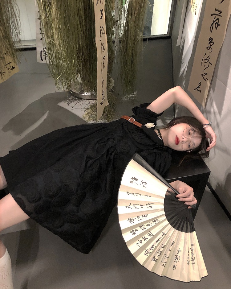 【ALITTLE 亂糟糟】[古香黑魔法]重工玫瑰提花拼接旗盤扣洋裝女