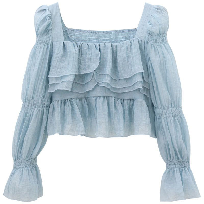 抖音網紅同款藍色小清新荷葉邊喇叭袖襯衫女娃娃衫溫柔風短款小衫