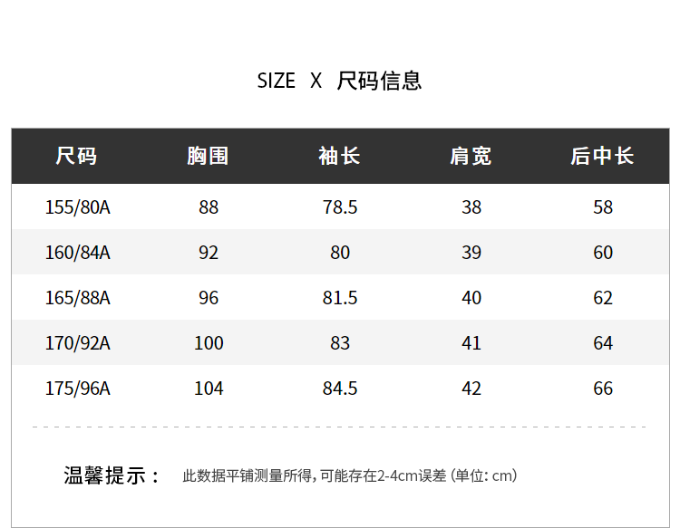 尺碼 155/80A 160/84A 165/88A 170/92A 175/96A