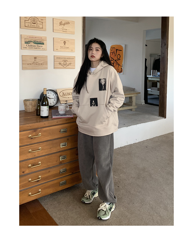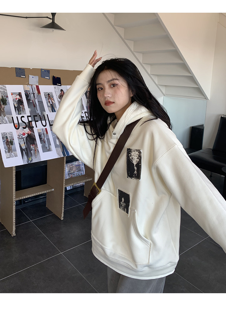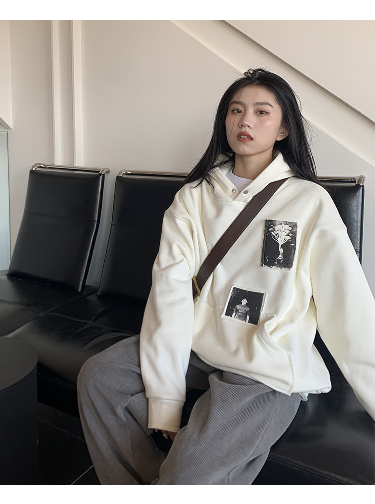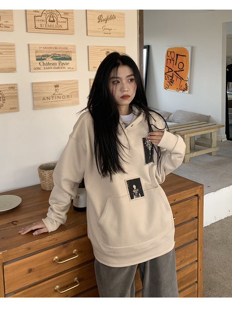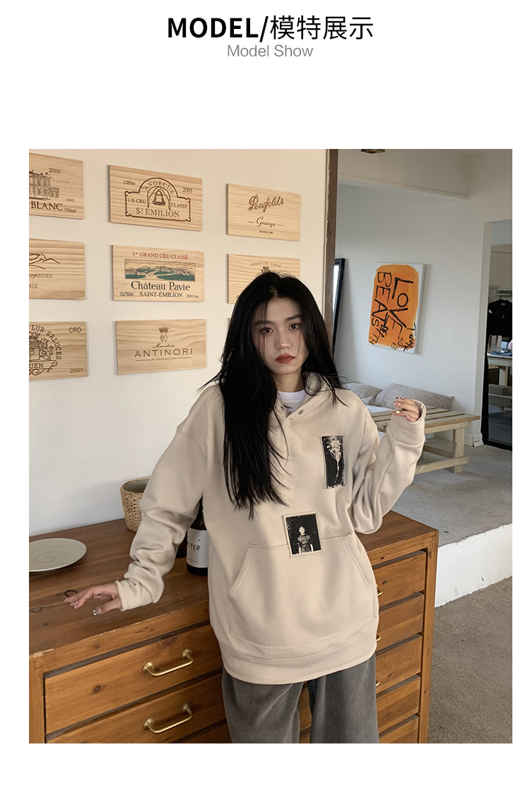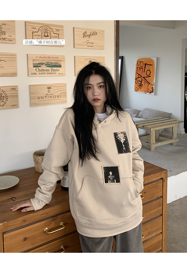 橘子樹在哪兒照片拼貼加絨連帽運動衫女秋冬寬鬆中性風復古杏色帽衫