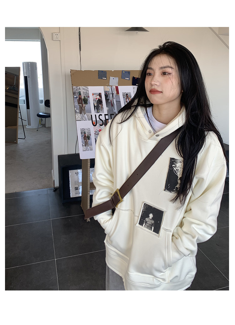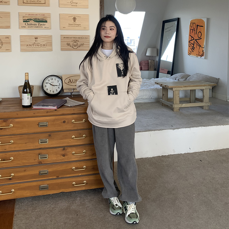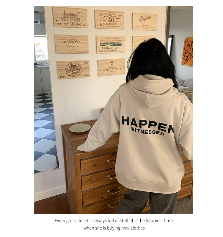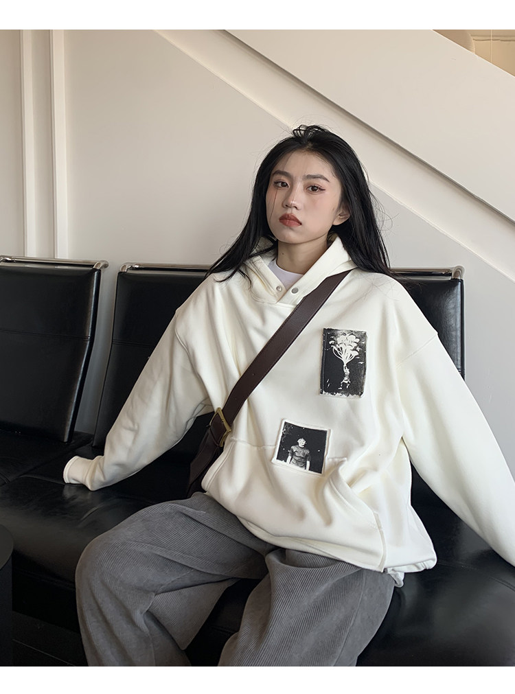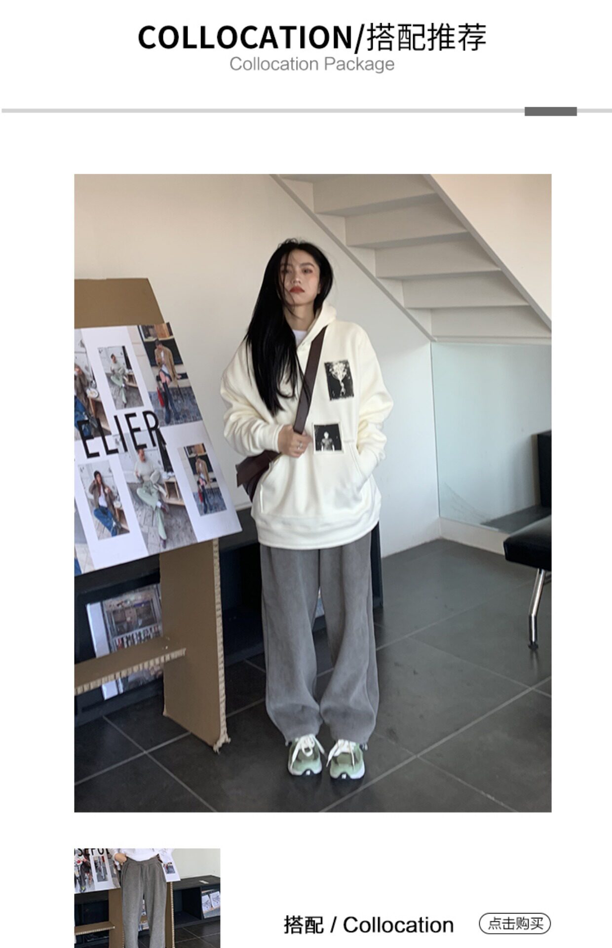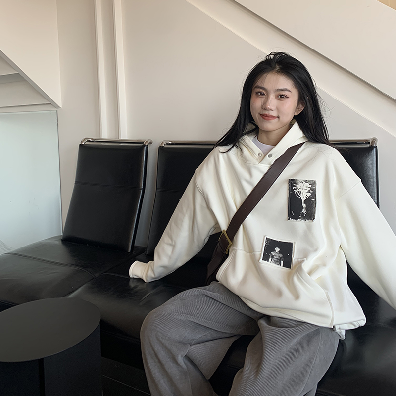 橘子樹在哪兒照片拼貼加絨連帽運動衫女秋冬寬鬆中性風復古杏色帽衫