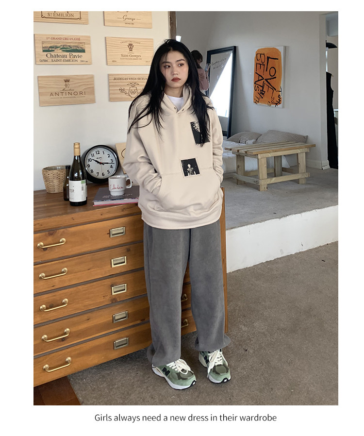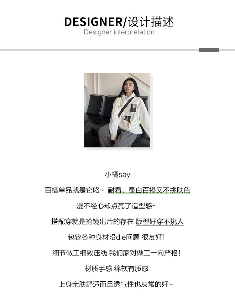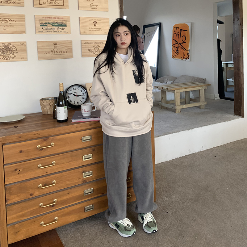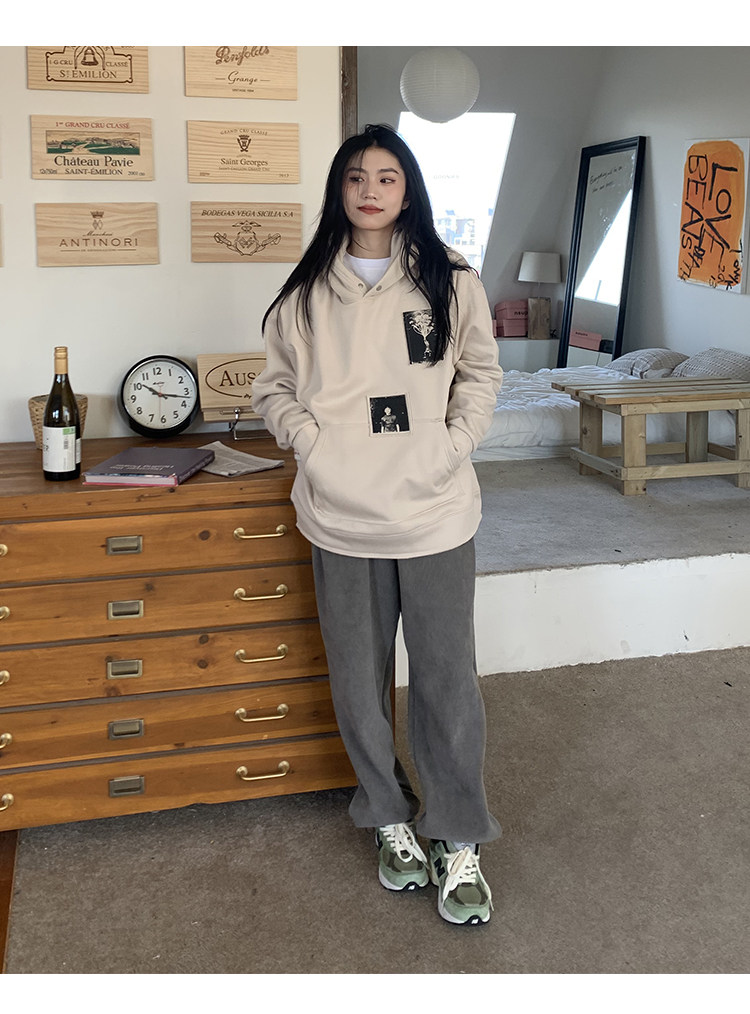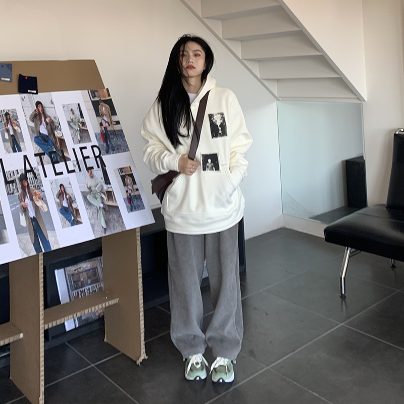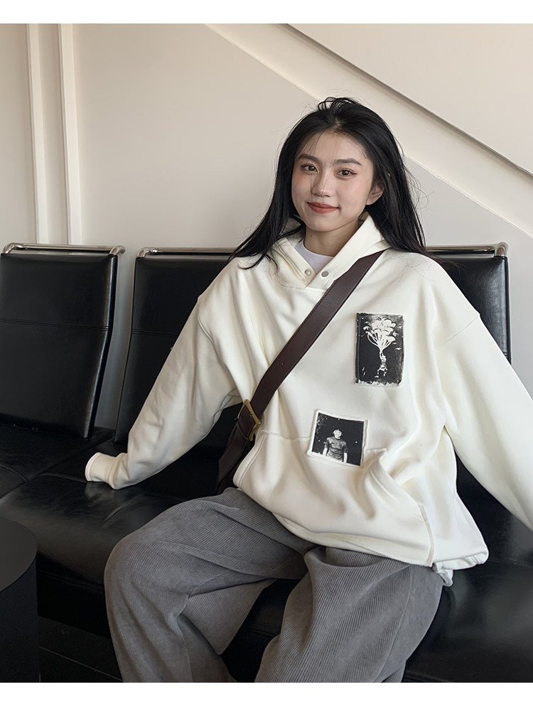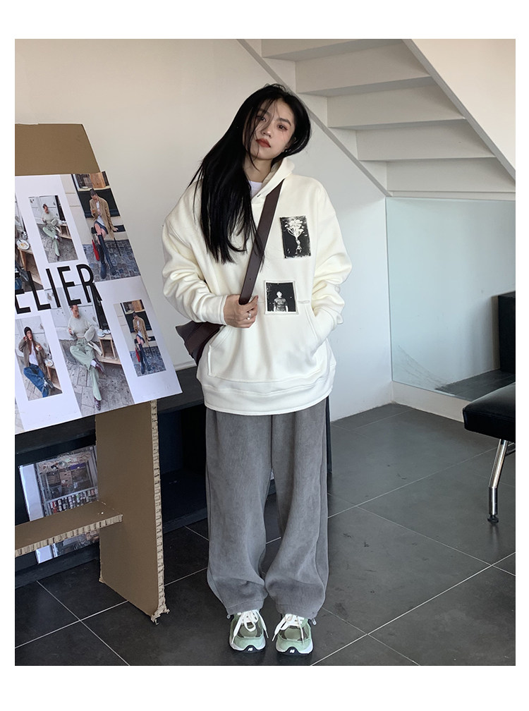 橘子樹在哪兒照片拼貼加絨連帽運動衫女秋冬寬鬆中性風復古杏色帽衫