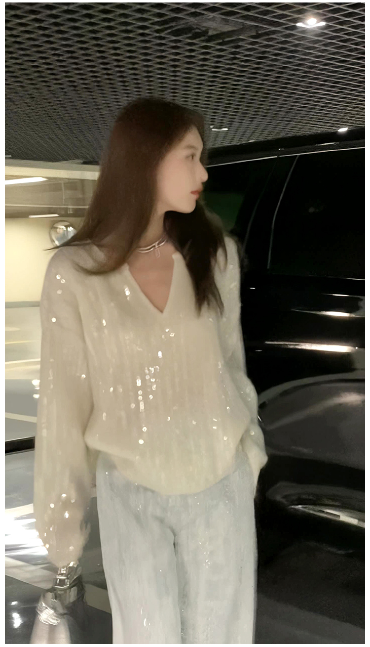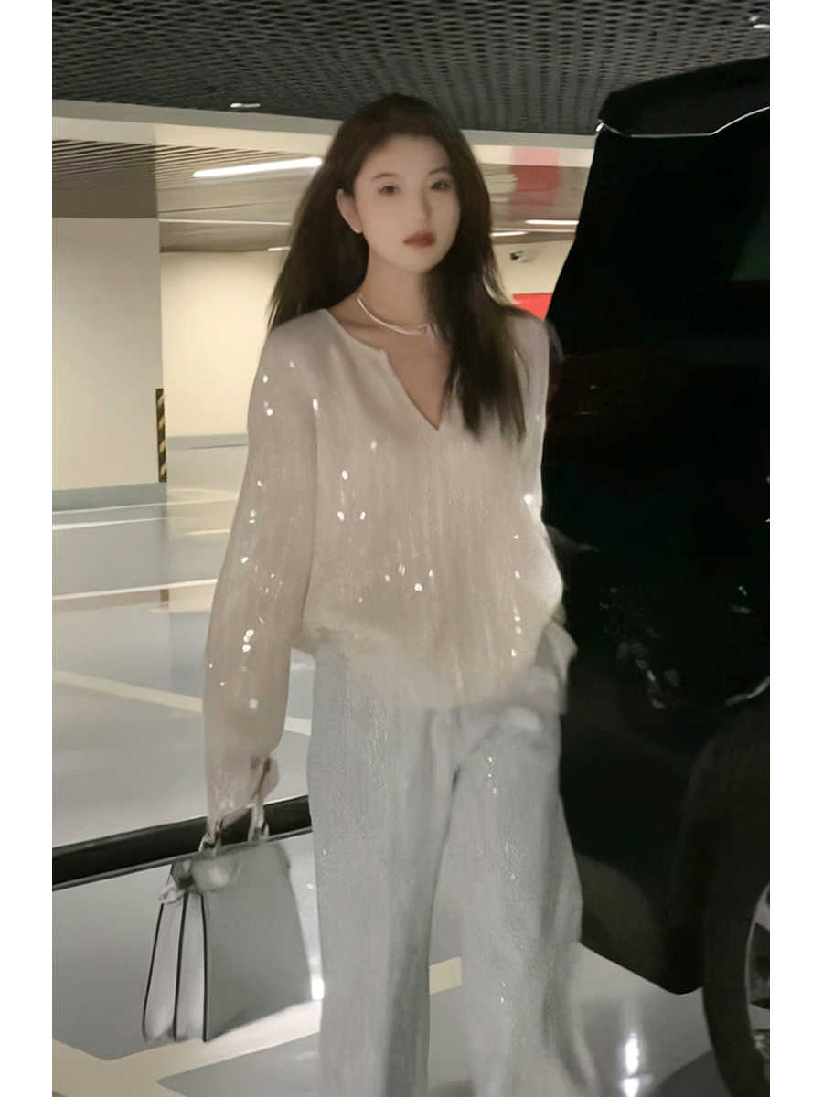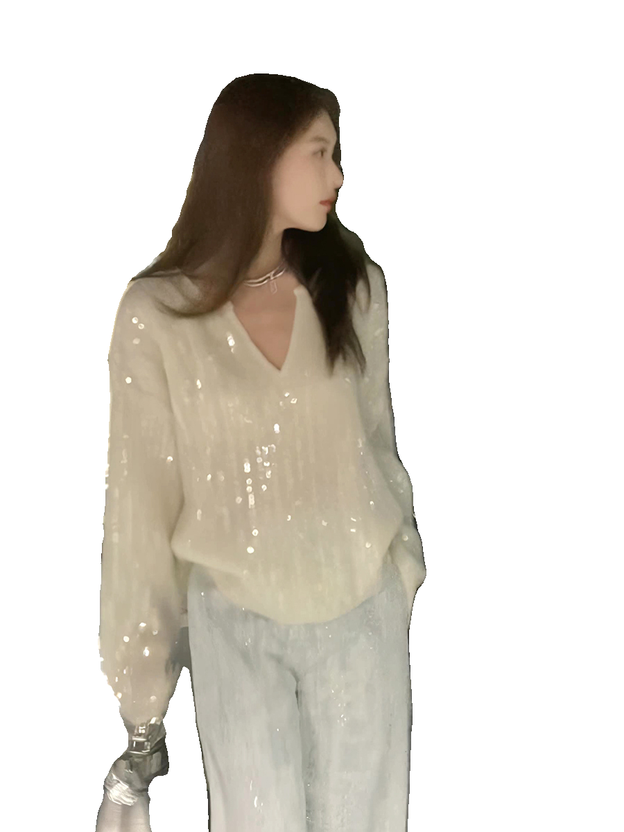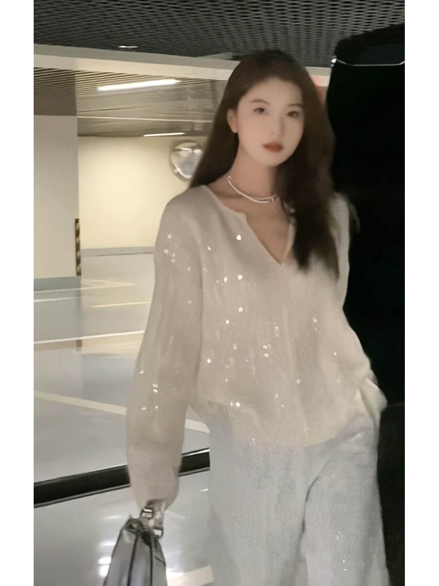 2023秋季新款設計感重工亮片上衣女V領寬鬆百搭長袖白色針織毛衣
