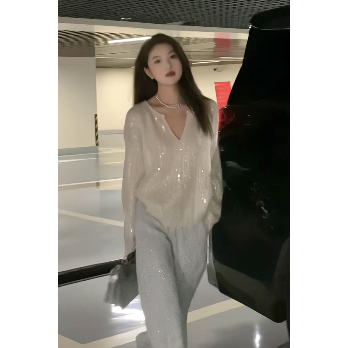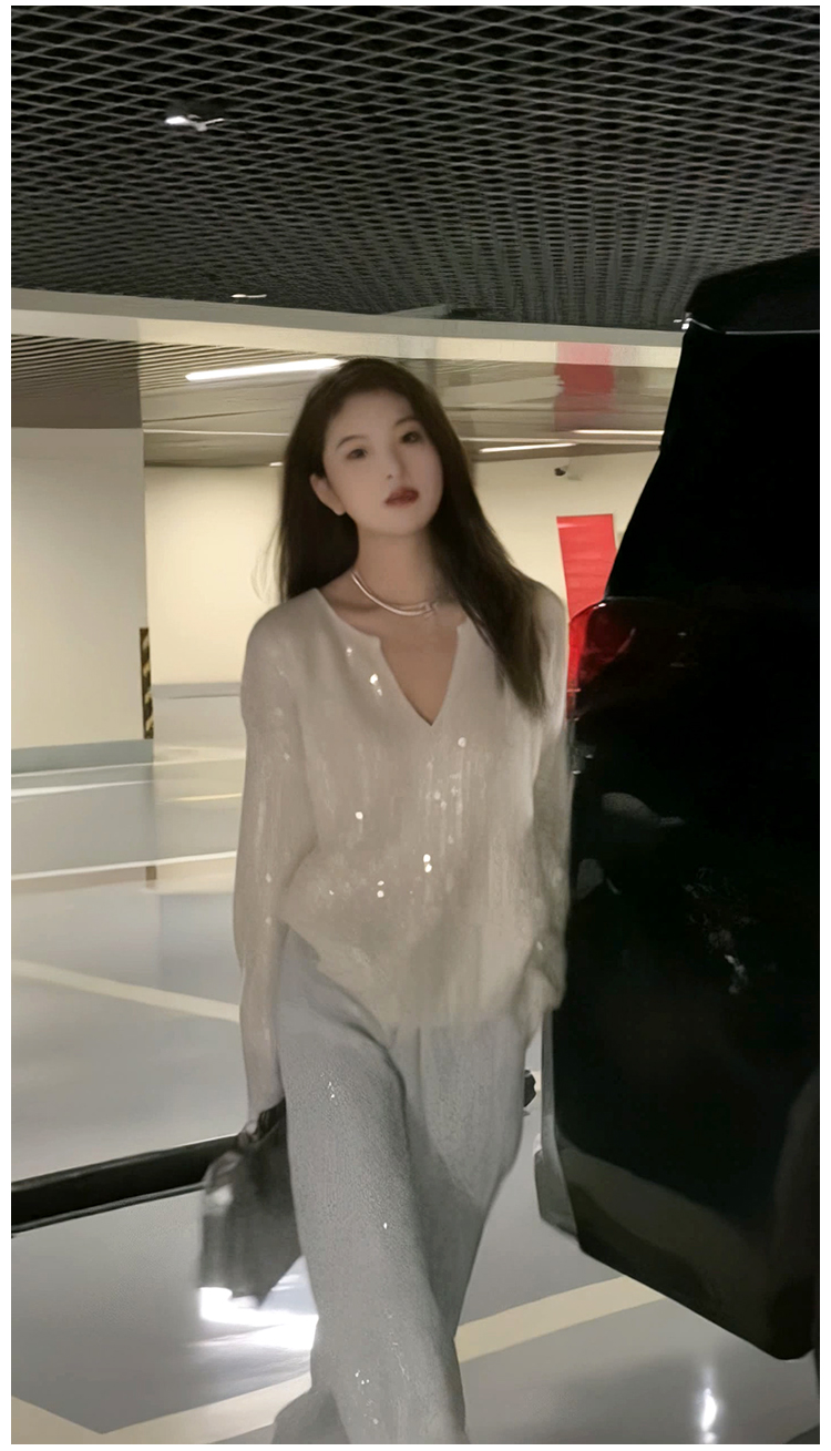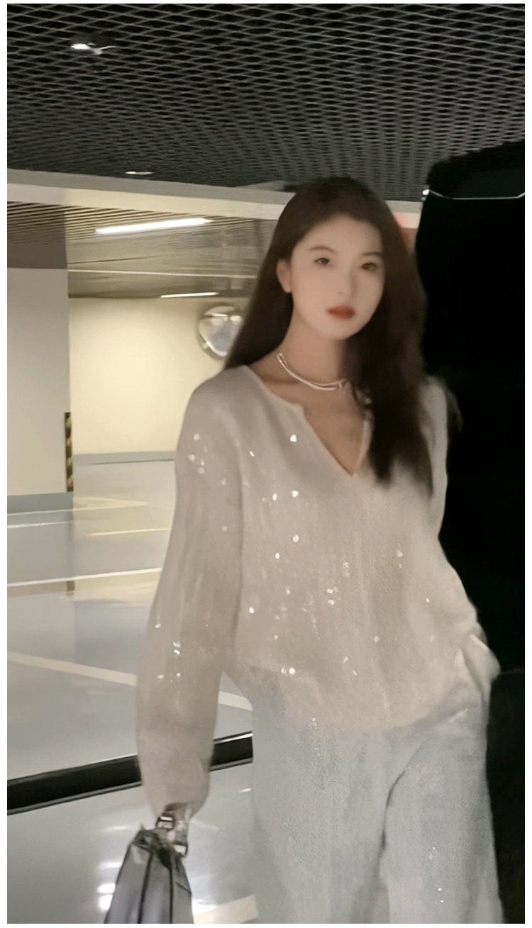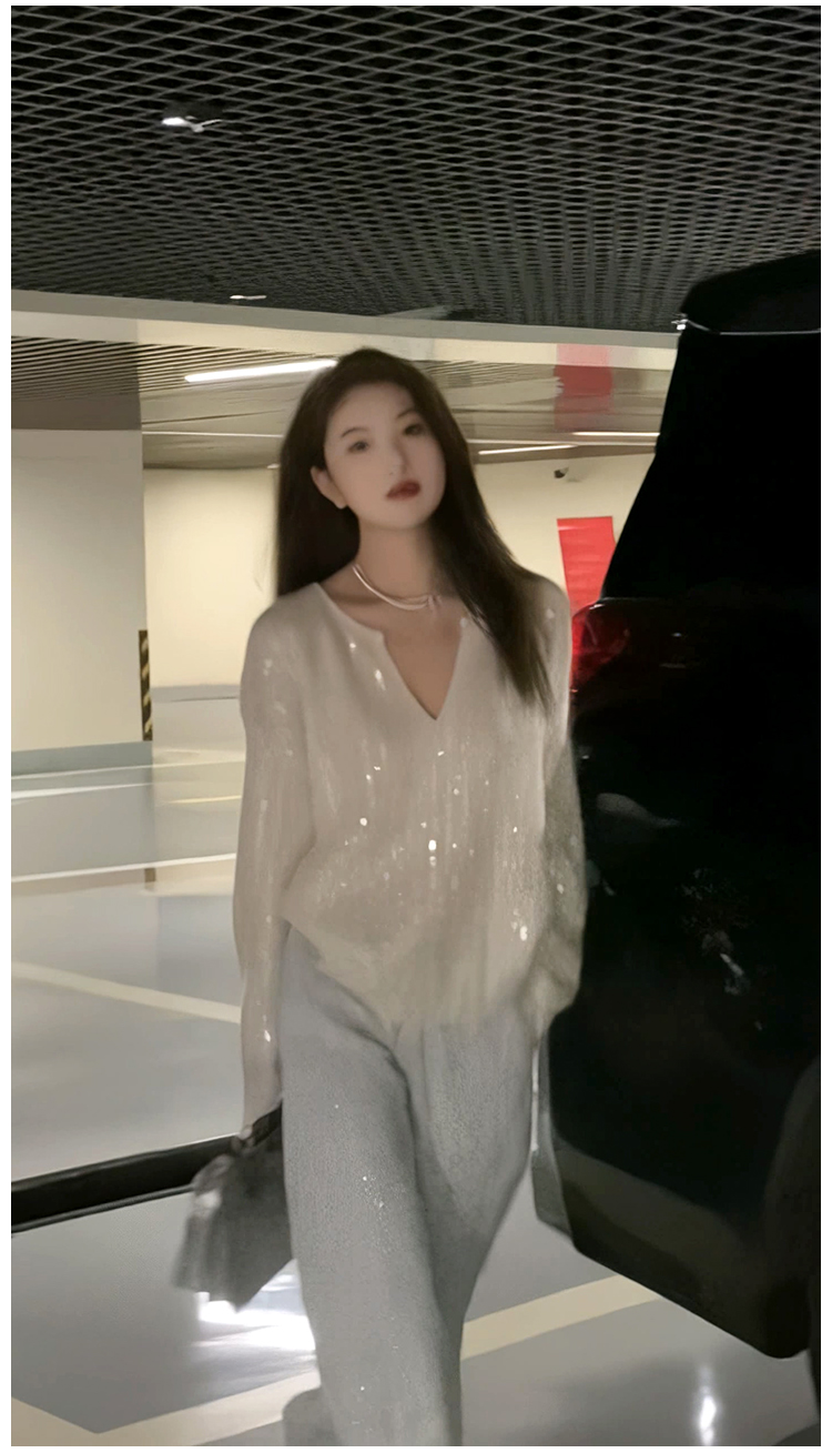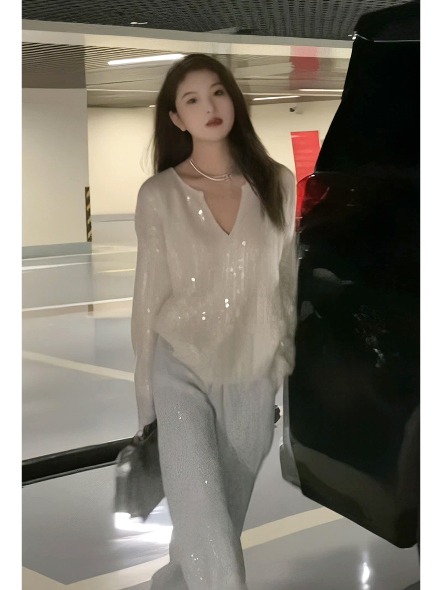 2023秋季新款設計感重工亮片上衣女V領寬鬆百搭長袖白色針織毛衣