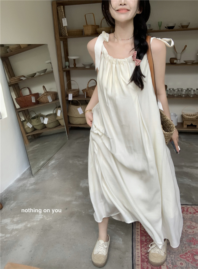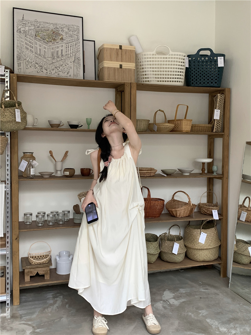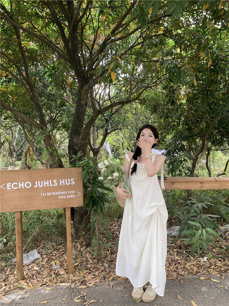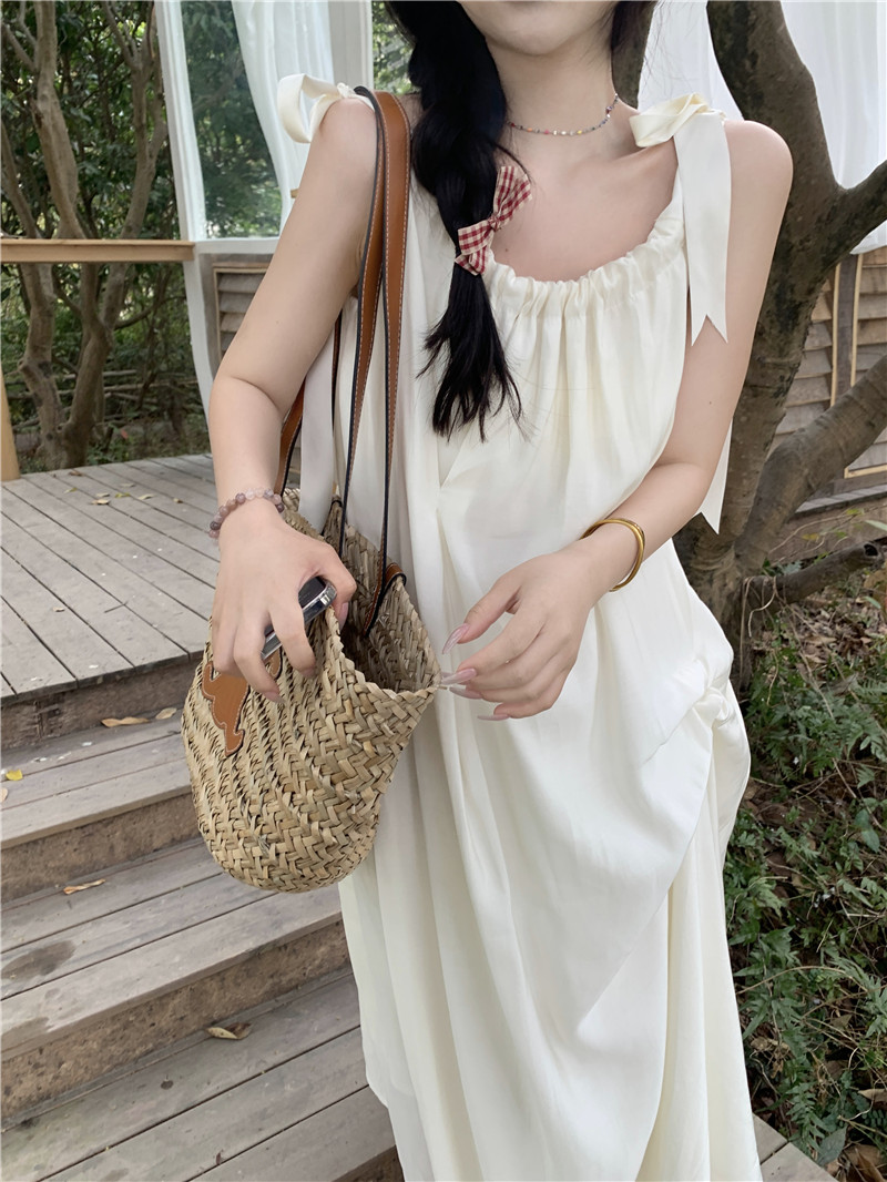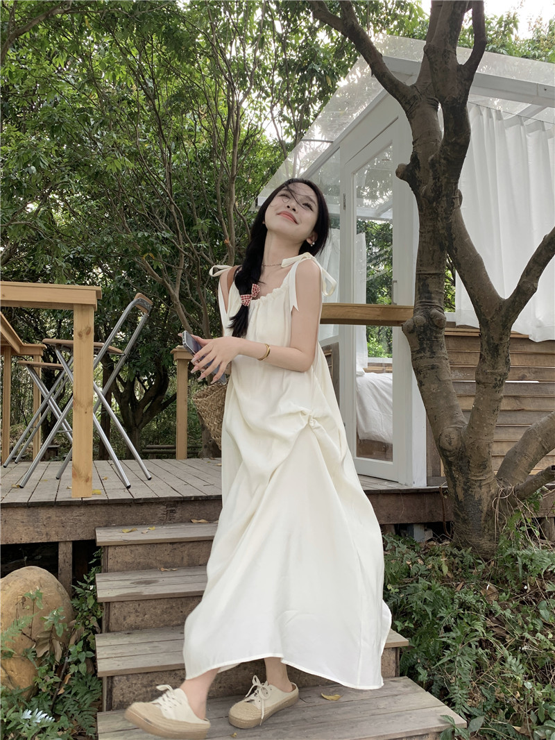 度假風吊帶洋裝女夏季新款法式溫柔風露背中長版寬鬆蝴蝶結裙子