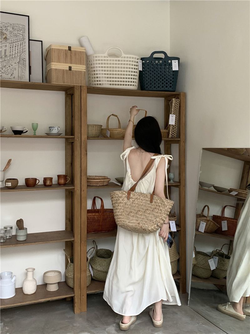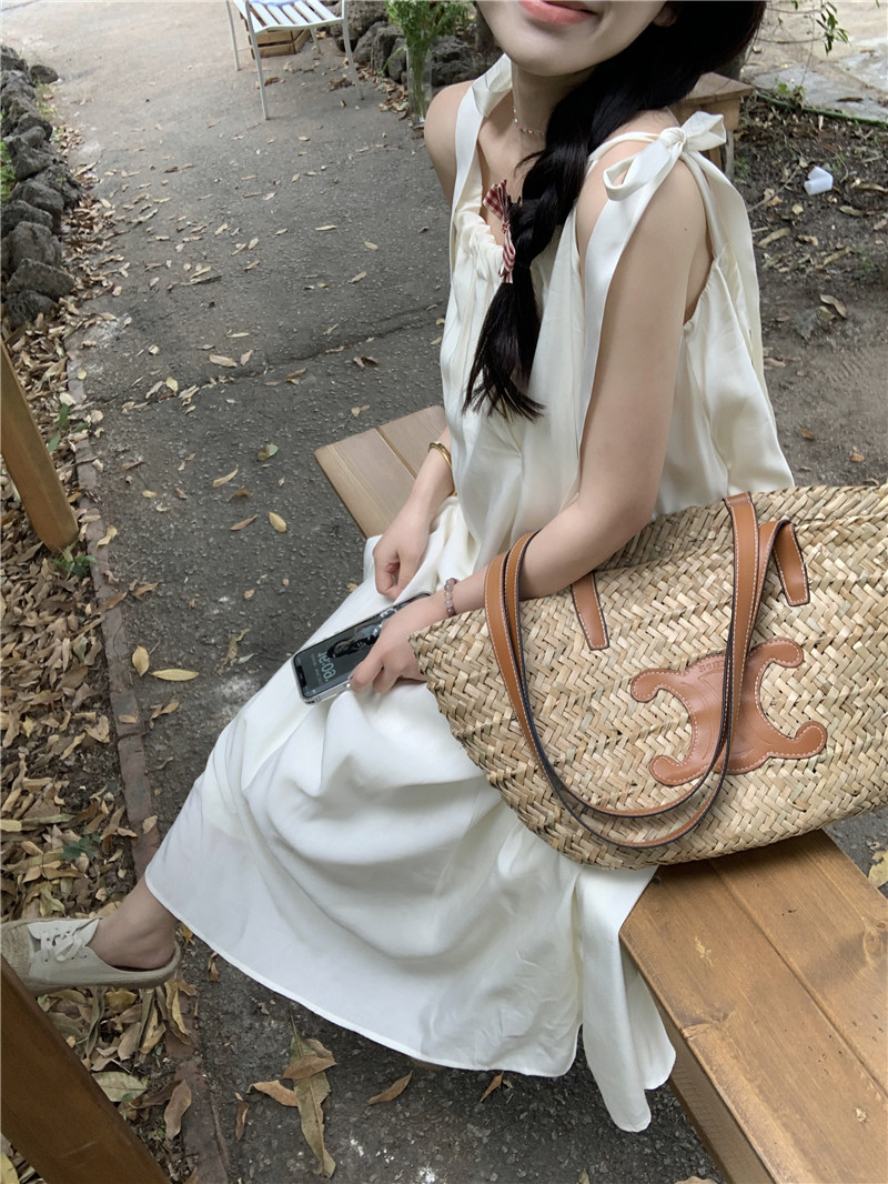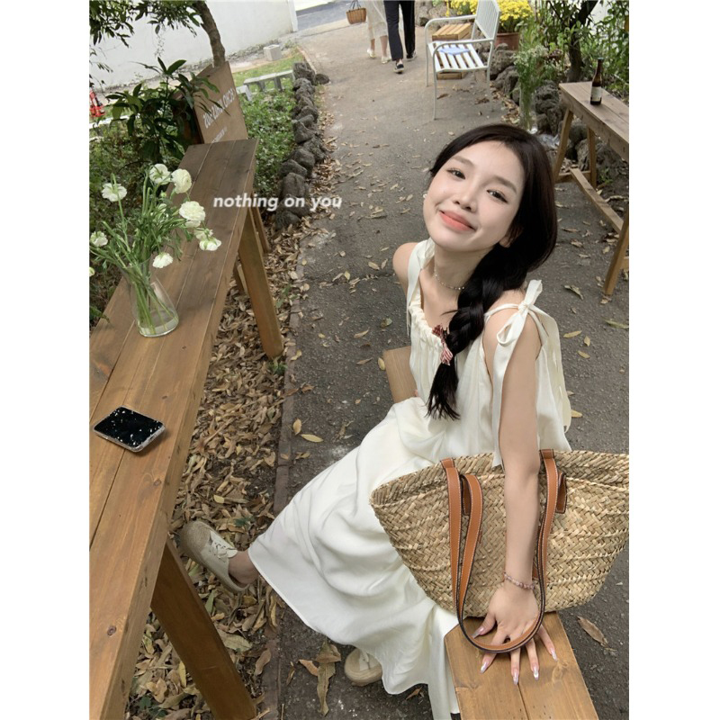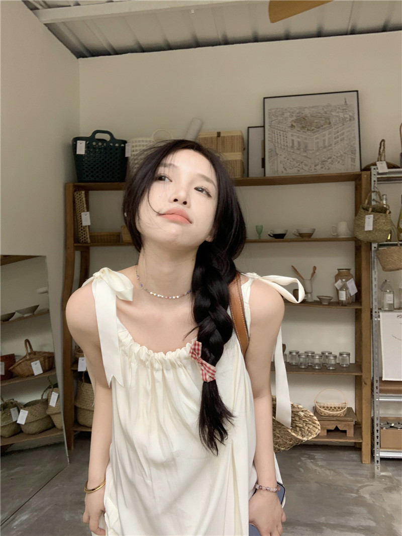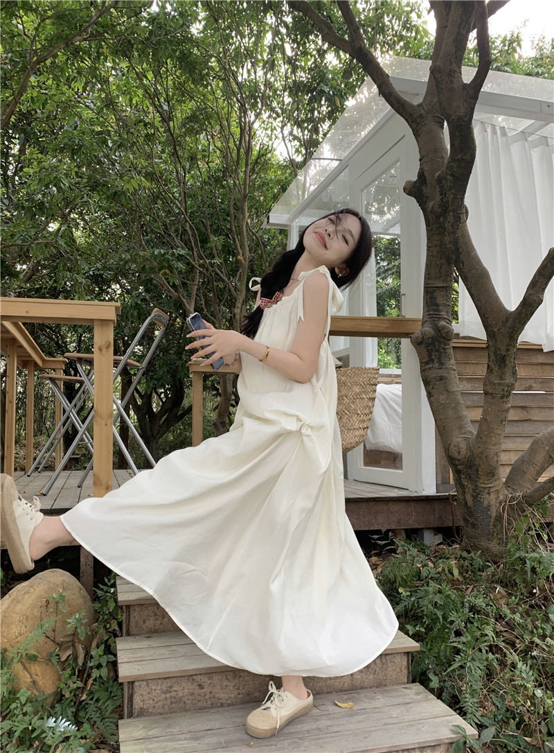 度假風吊帶洋裝女夏季新款法式溫柔風露背中長版寬鬆蝴蝶結裙子