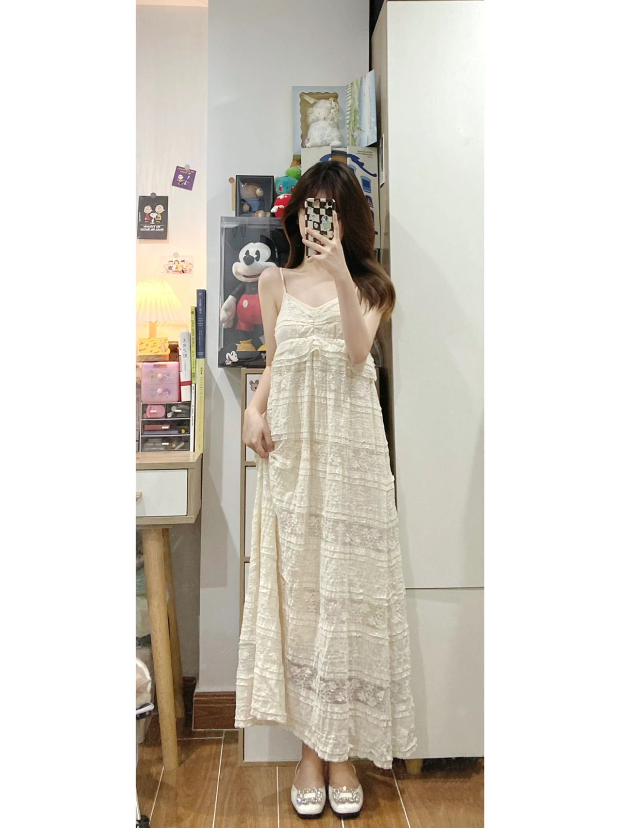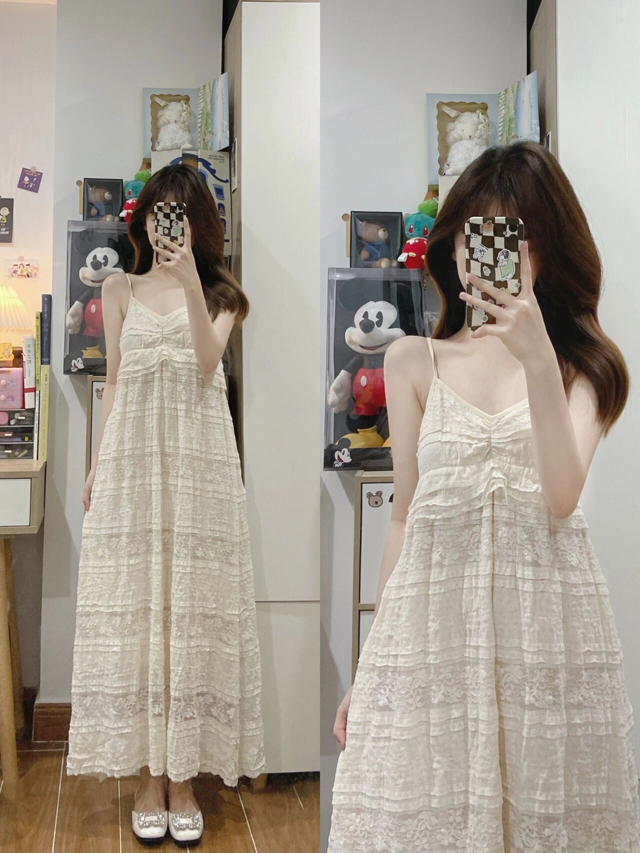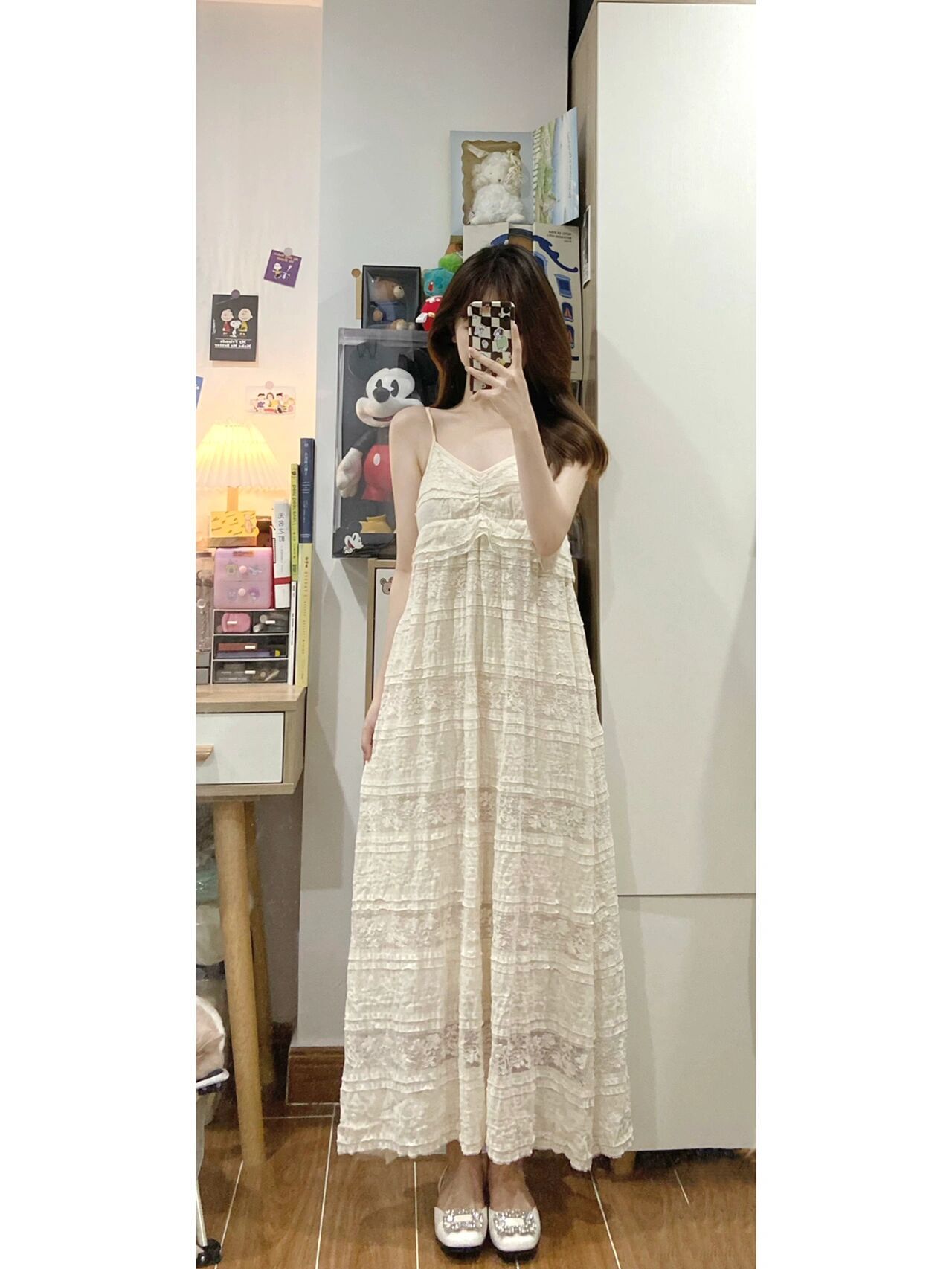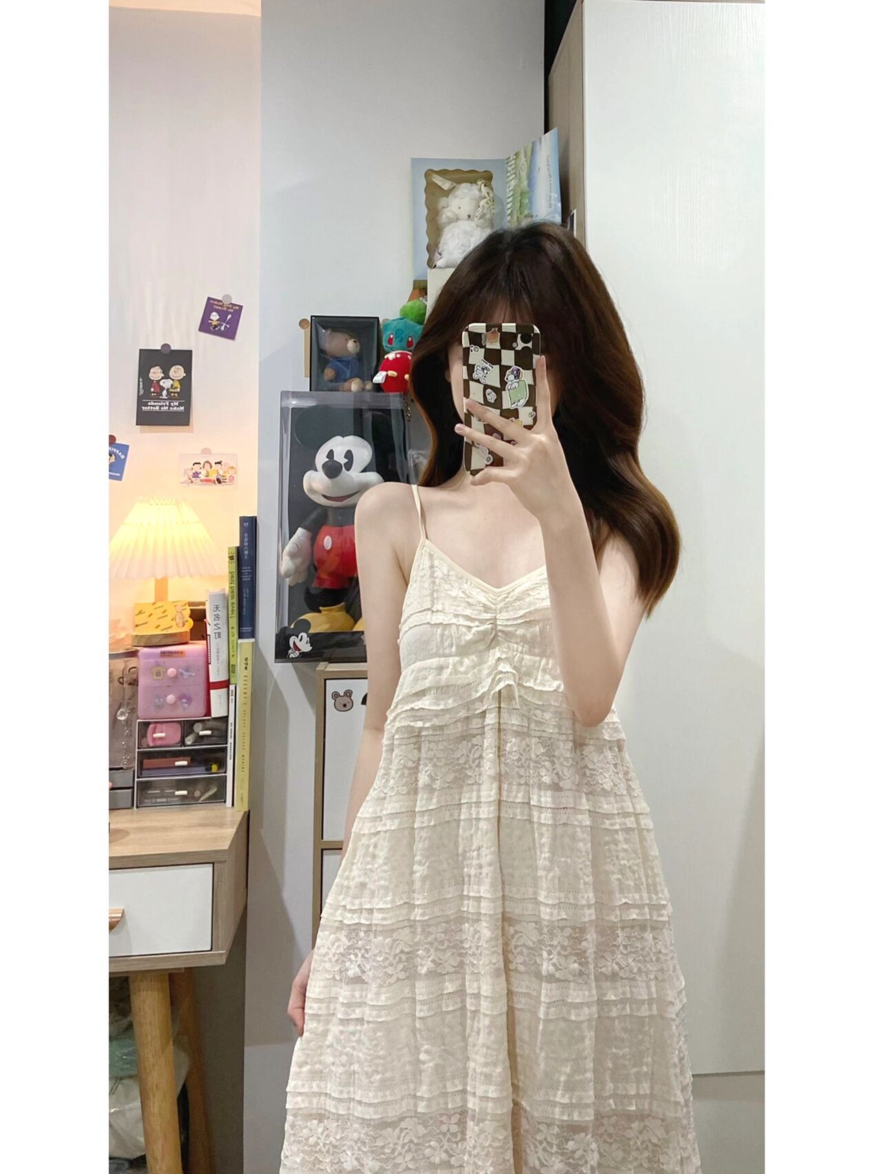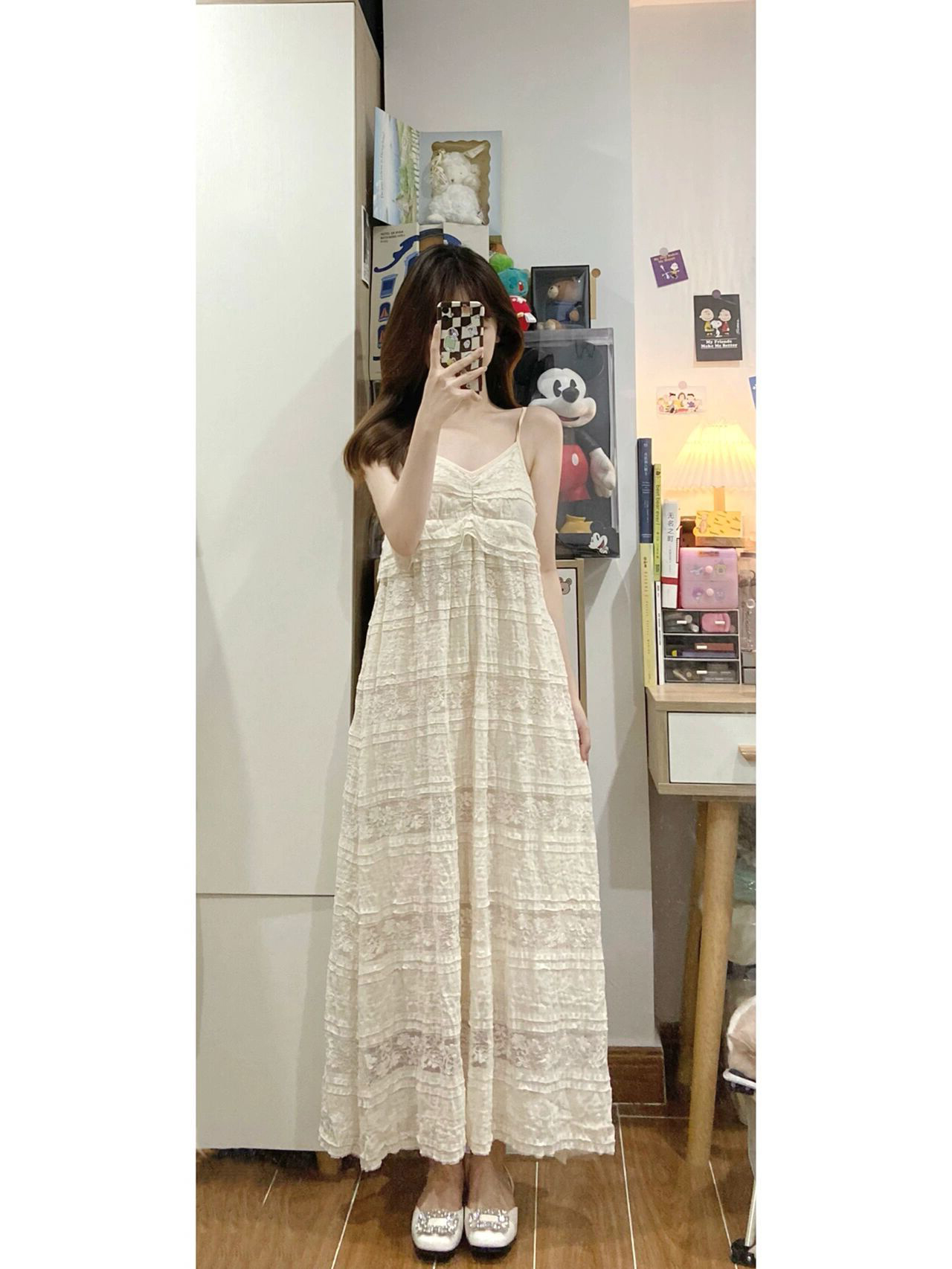 白色蕾絲拼接吊帶長裙2022夏季新款法式溫柔風甜美減齡高腰連身裙