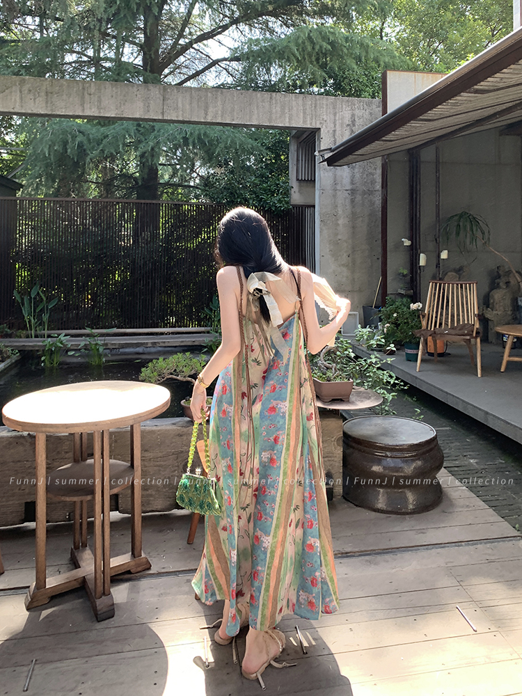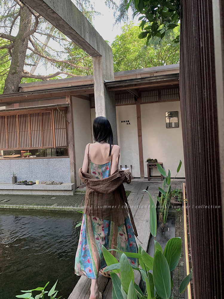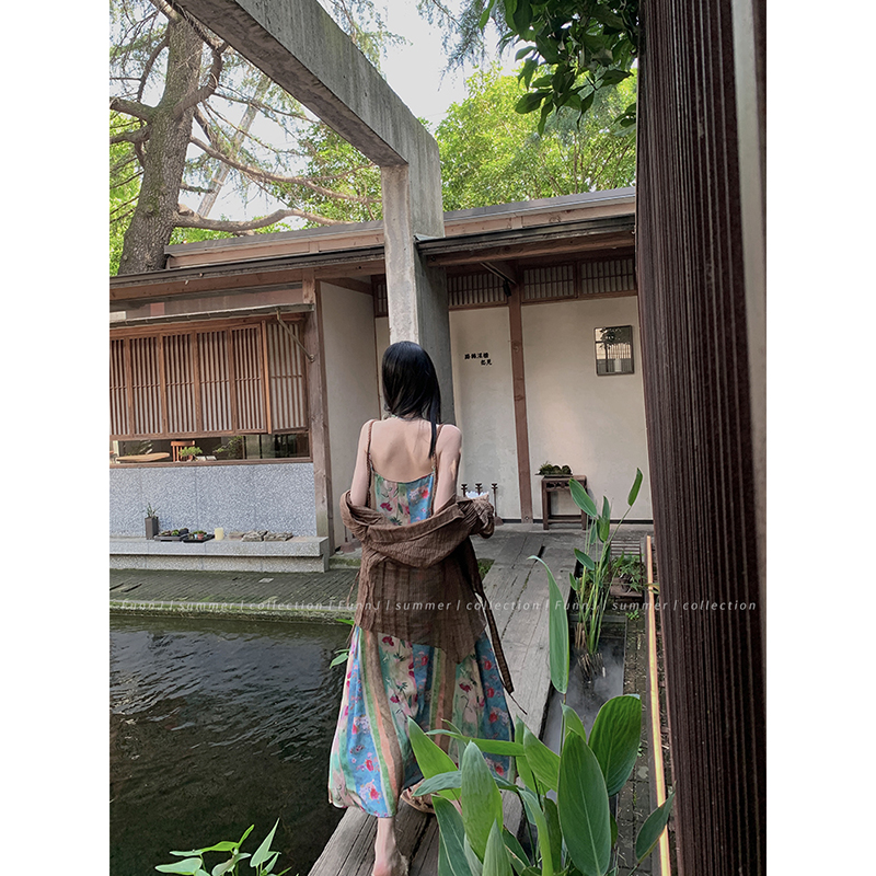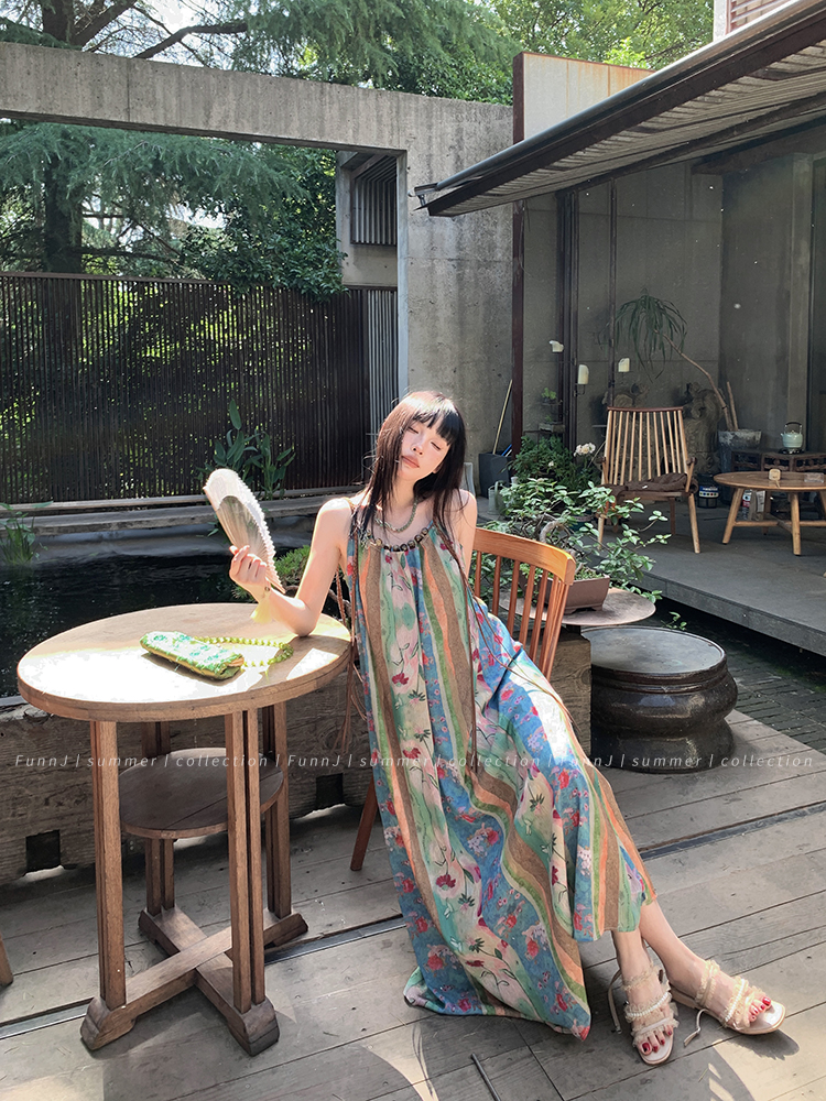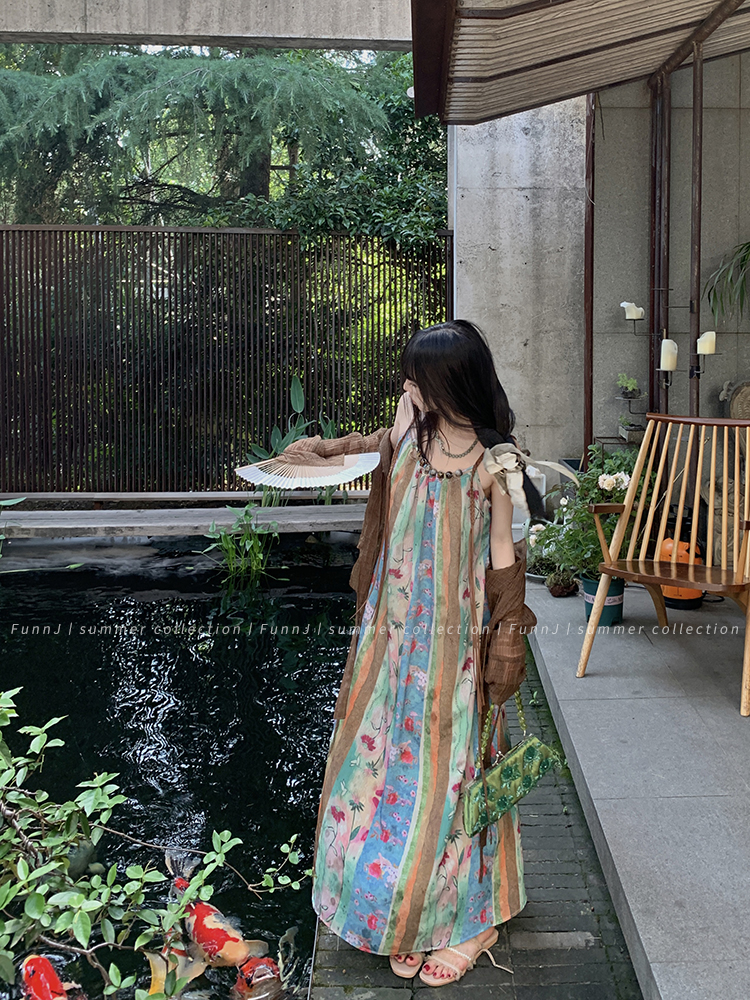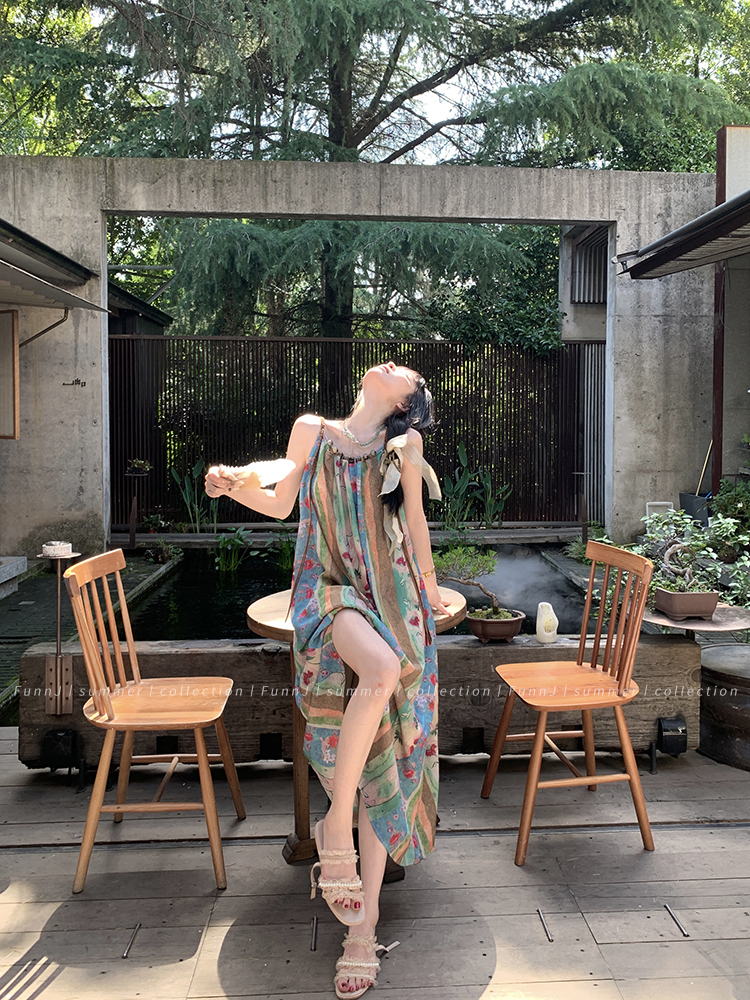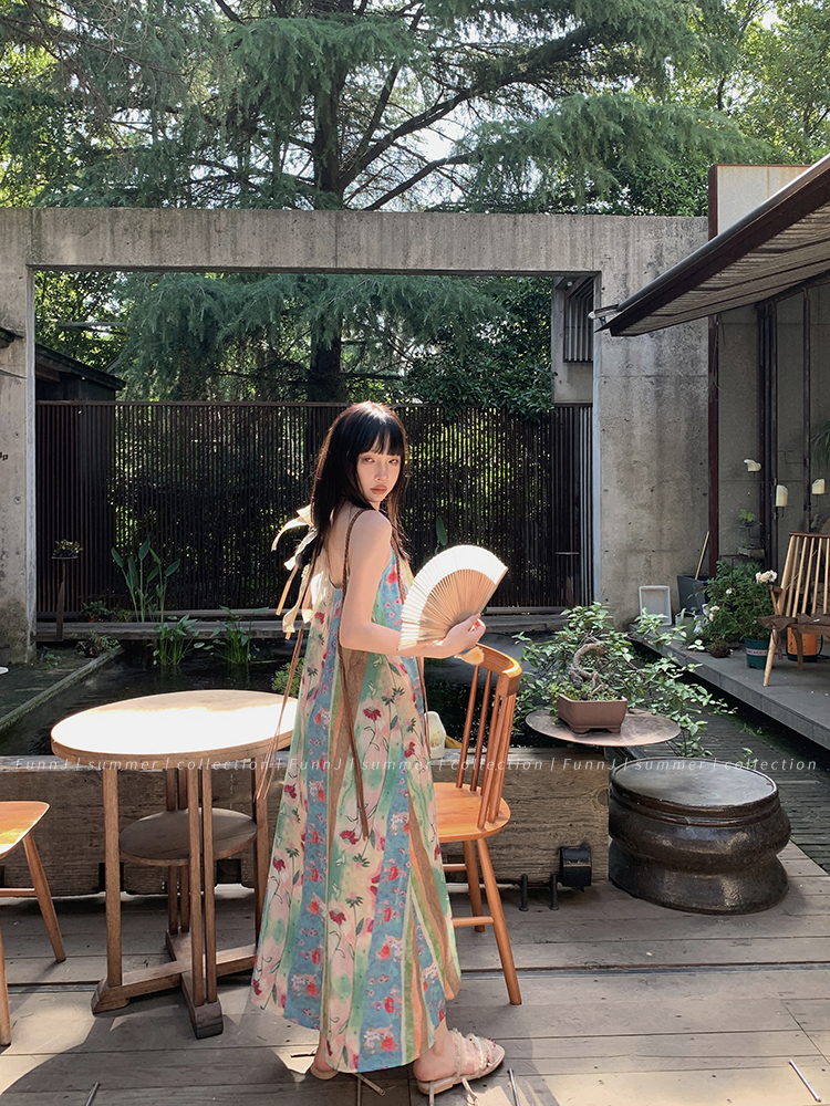 FunnJ方形茶幾◆清冷繆斯 新中式碎花中長版吊帶洋裝女復古度假長裙