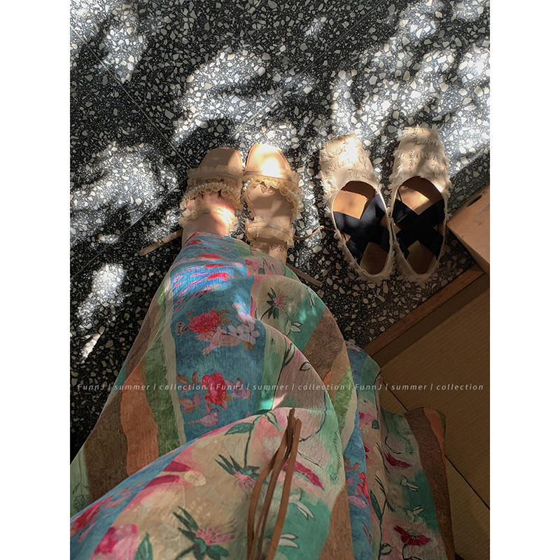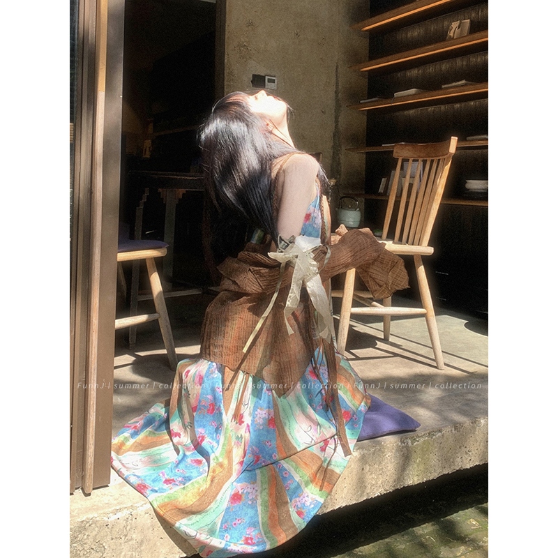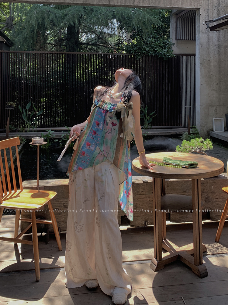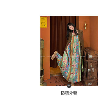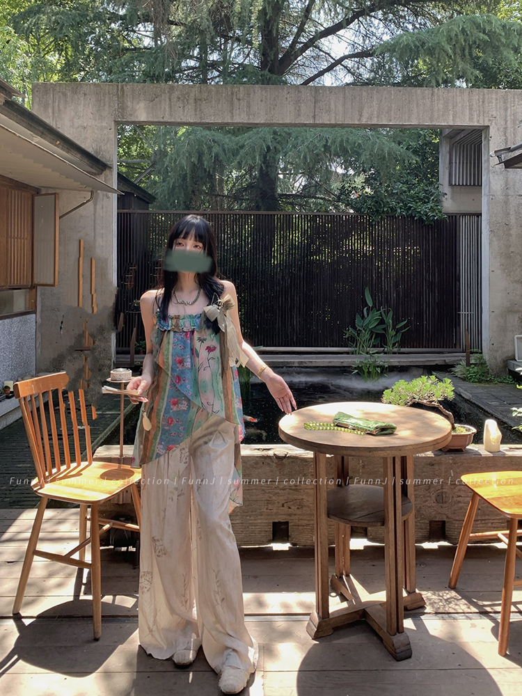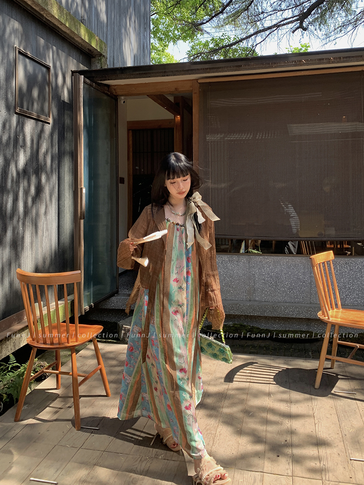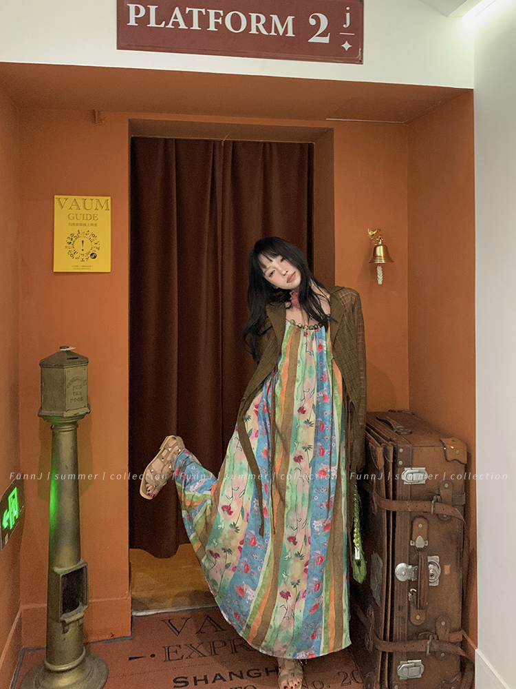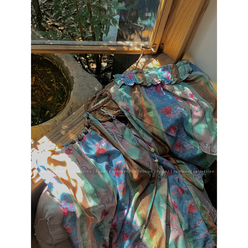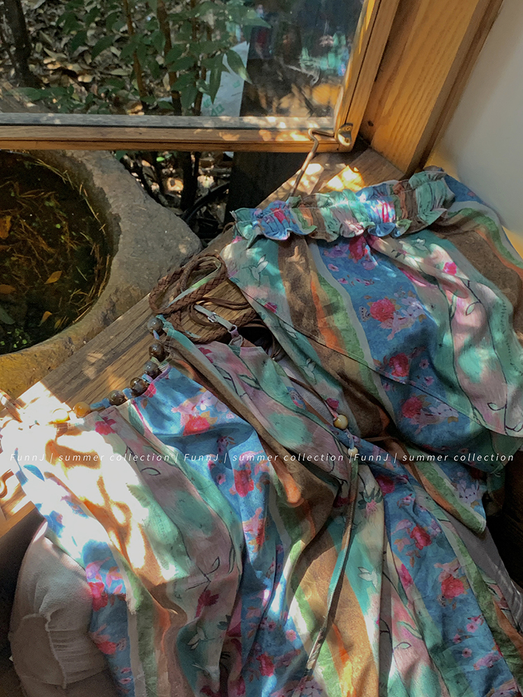 FunnJ方形茶幾◆清冷繆斯 新中式碎花中長版吊帶洋裝女復古度假長裙