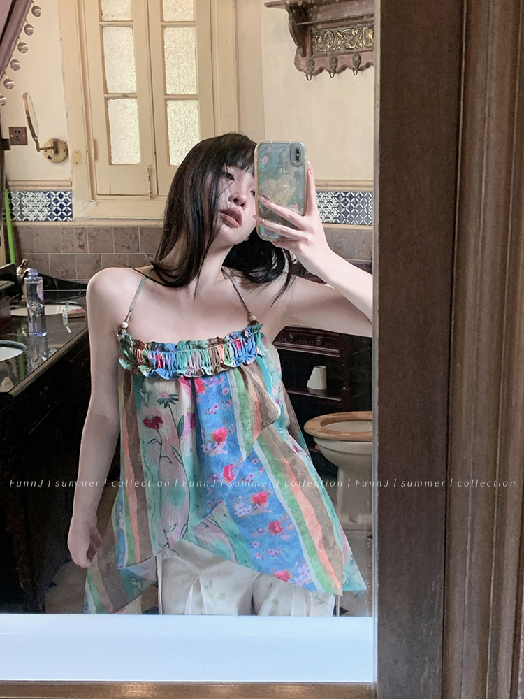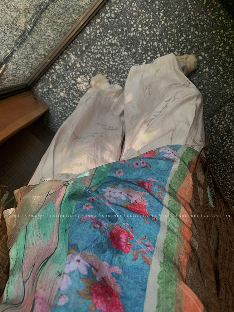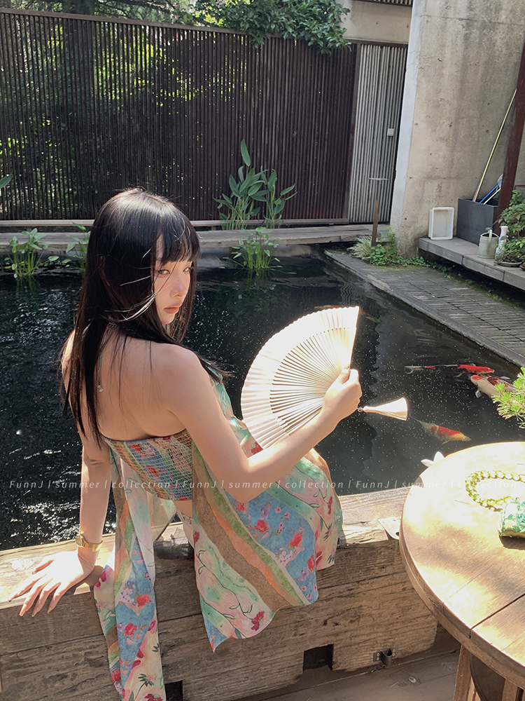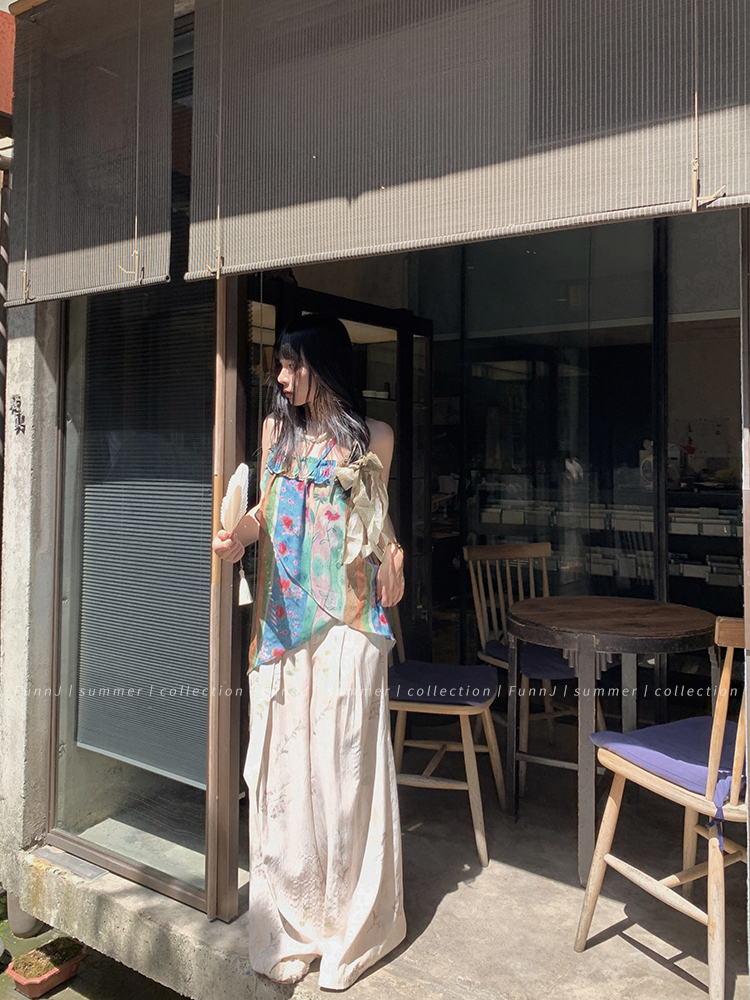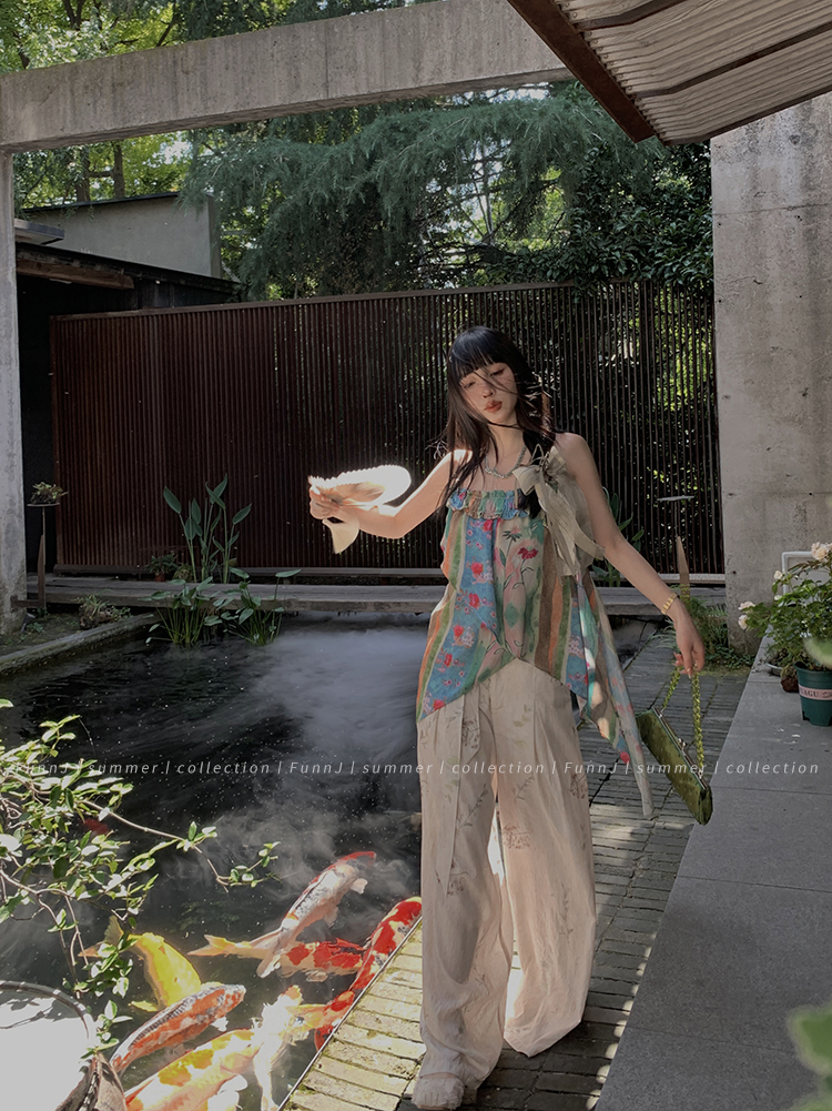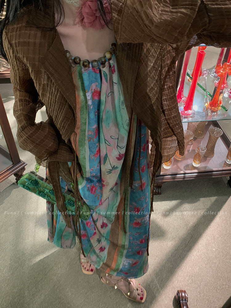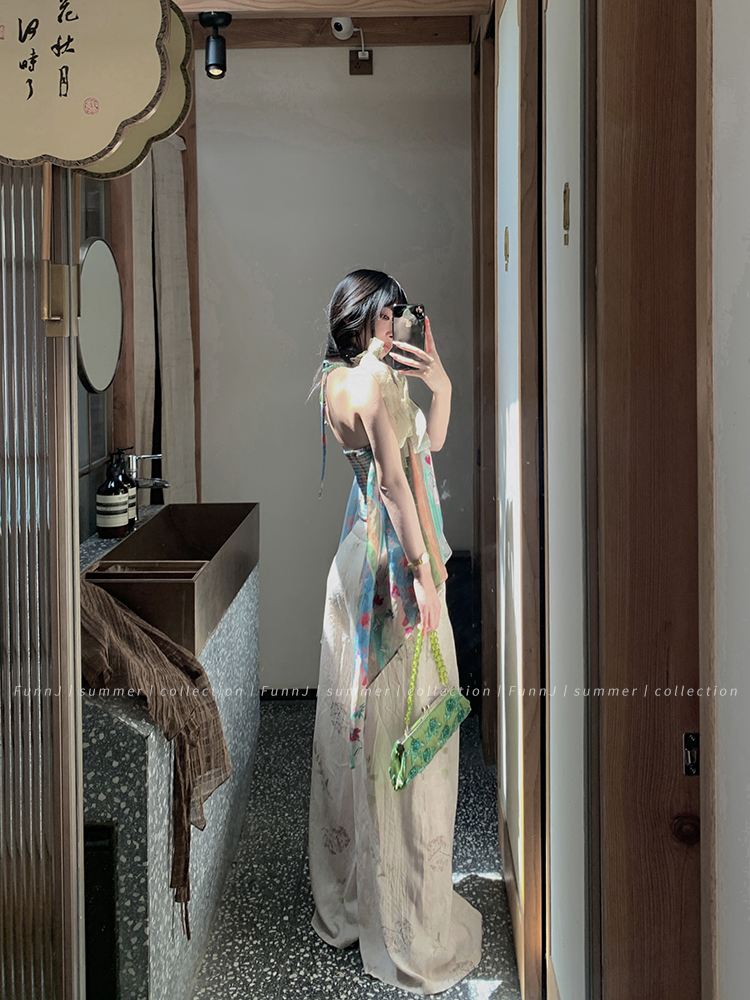 FunnJ方形茶幾◆清冷繆斯 新中式碎花中長版吊帶洋裝女復古度假長裙