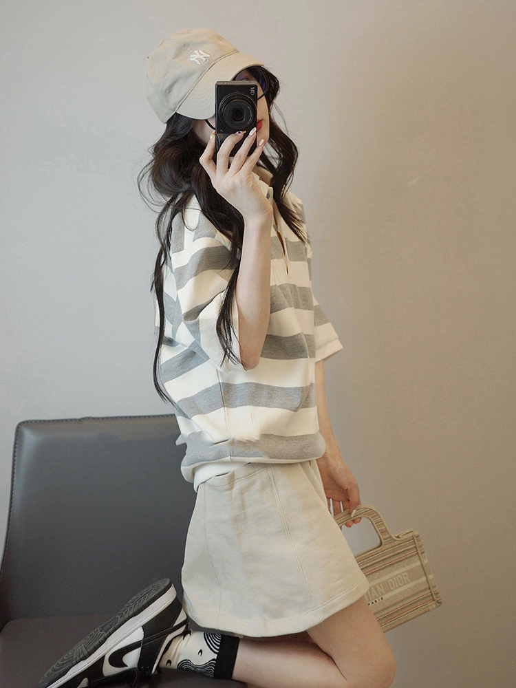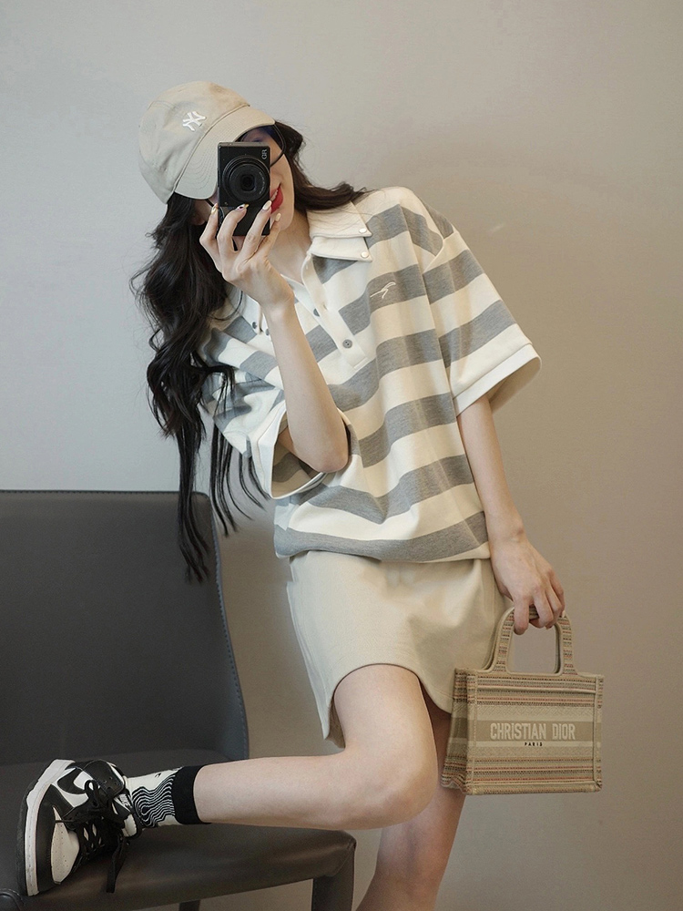 港味復古chic條紋正肩polo衫T恤女ins寬鬆鹽系學院風翻領短袖夏裝