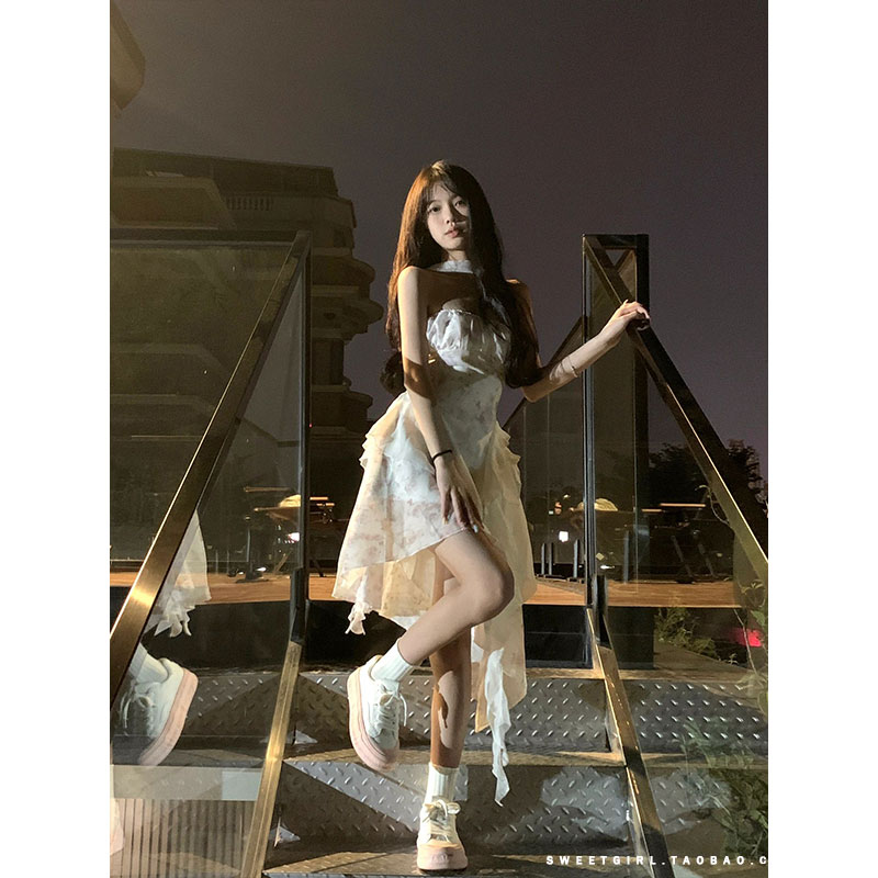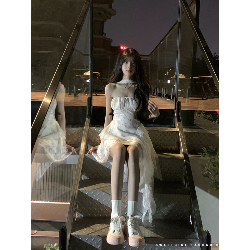茶歇法式露肩抹胸碎花在逃公主溫柔風不規則魚尾洋裝超仙森系