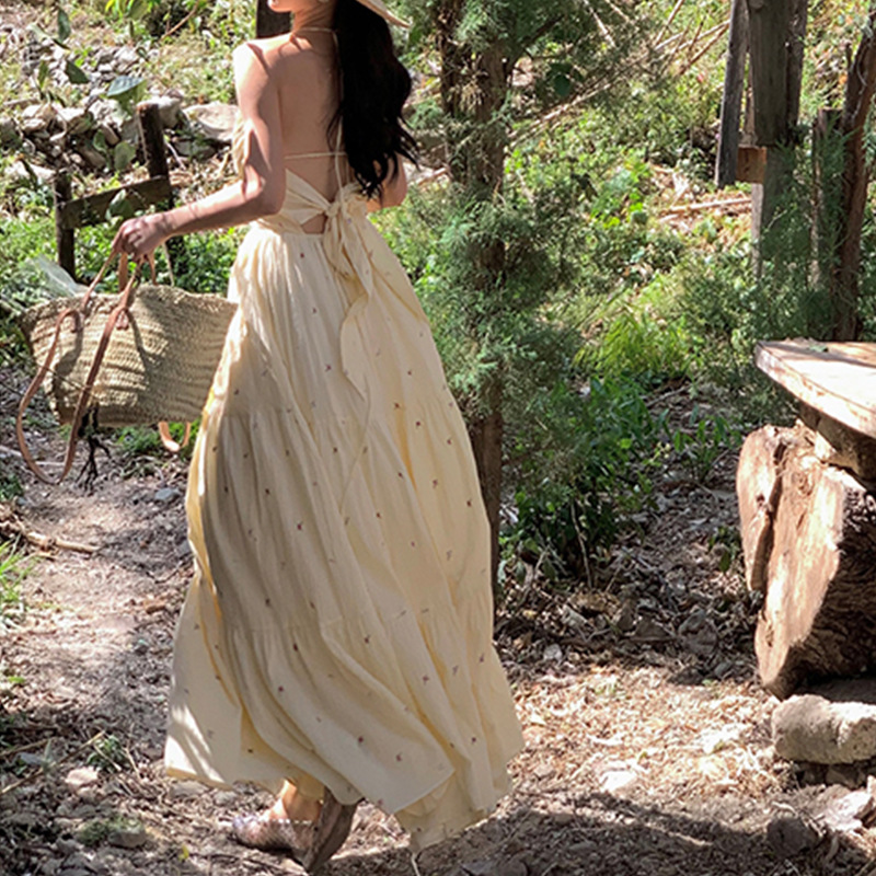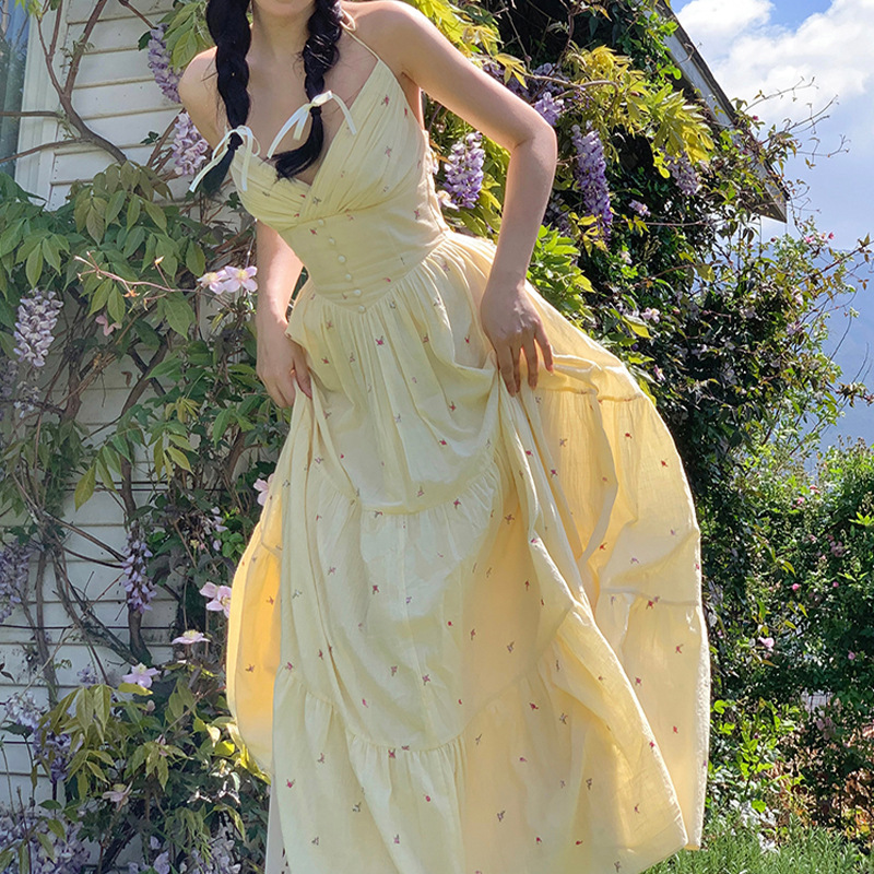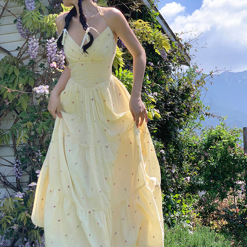 小丽初恋小黄裙V领挂脖吊带碎花连衣裙夏多巴胺穿搭法式收腰长裙