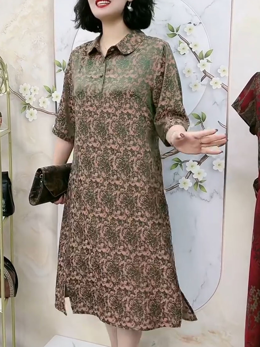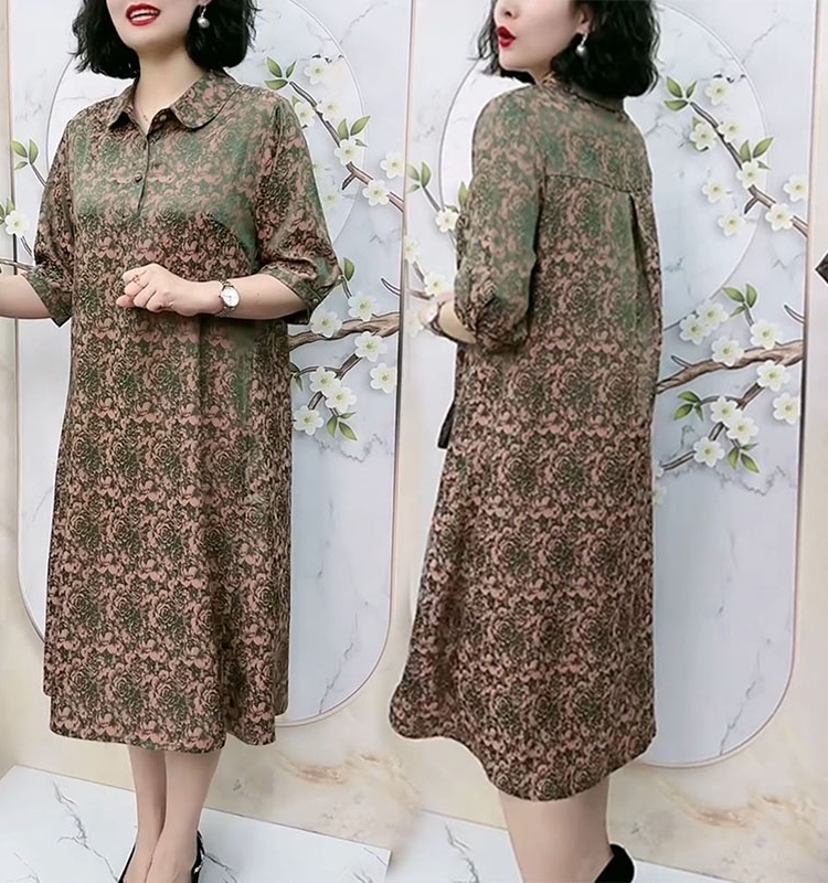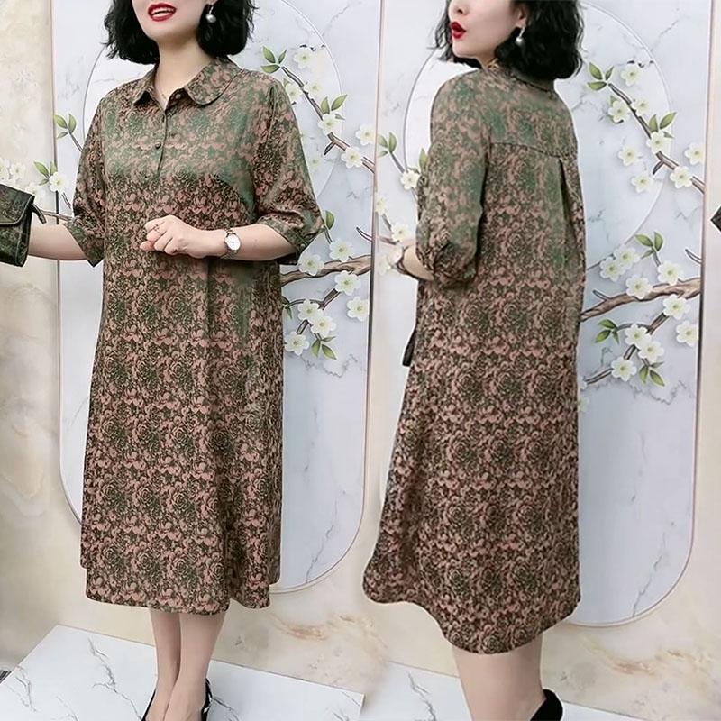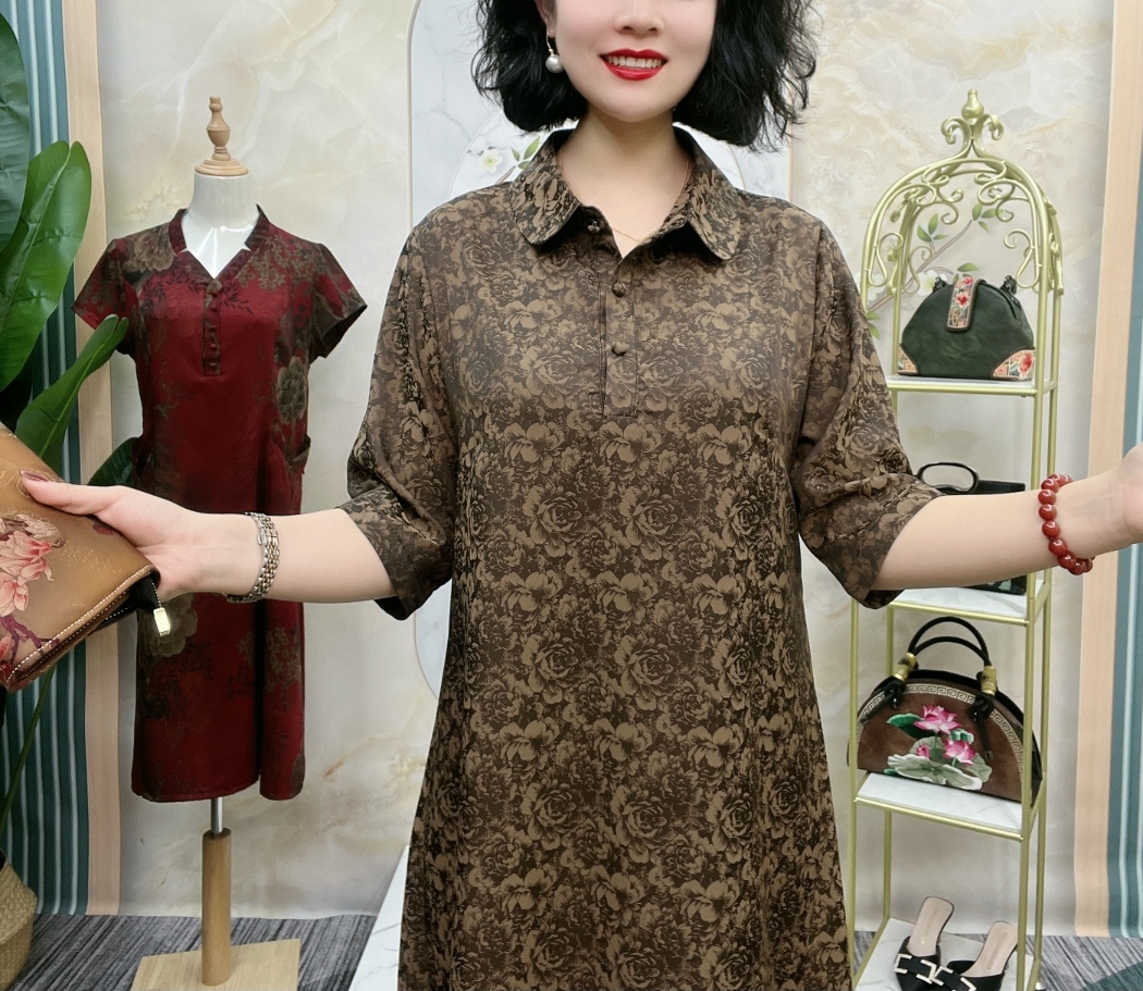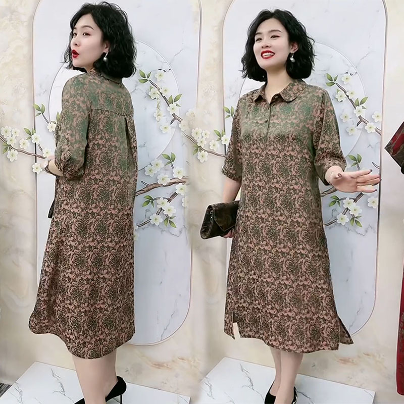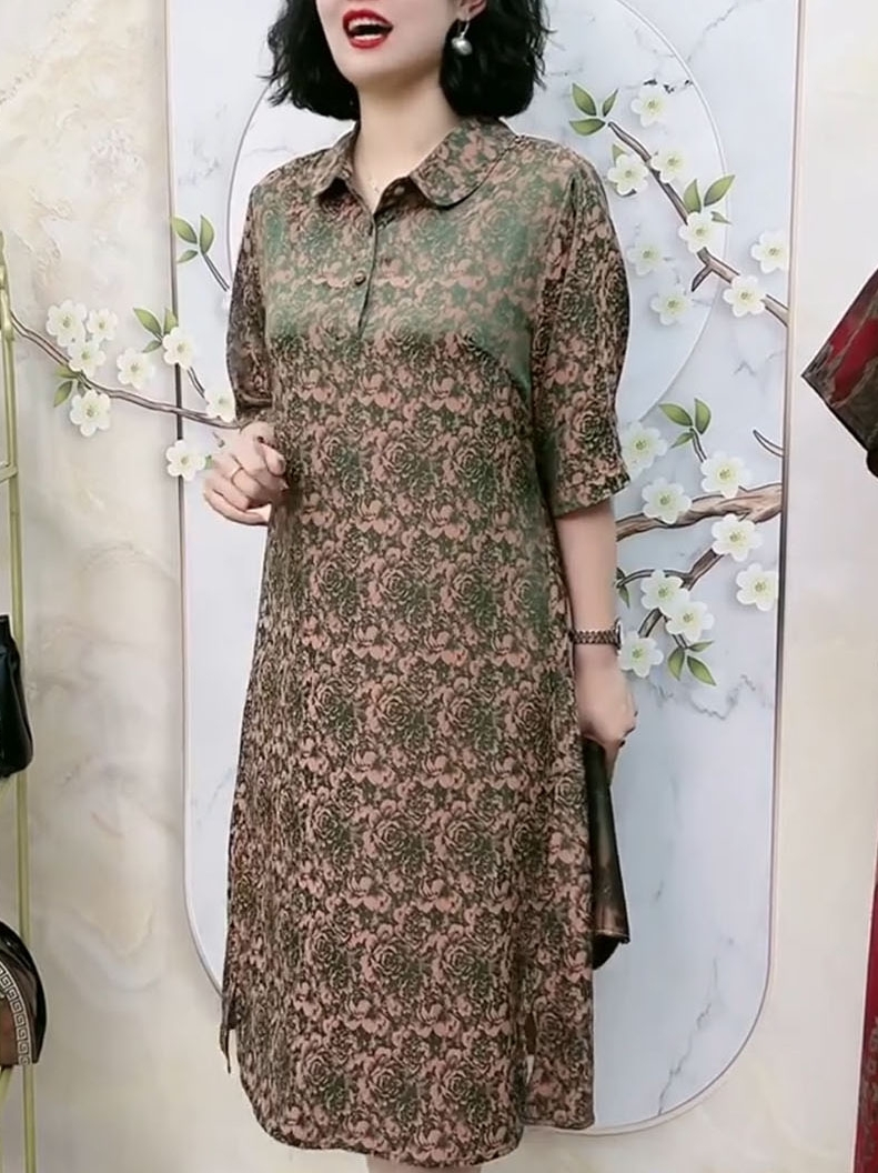 中老年氣質真絲夏季高端洋裝翻領浮雕暗紋花七分袖大尺碼200斤裙