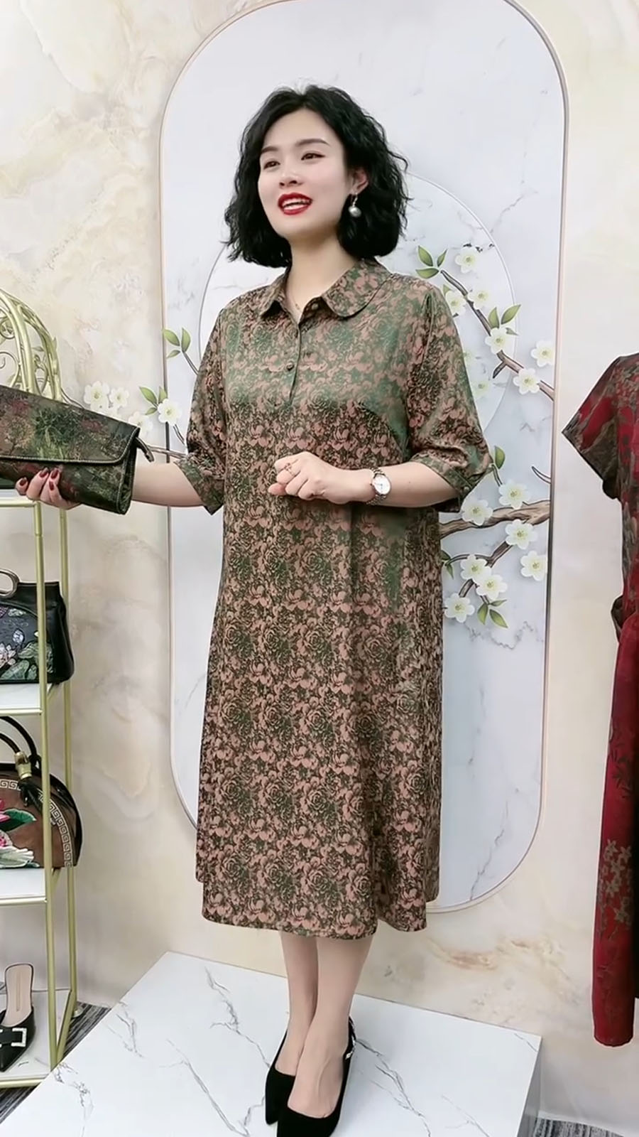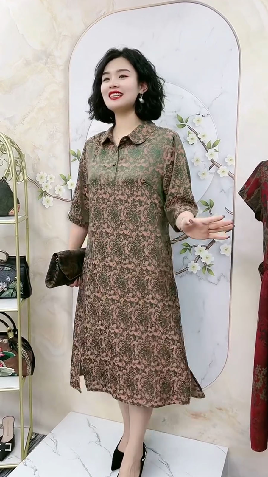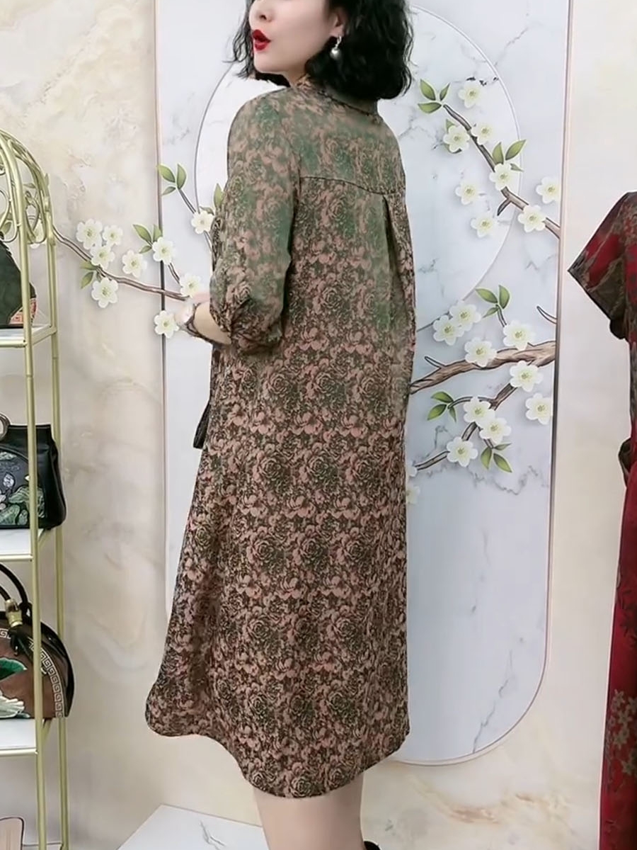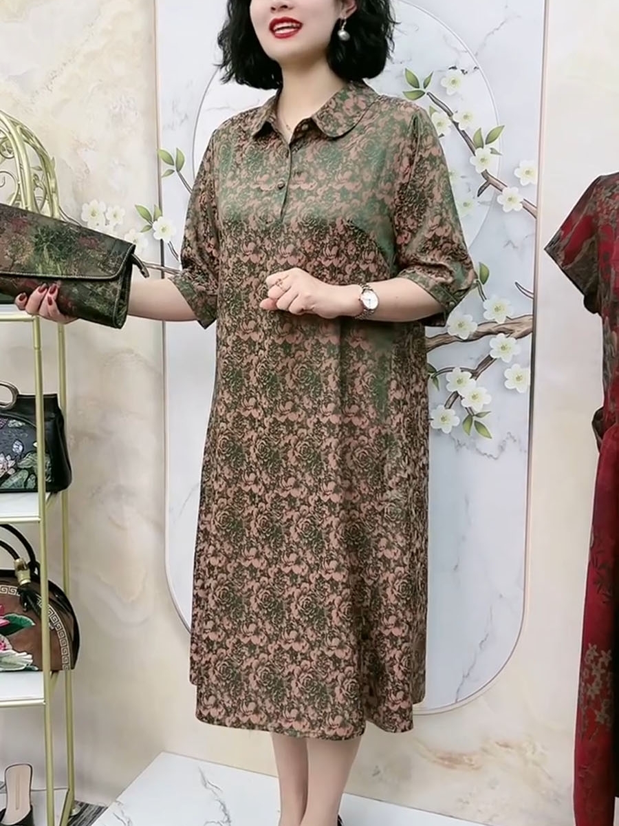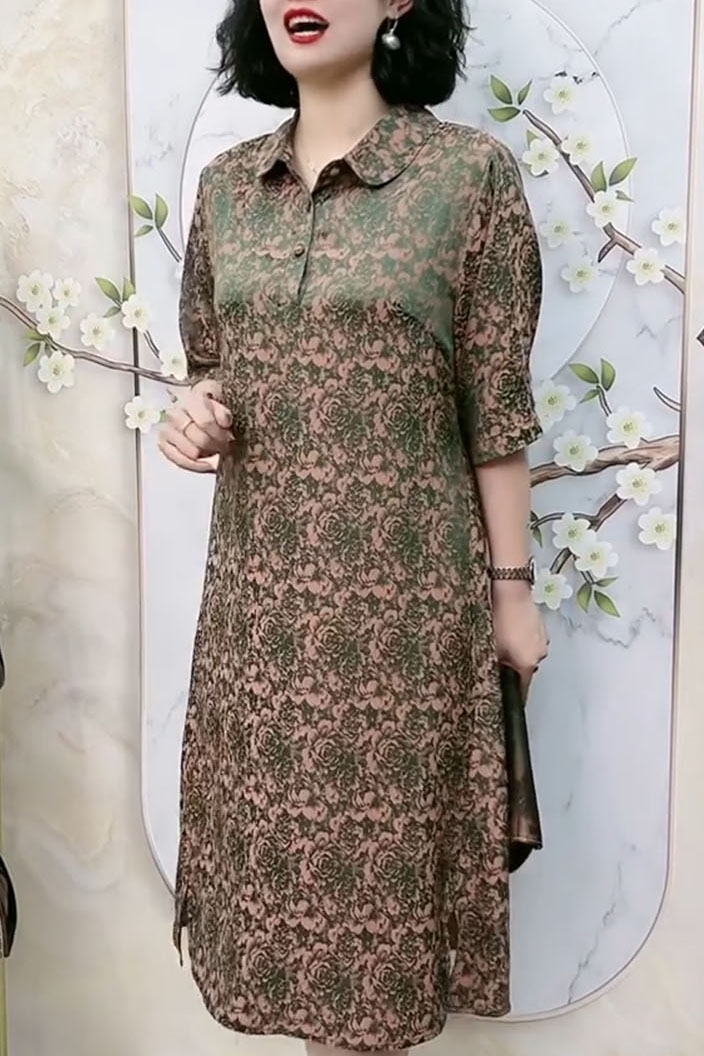 中老年氣質真絲夏季高端洋裝翻領浮雕暗紋花七分袖大尺碼200斤裙
