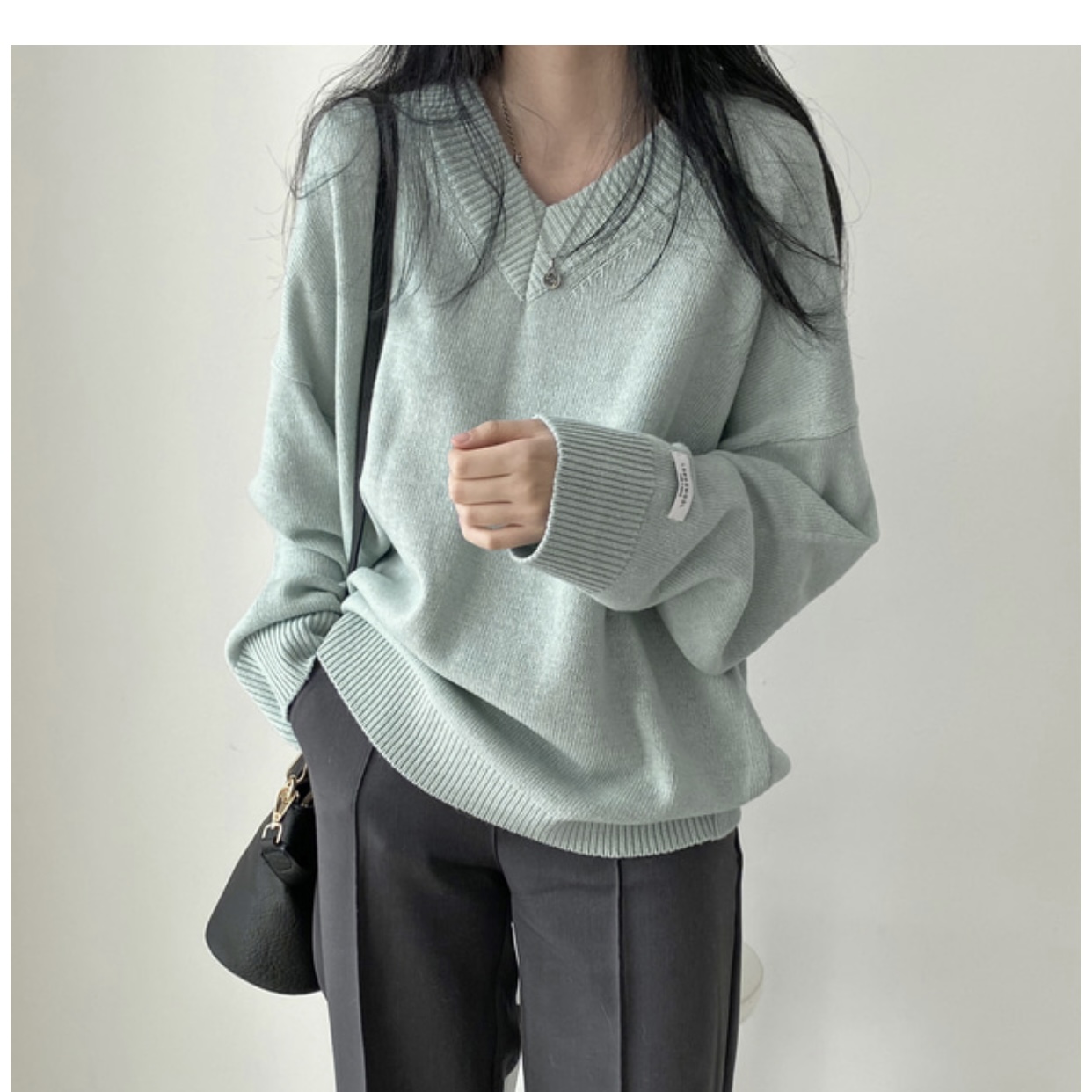 大尺碼慵懶風V領長袖針織毛衣女冬季胖MM遮肚上衣藏肉中長版打底衫