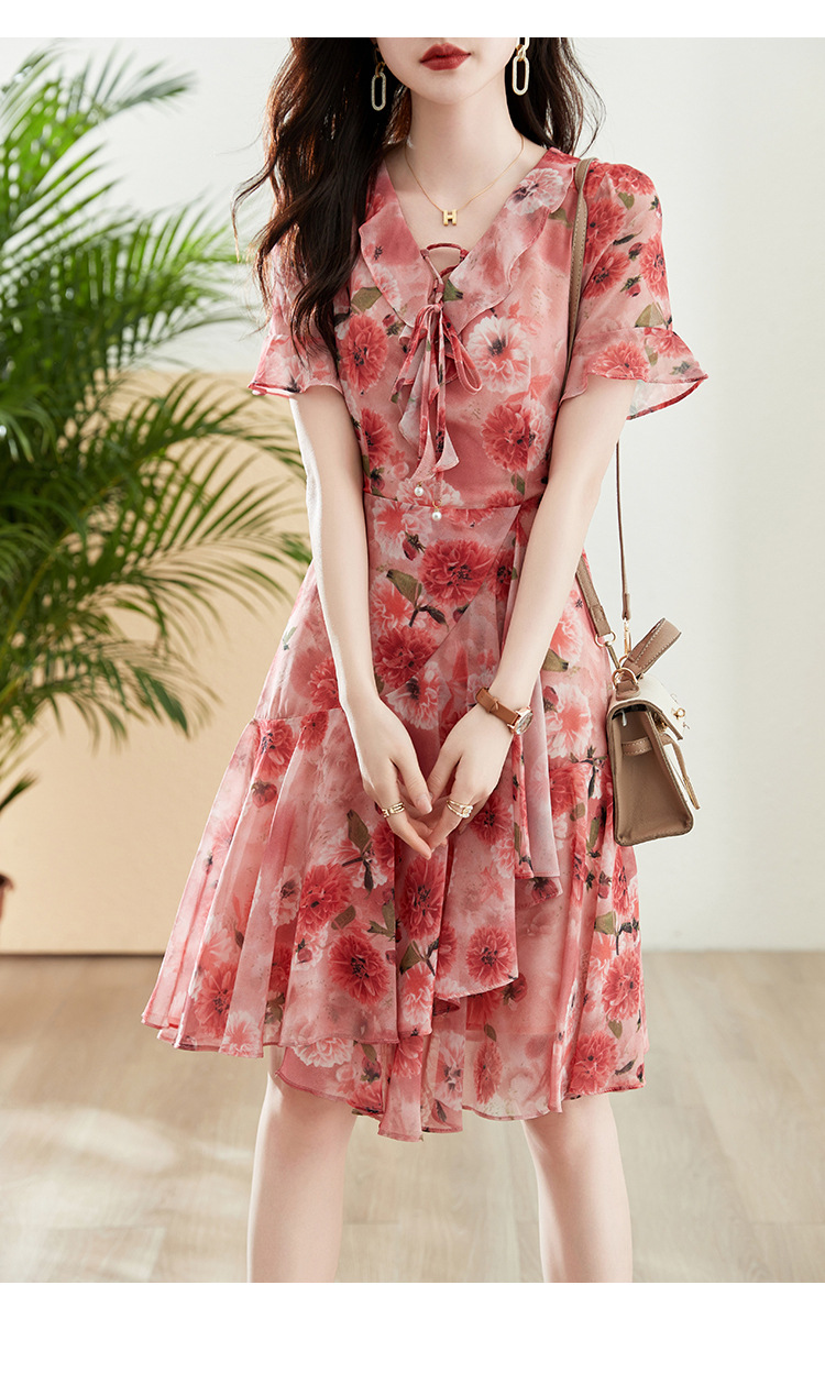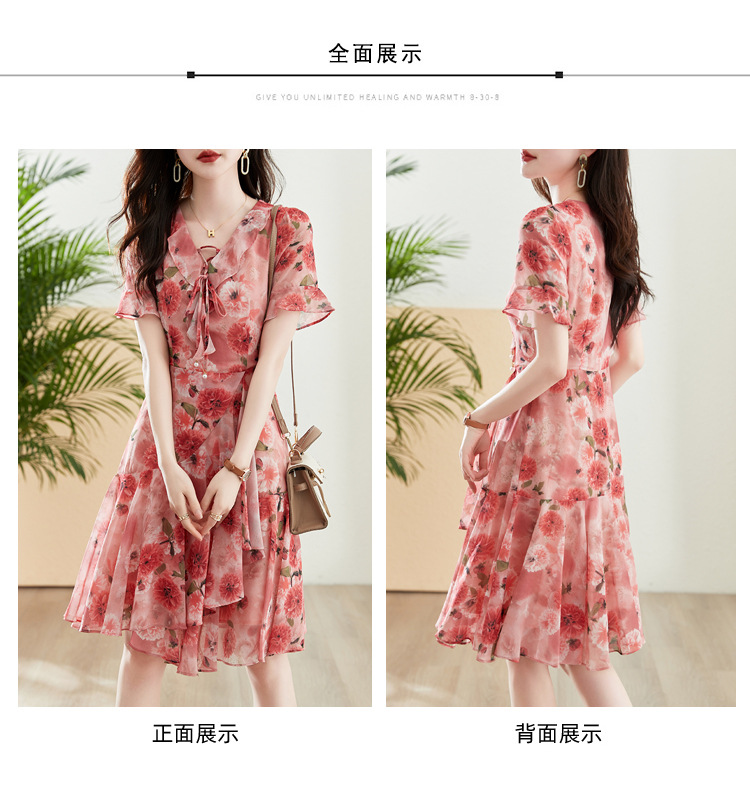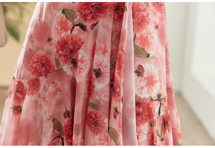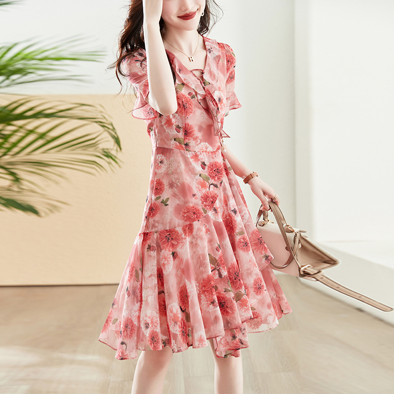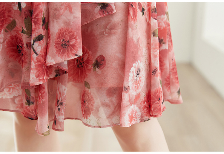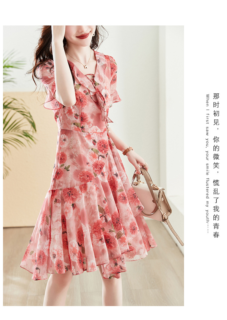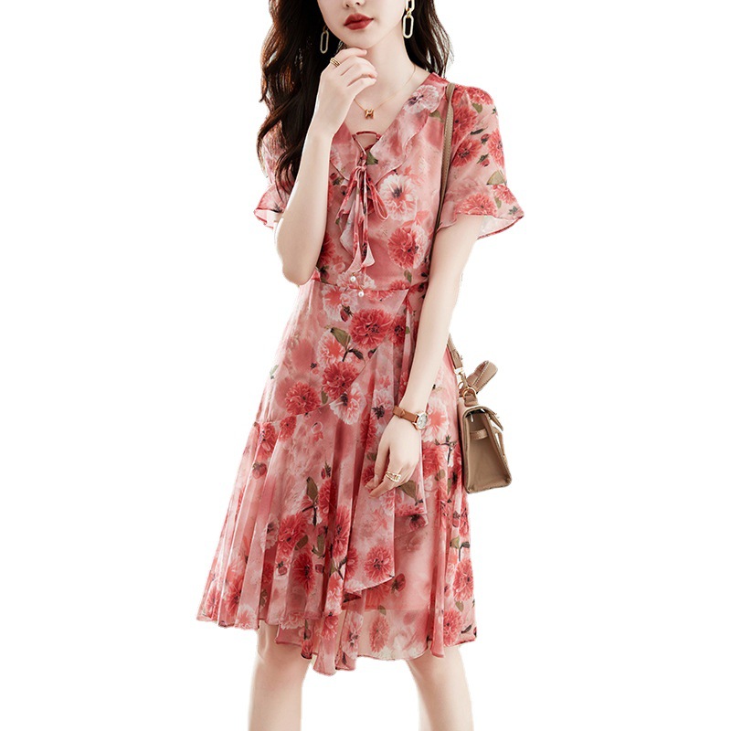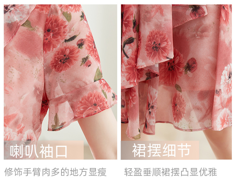 雪纺印花连衣裙女式夏季2023新款不规则设计感气质粉色碎花仙女裙