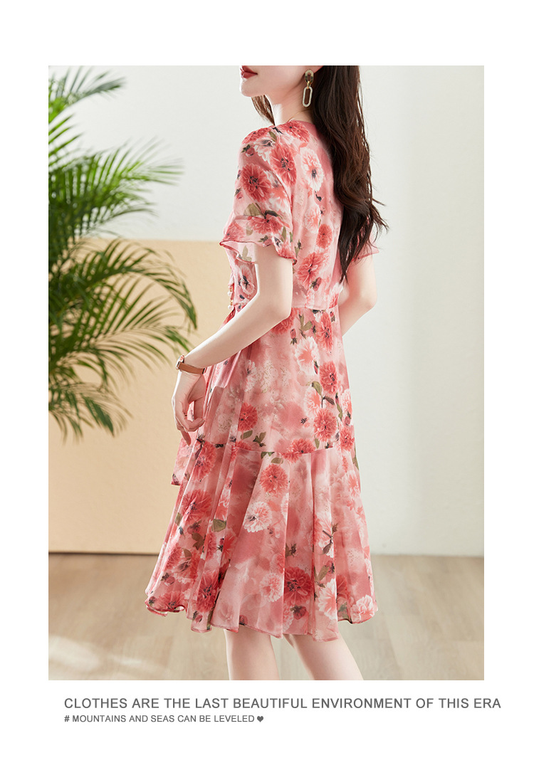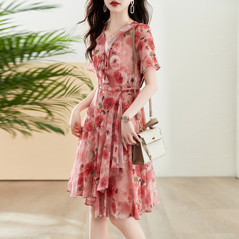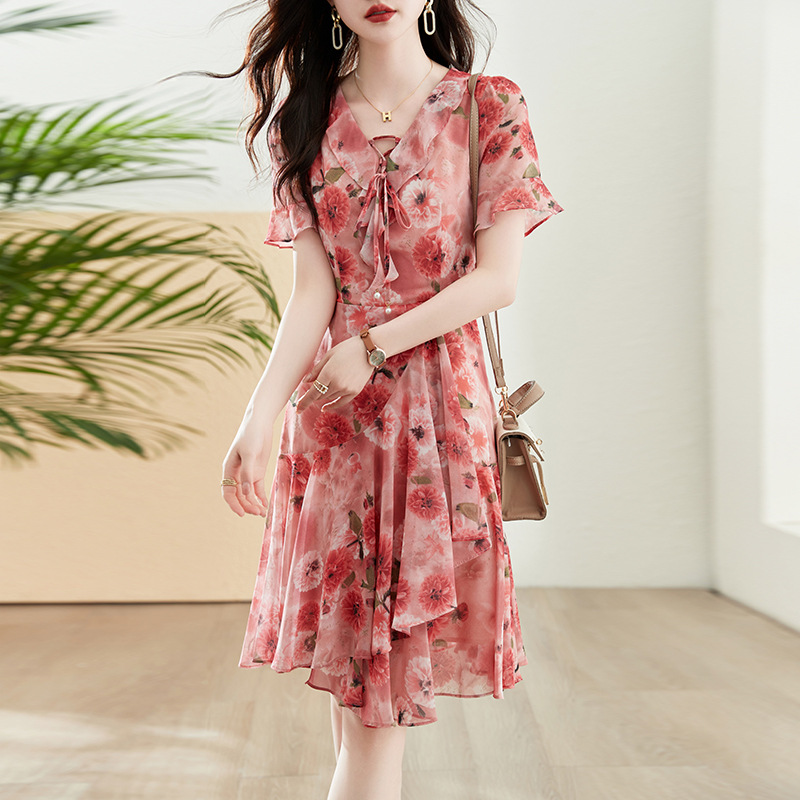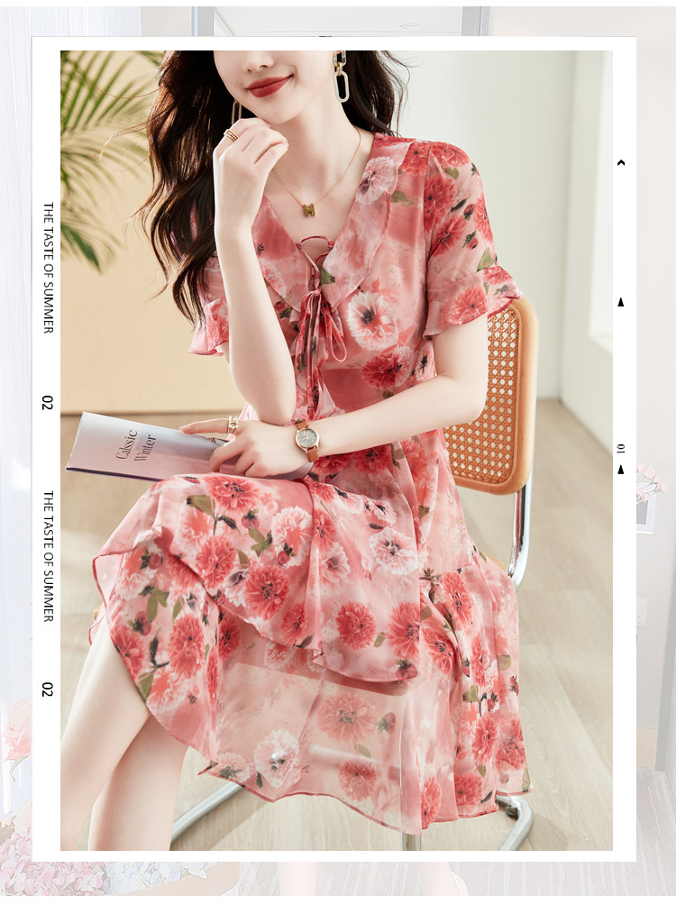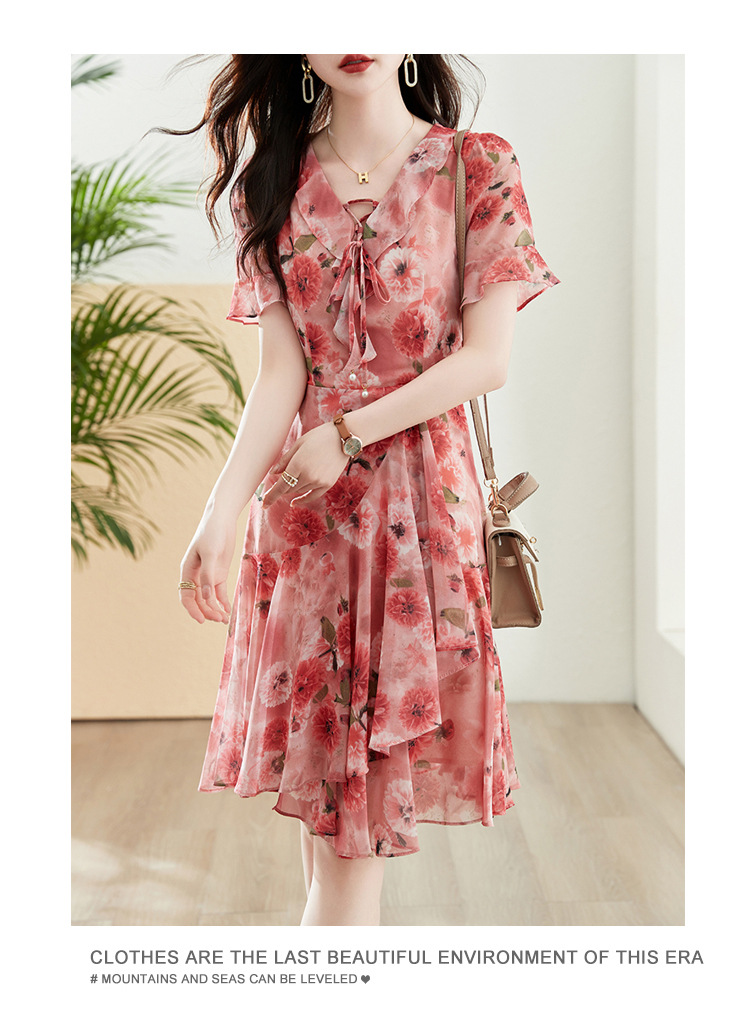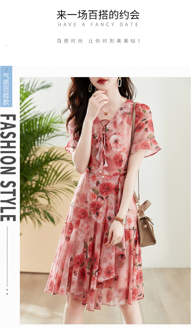 雪纺印花连衣裙女式夏季2023新款不规则设计感气质粉色碎花仙女裙