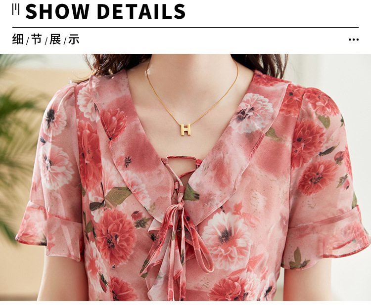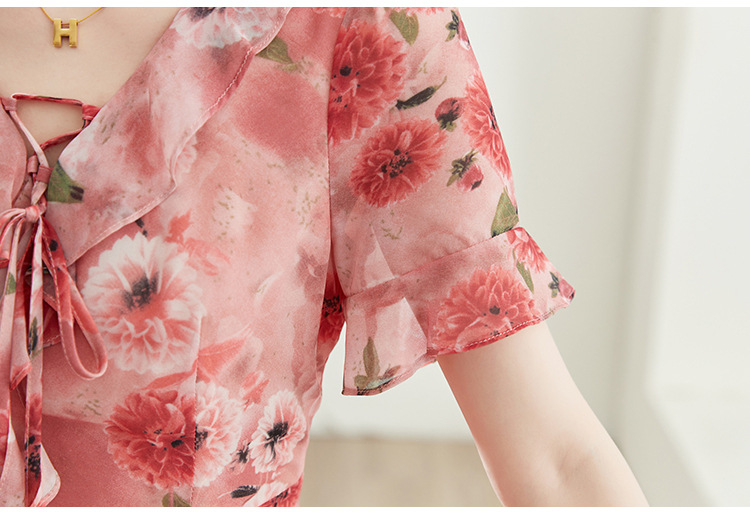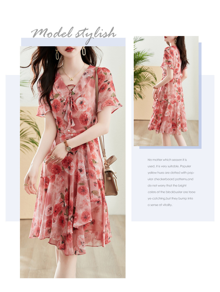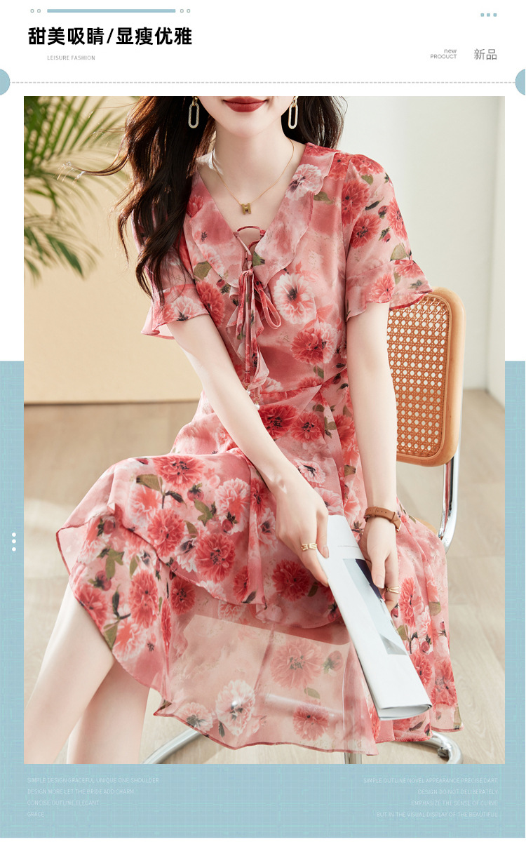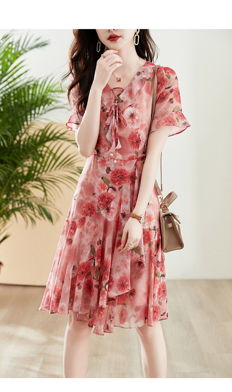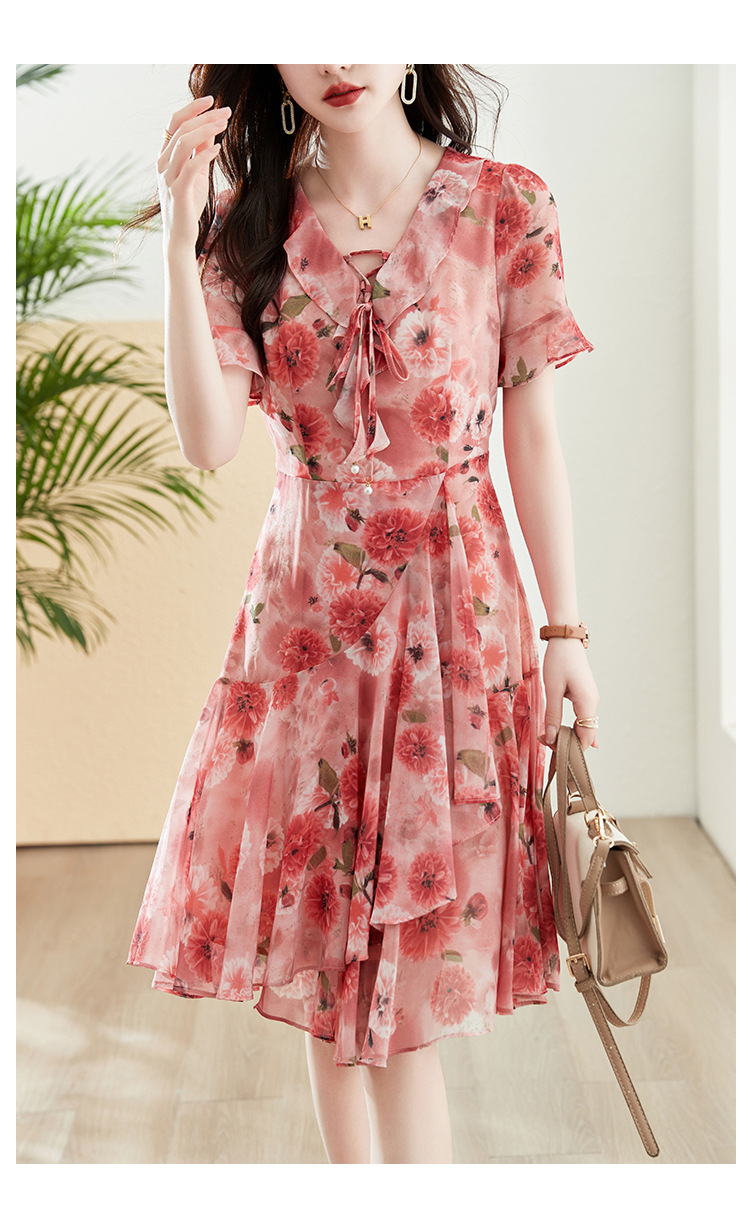雪纺印花连衣裙女式夏季2023新款不规则设计感气质粉色碎花仙女裙