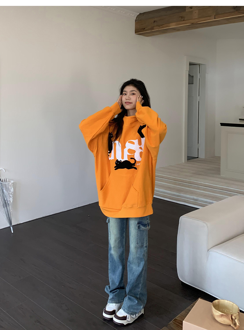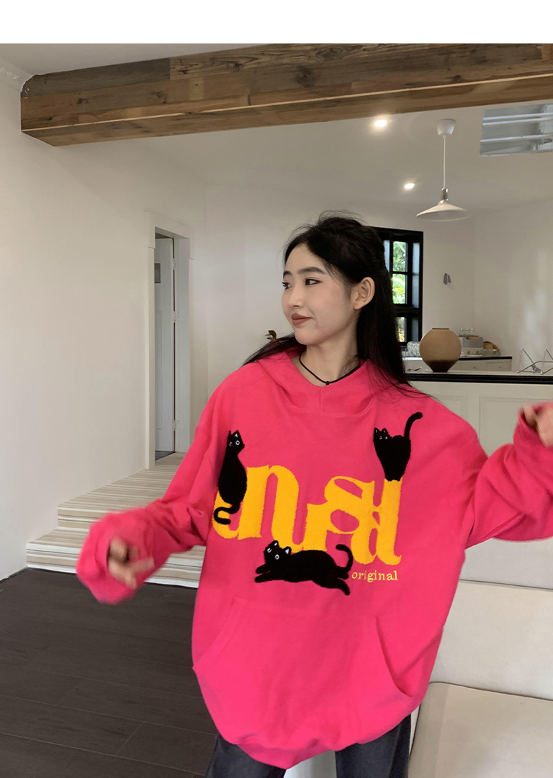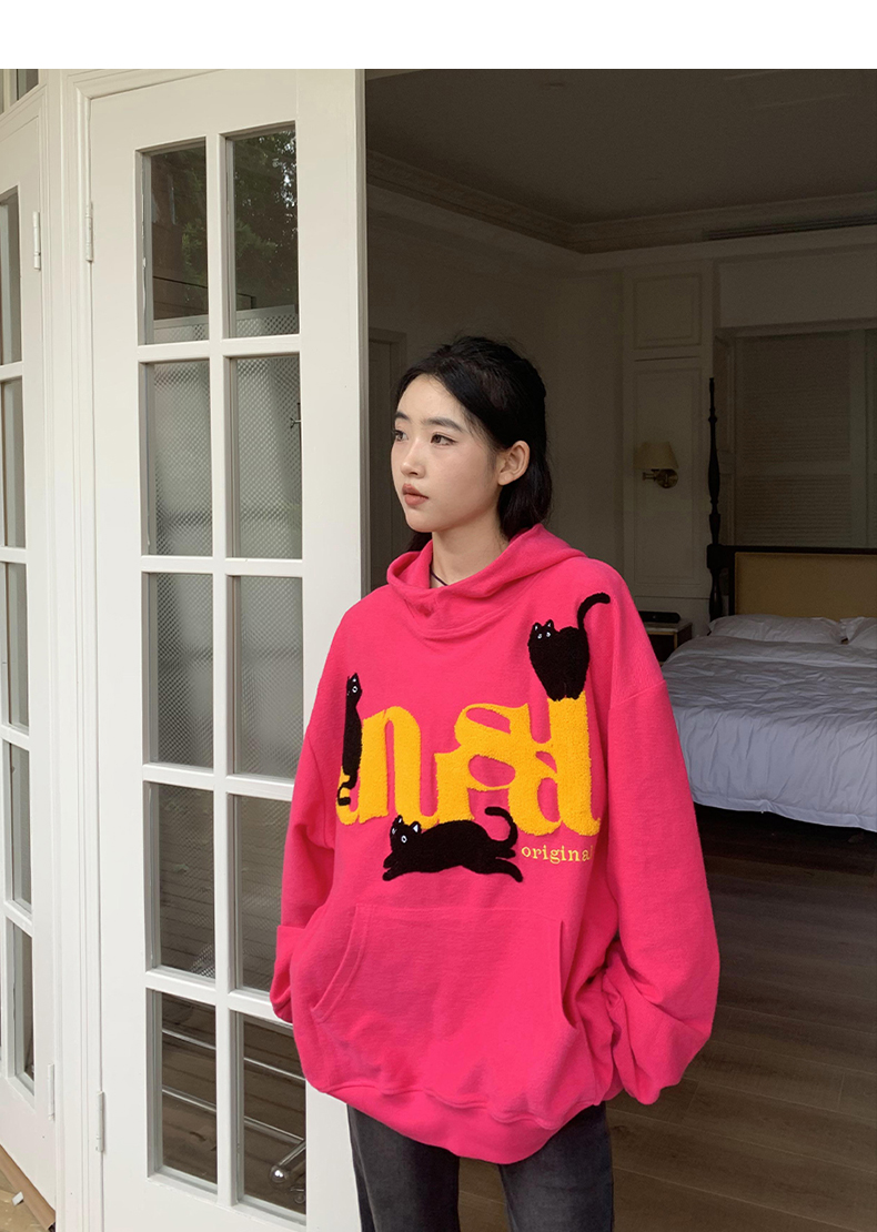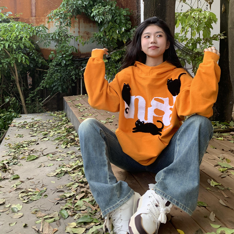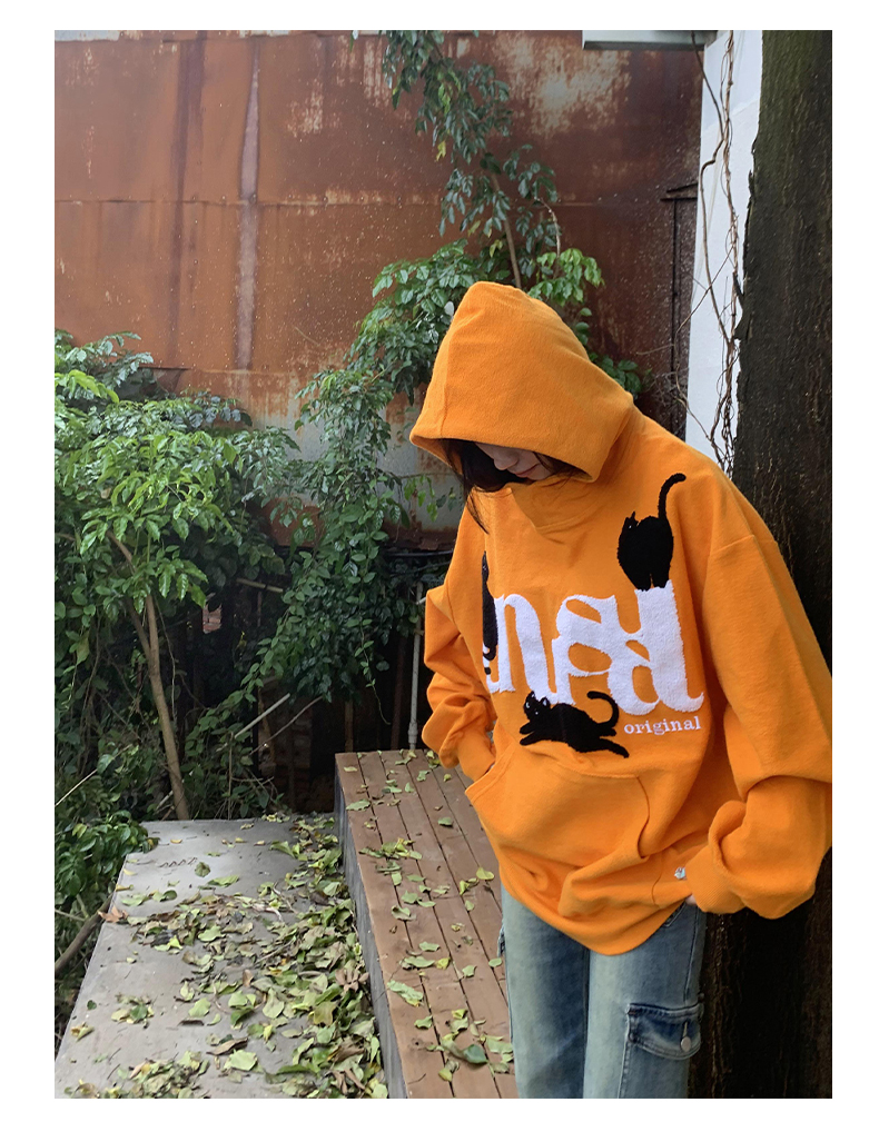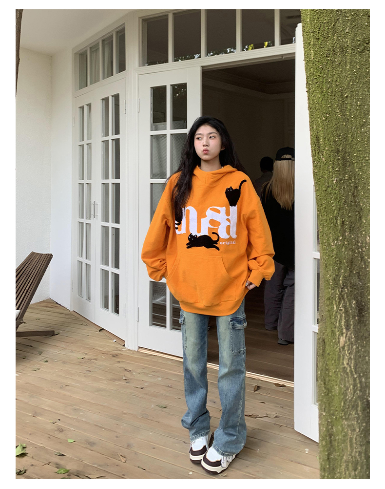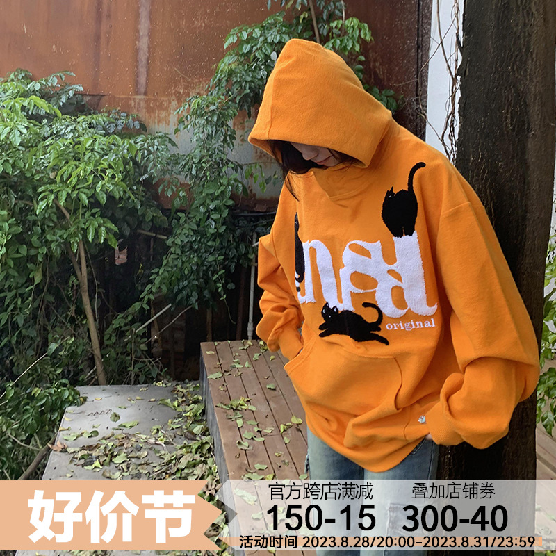 橘子樹在哪兒美式重磅毛巾繡貓咪連帽運動衫女春秋寬鬆百搭套頭帽衫