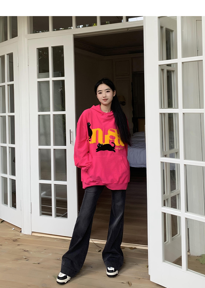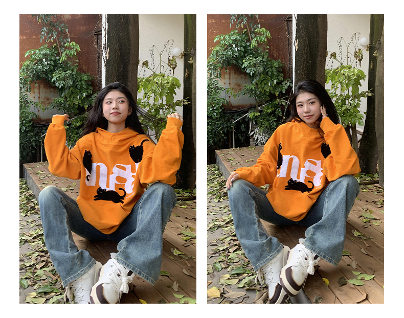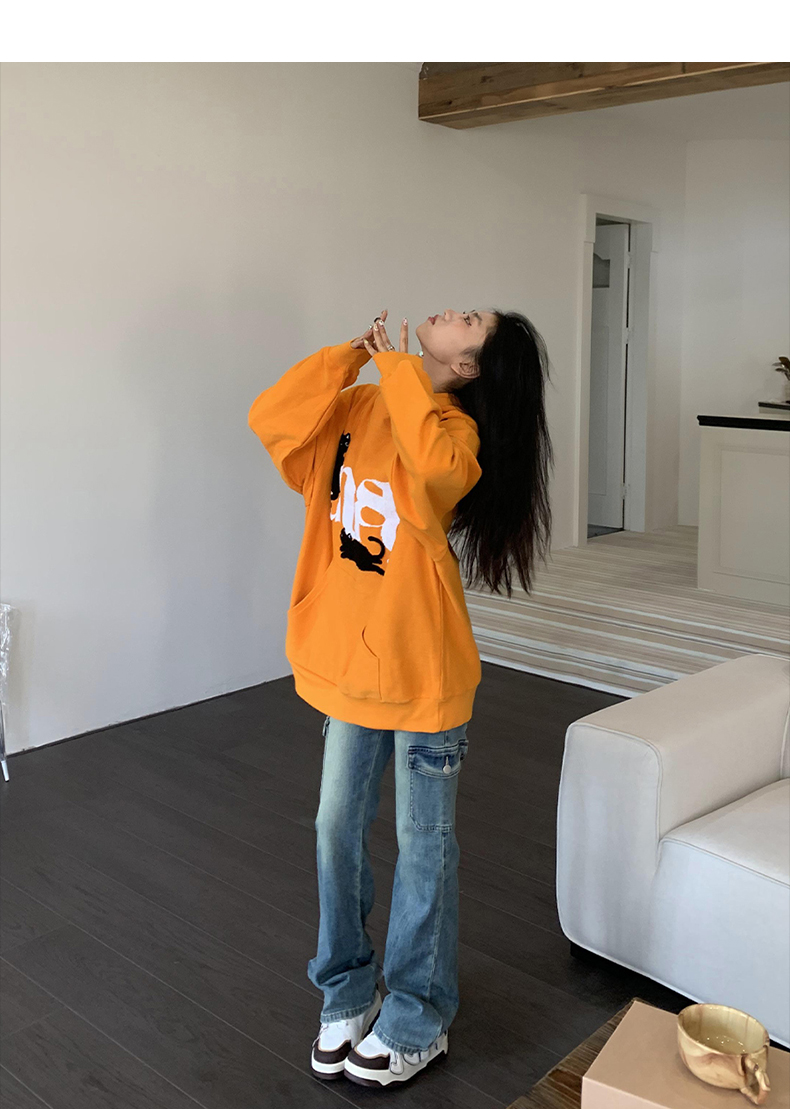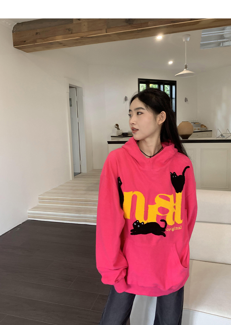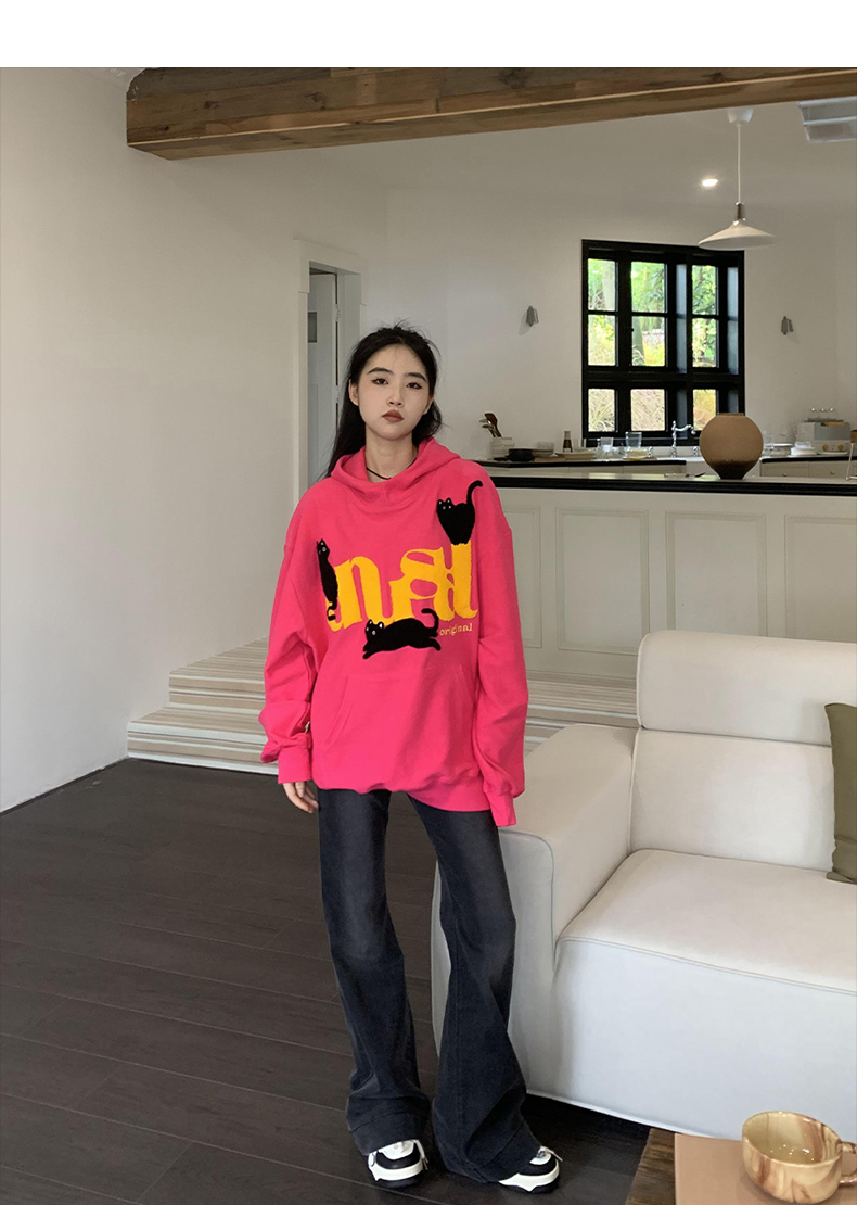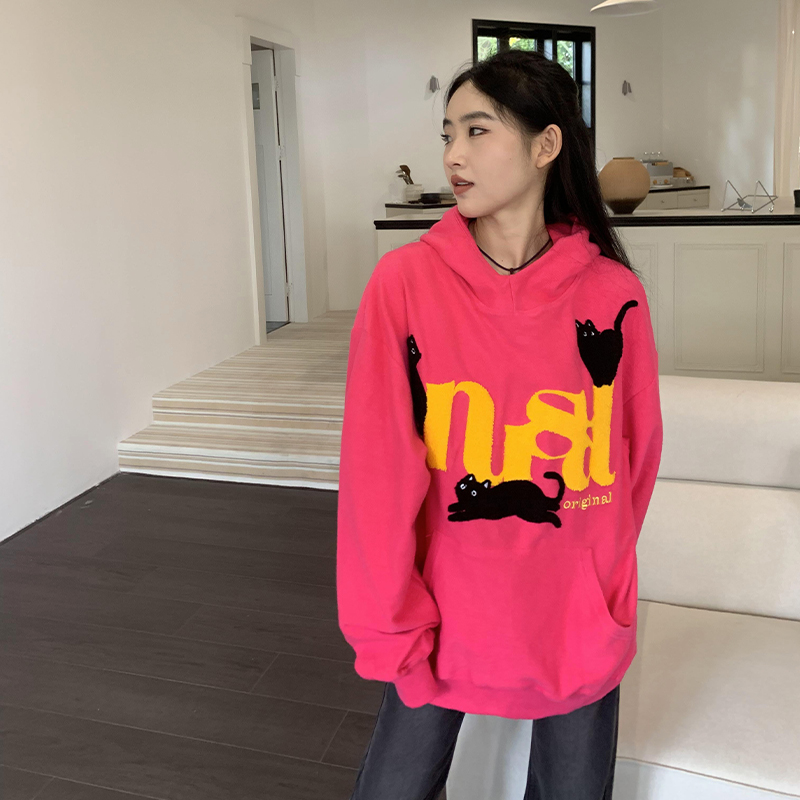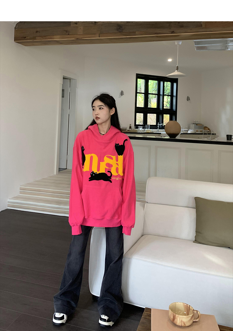 橘子樹在哪兒美式重磅毛巾繡貓咪連帽運動衫女春秋寬鬆百搭套頭帽衫