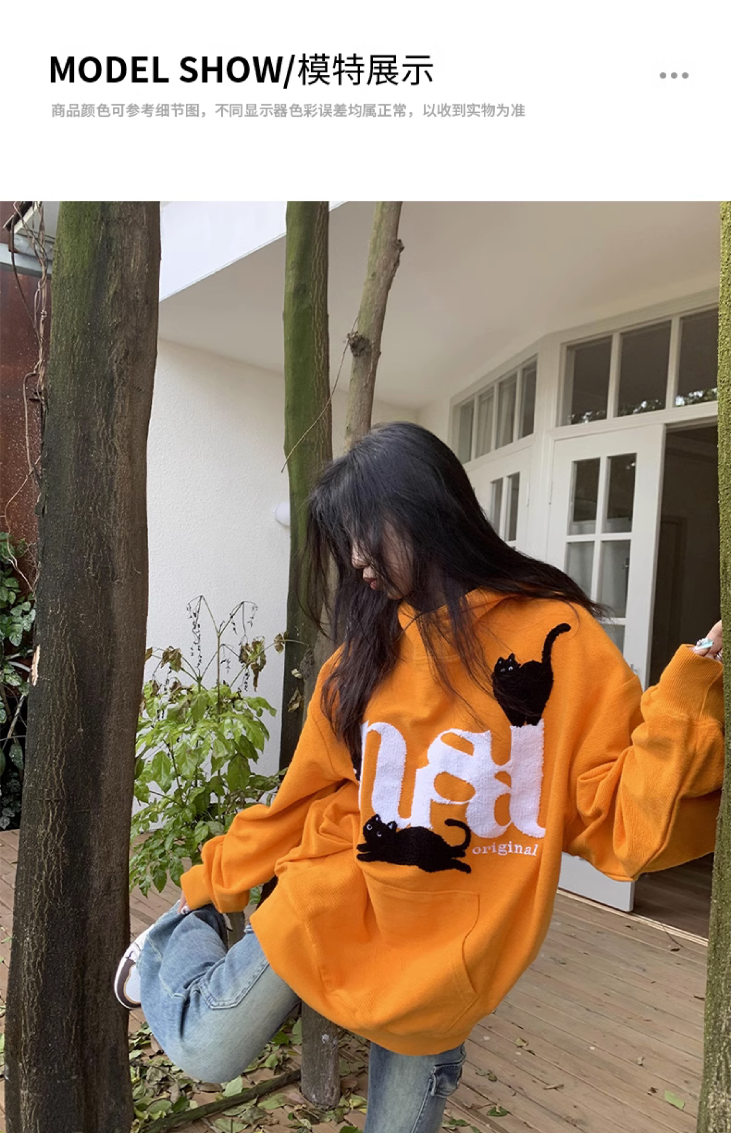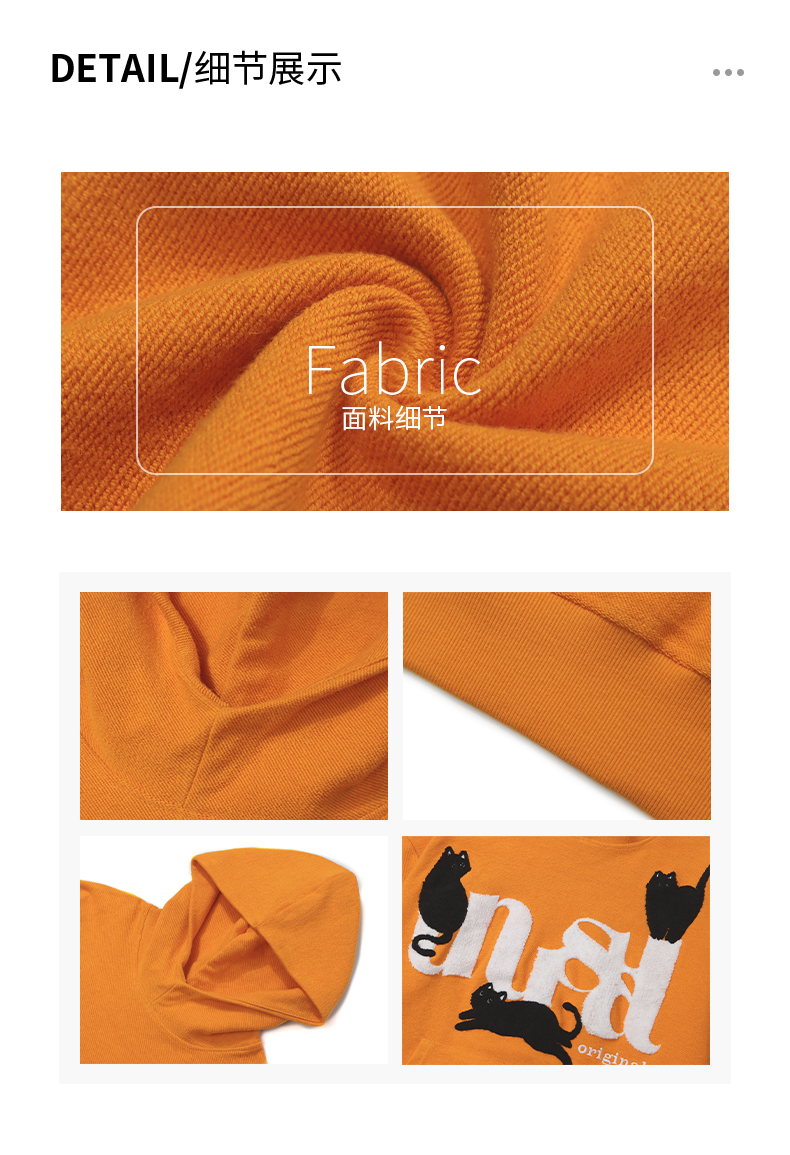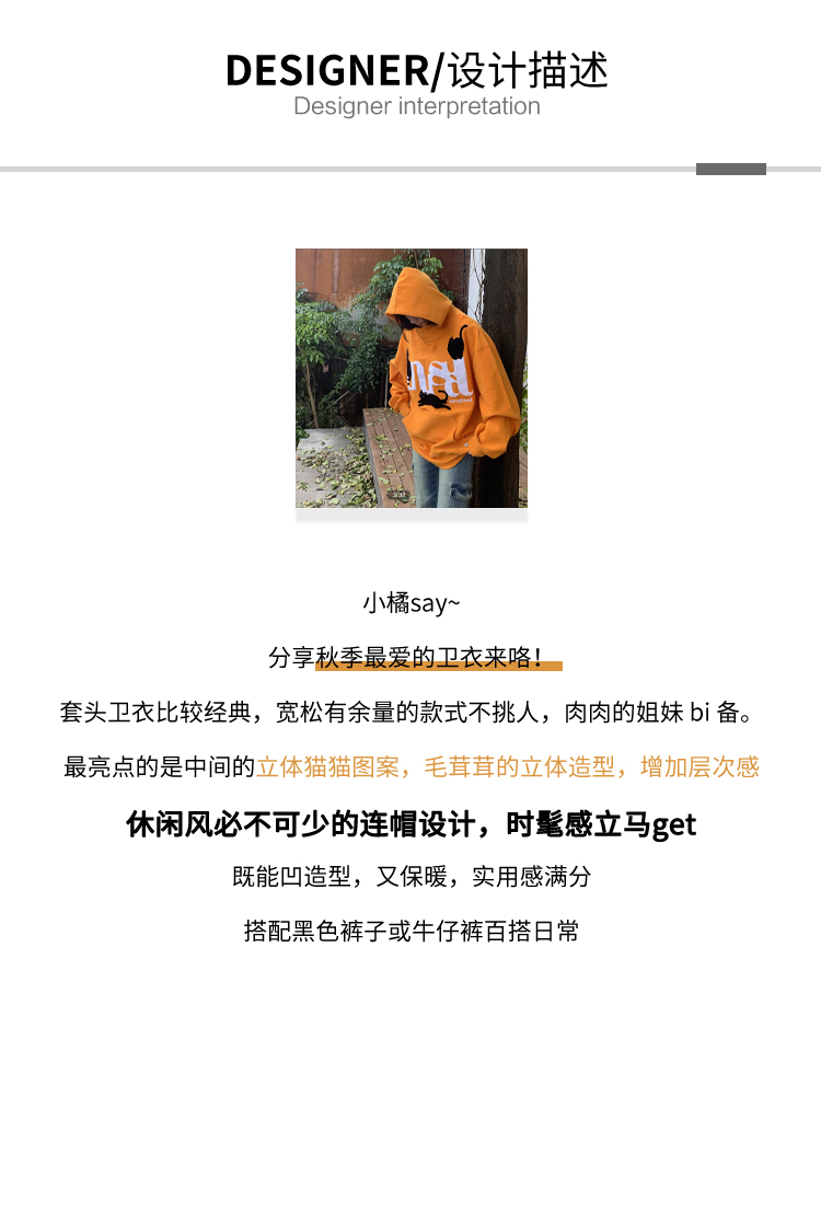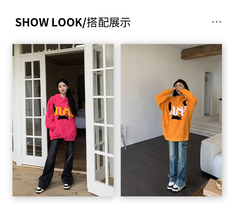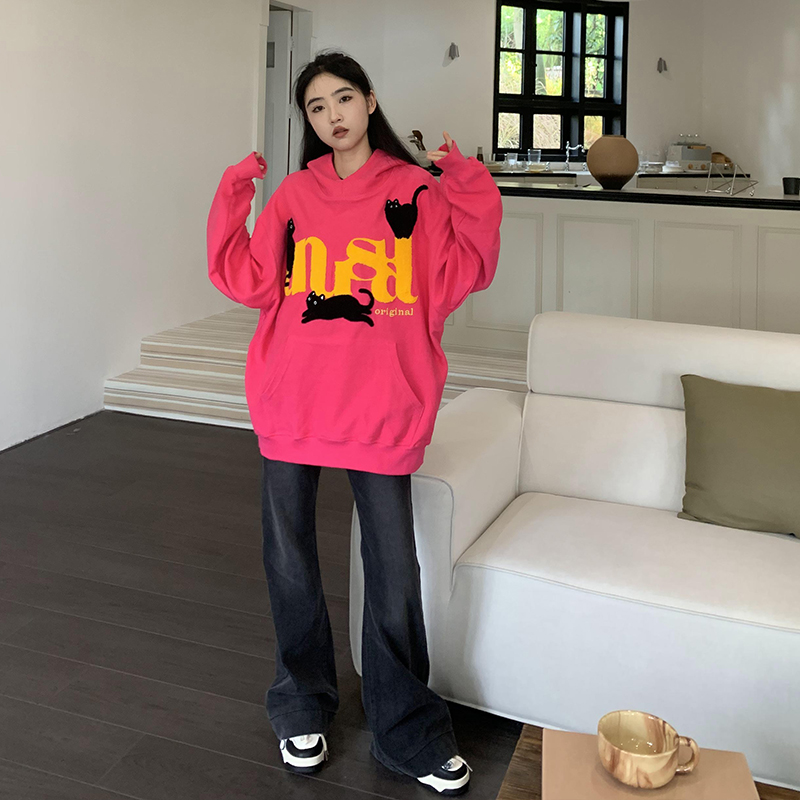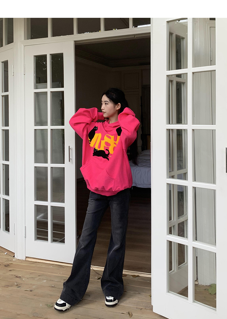 橘子樹在哪兒美式重磅毛巾繡貓咪連帽運動衫女春秋寬鬆百搭套頭帽衫