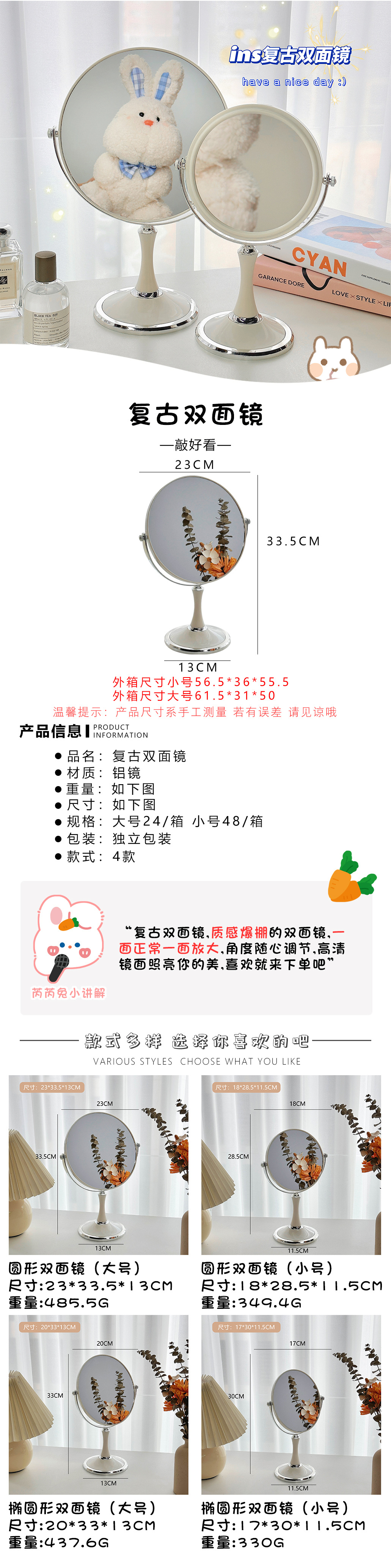 颜色 1#圆形双面镜(小号),2#椭圆形双面镜(小号),3#圆形双面镜(大号),4#椭圆形双面镜(大号)