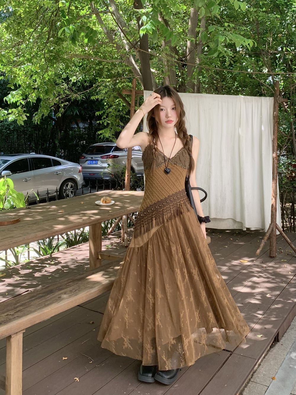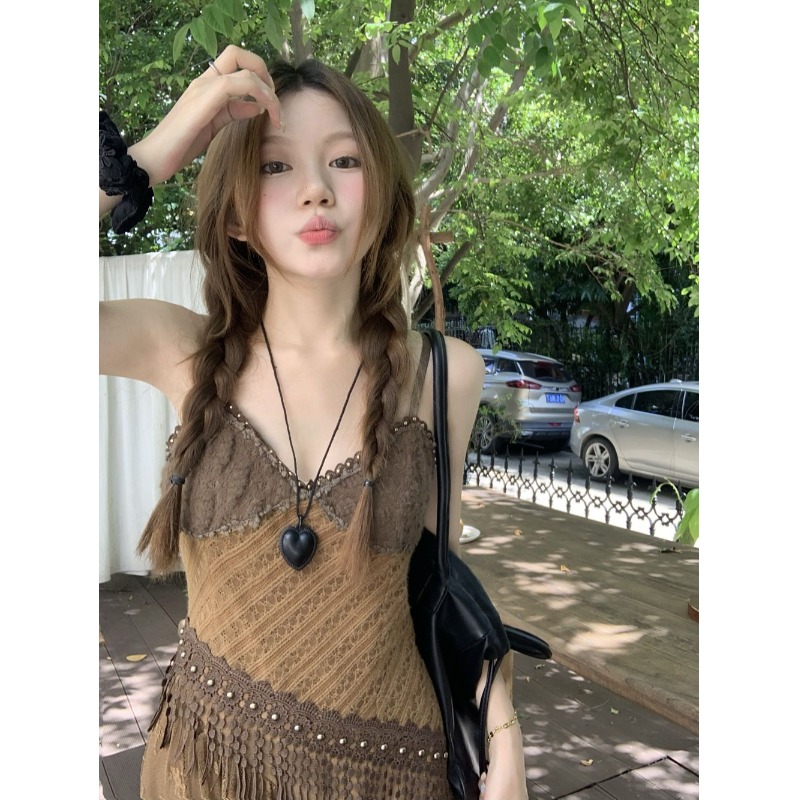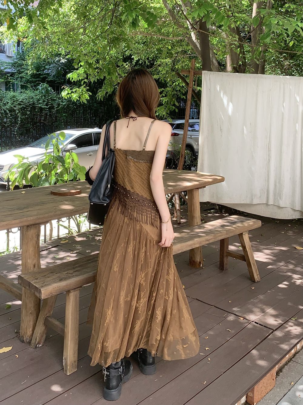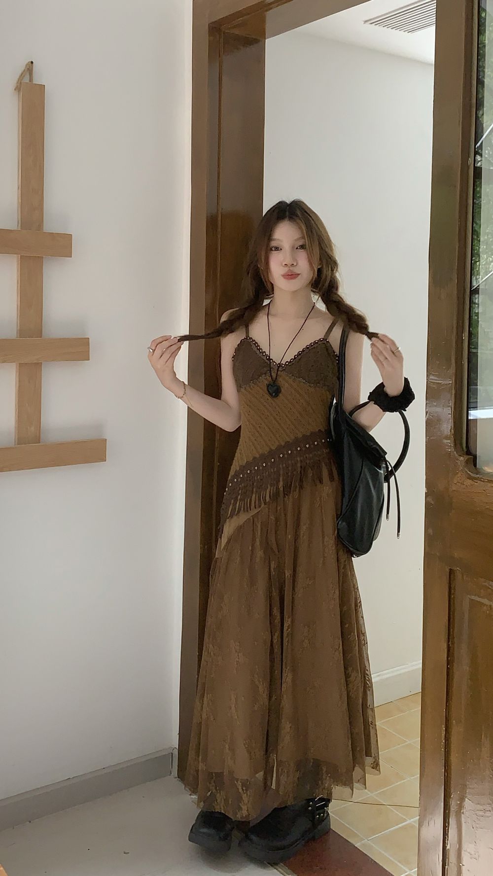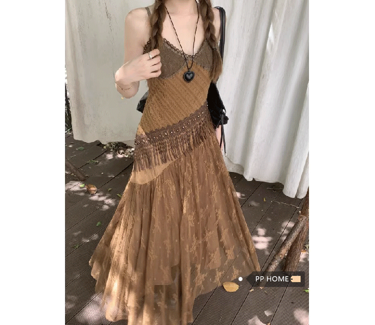 PPHOME中古甜心~新中式復古設計感V領吊帶洋裝女夏收腰顯瘦長裙