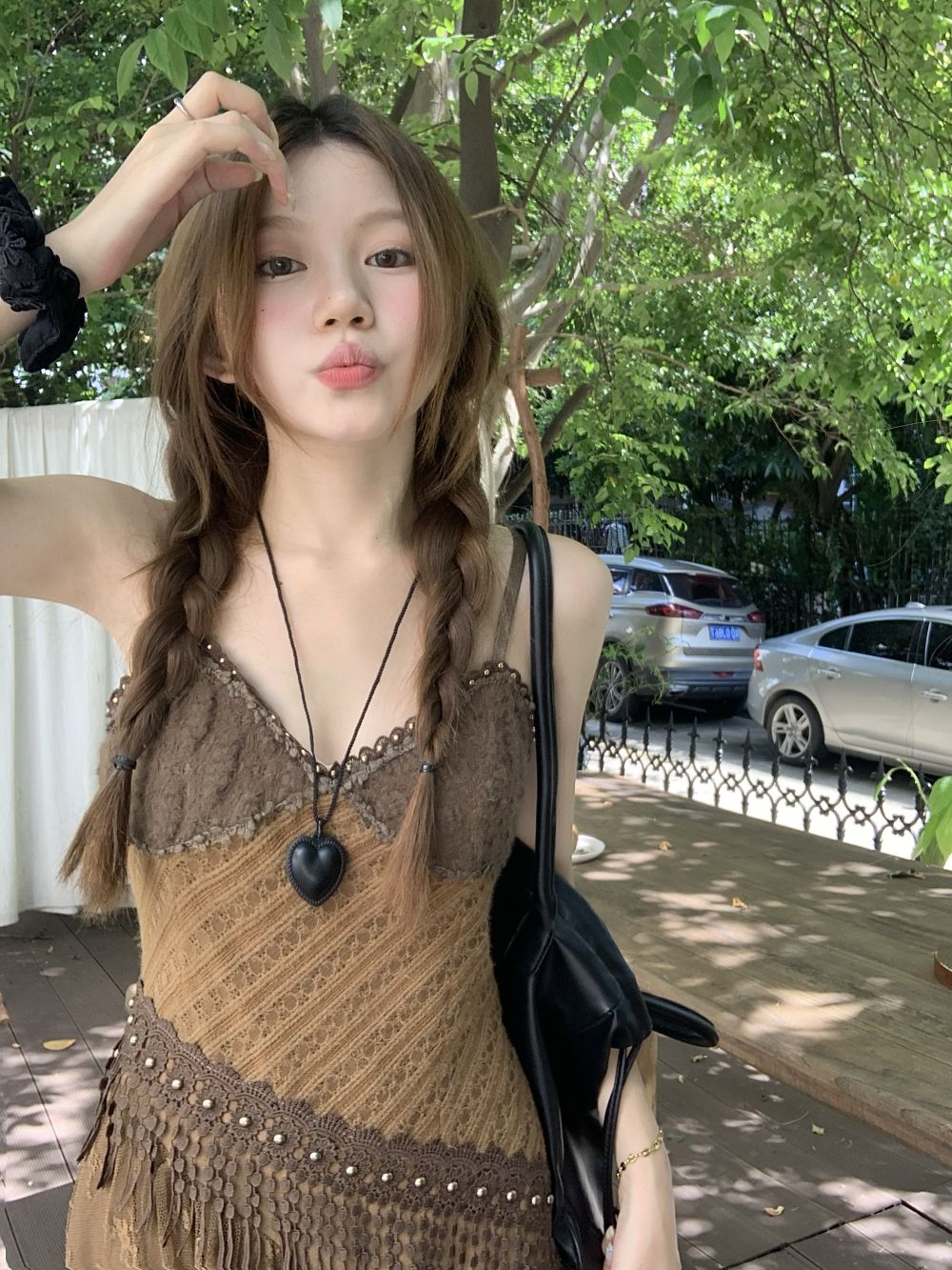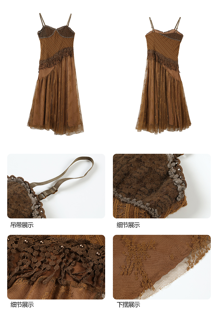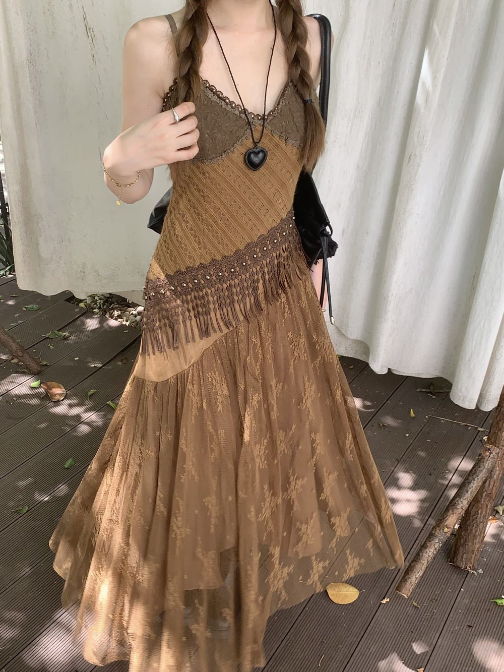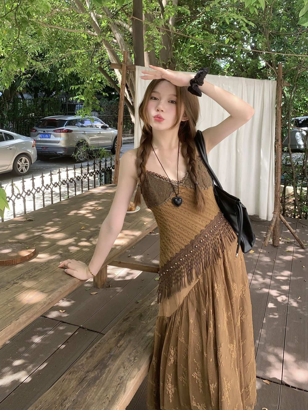 PPHOME中古甜心~新中式復古設計感V領吊帶洋裝女夏收腰顯瘦長裙
