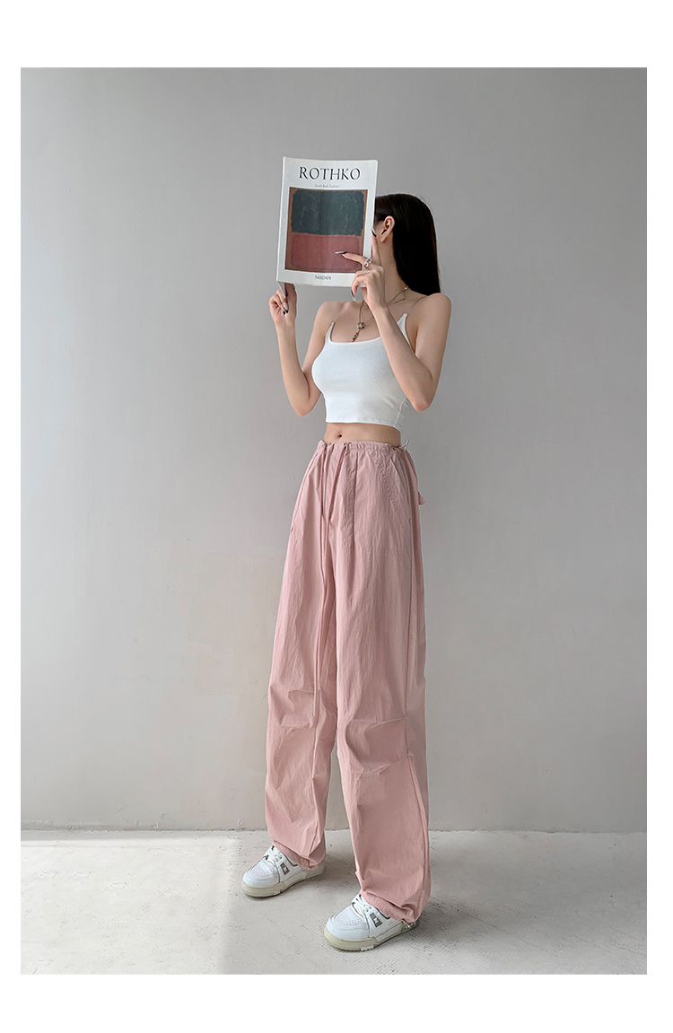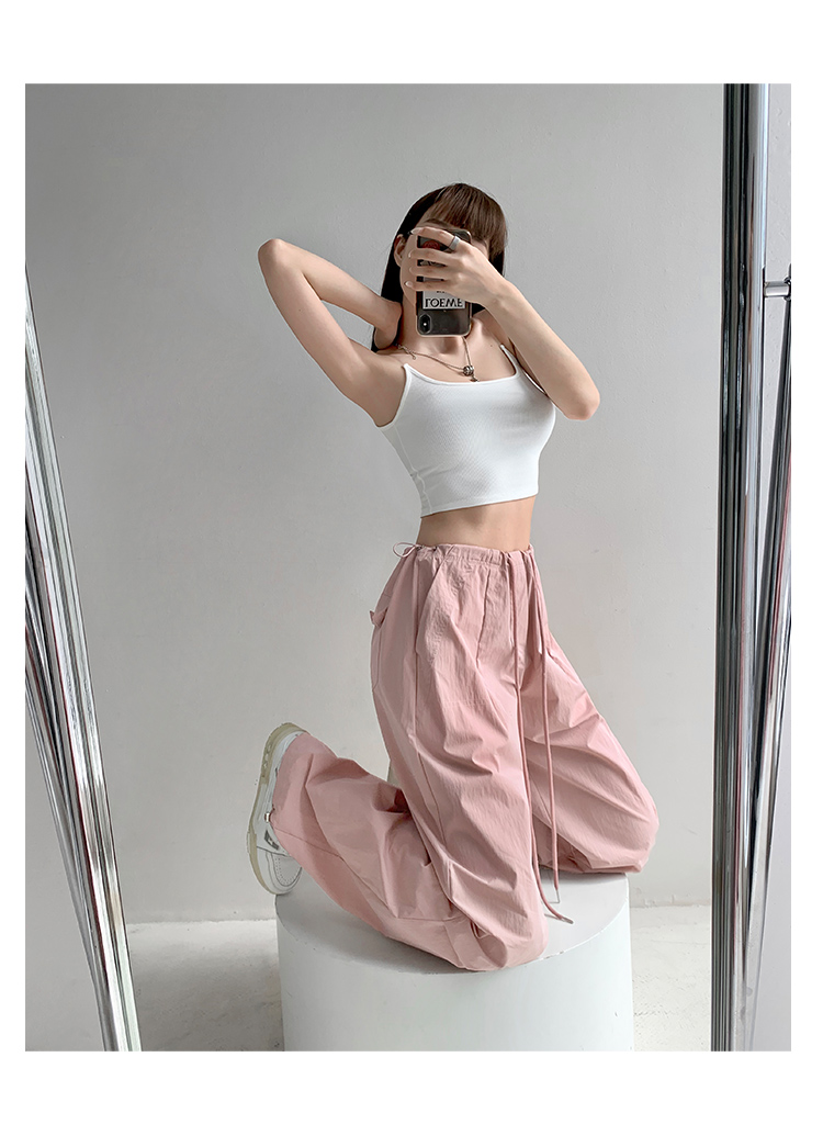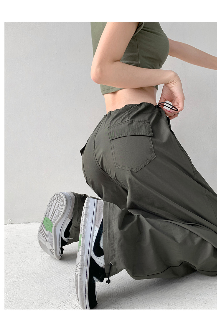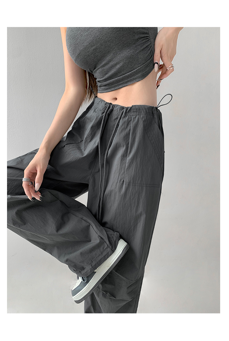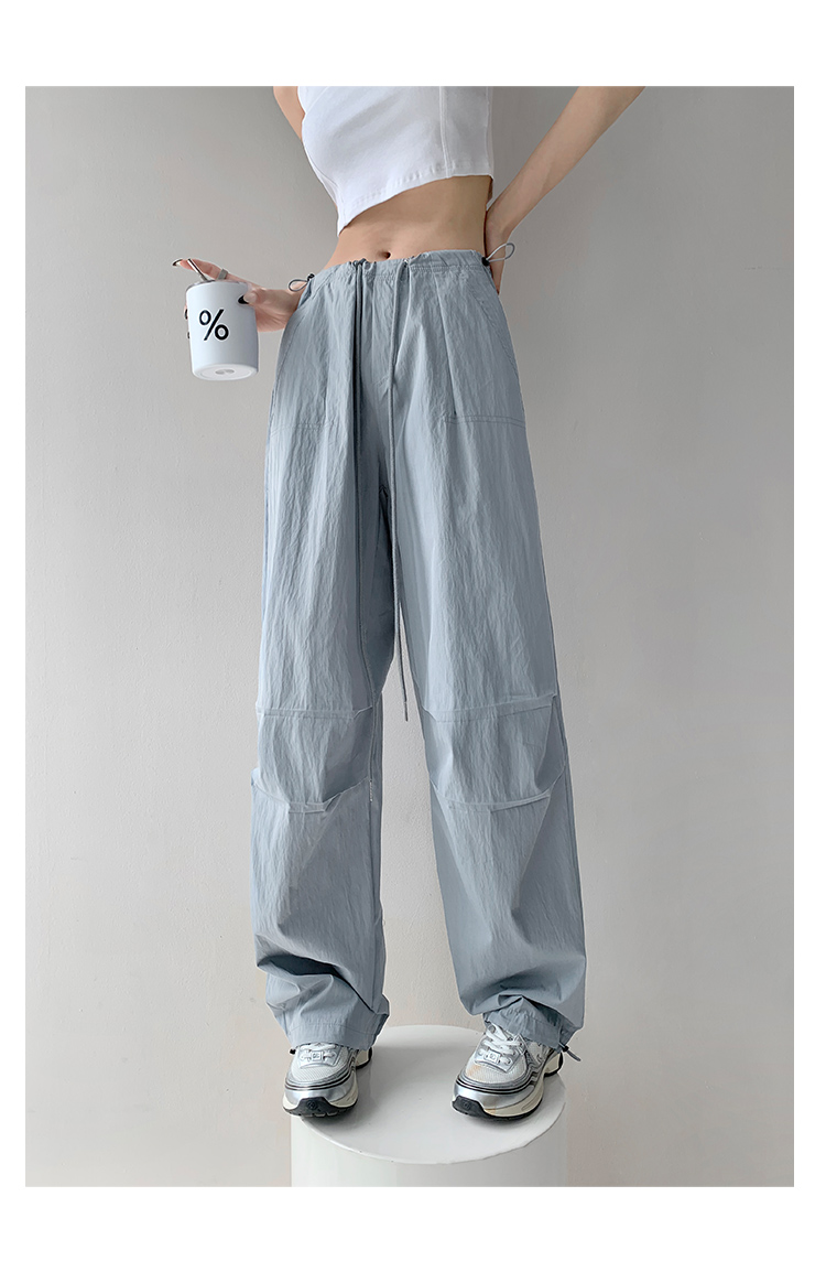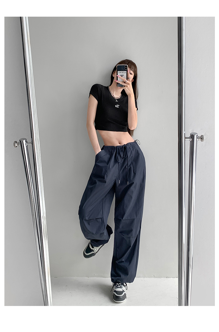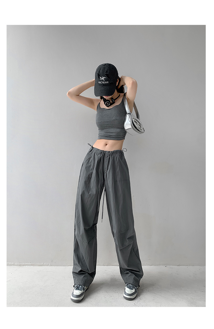 張小奈美式辣妹風寬鬆低腰抽繩工裝褲女春秋薄款褶皺闊腿降落傘褲
