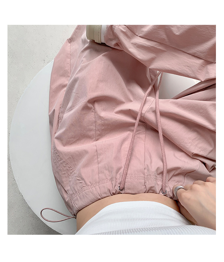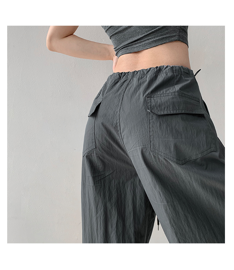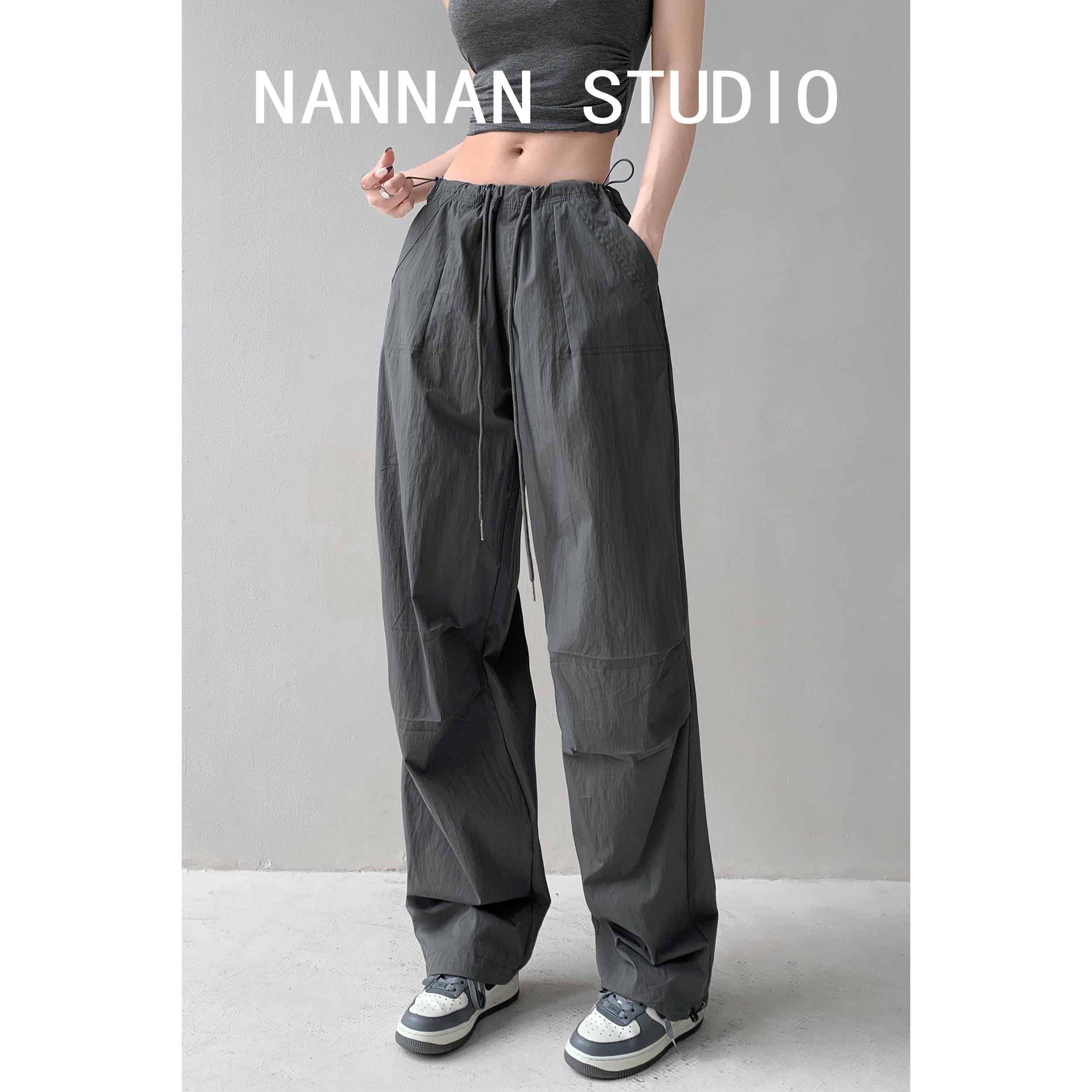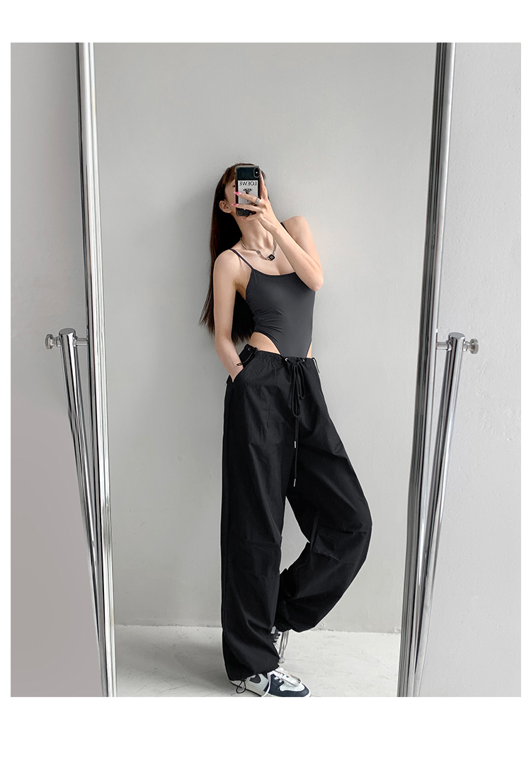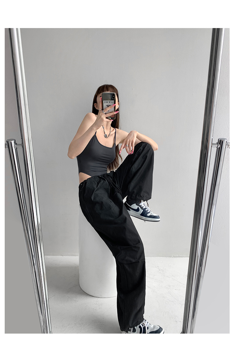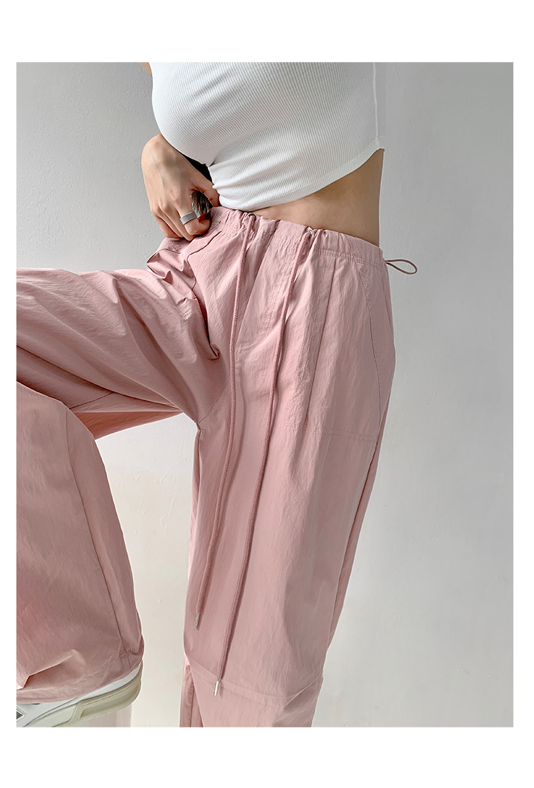 張小奈美式辣妹風寬鬆低腰抽繩工裝褲女春秋薄款褶皺闊腿降落傘褲