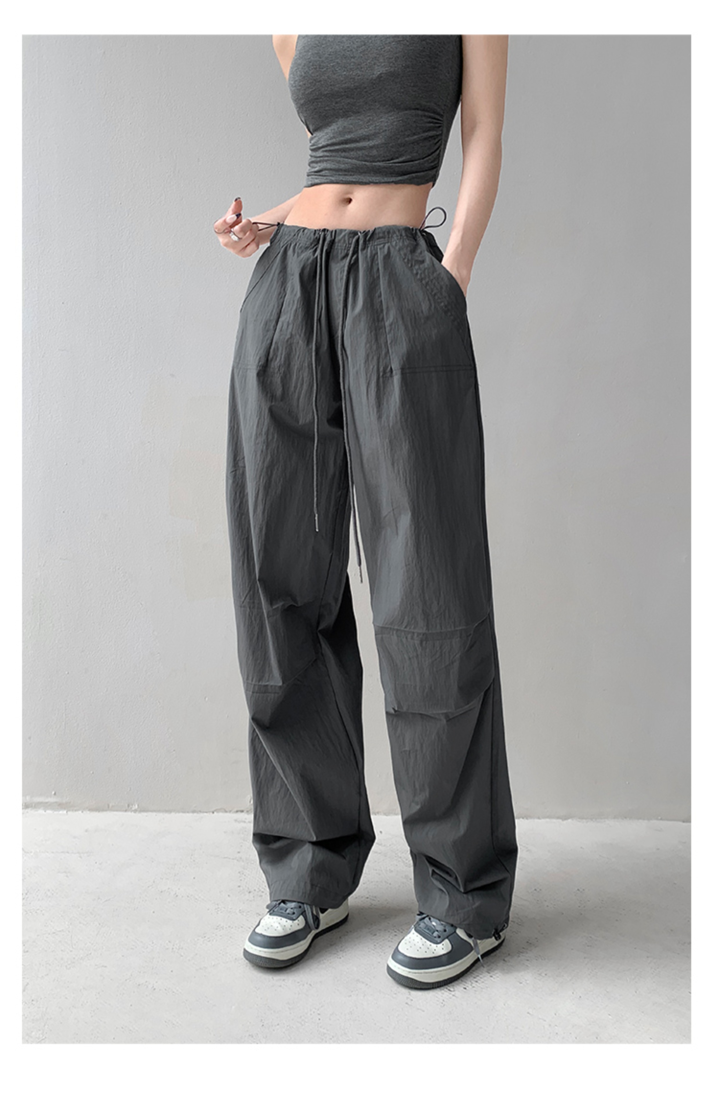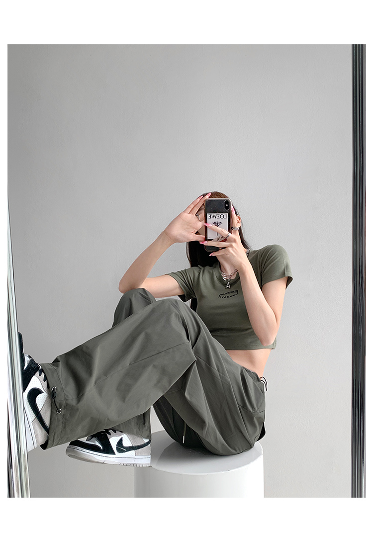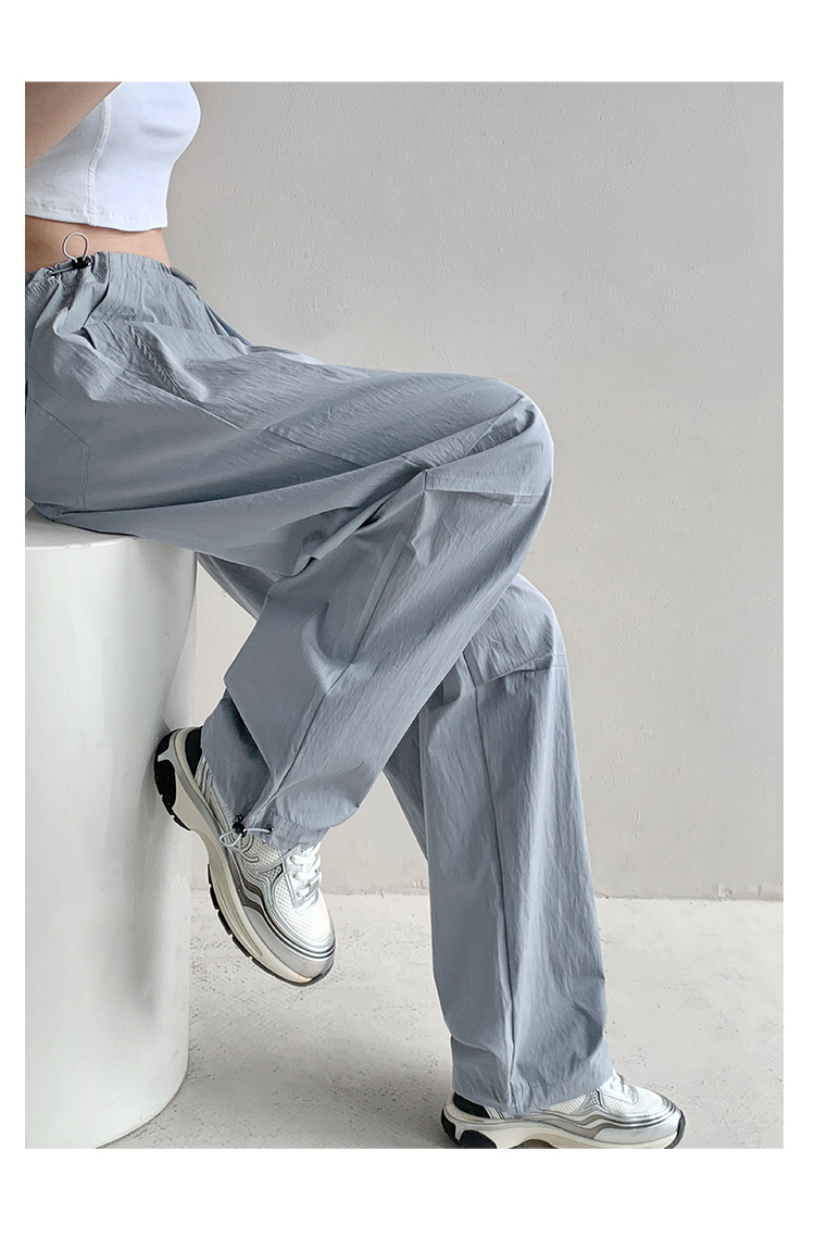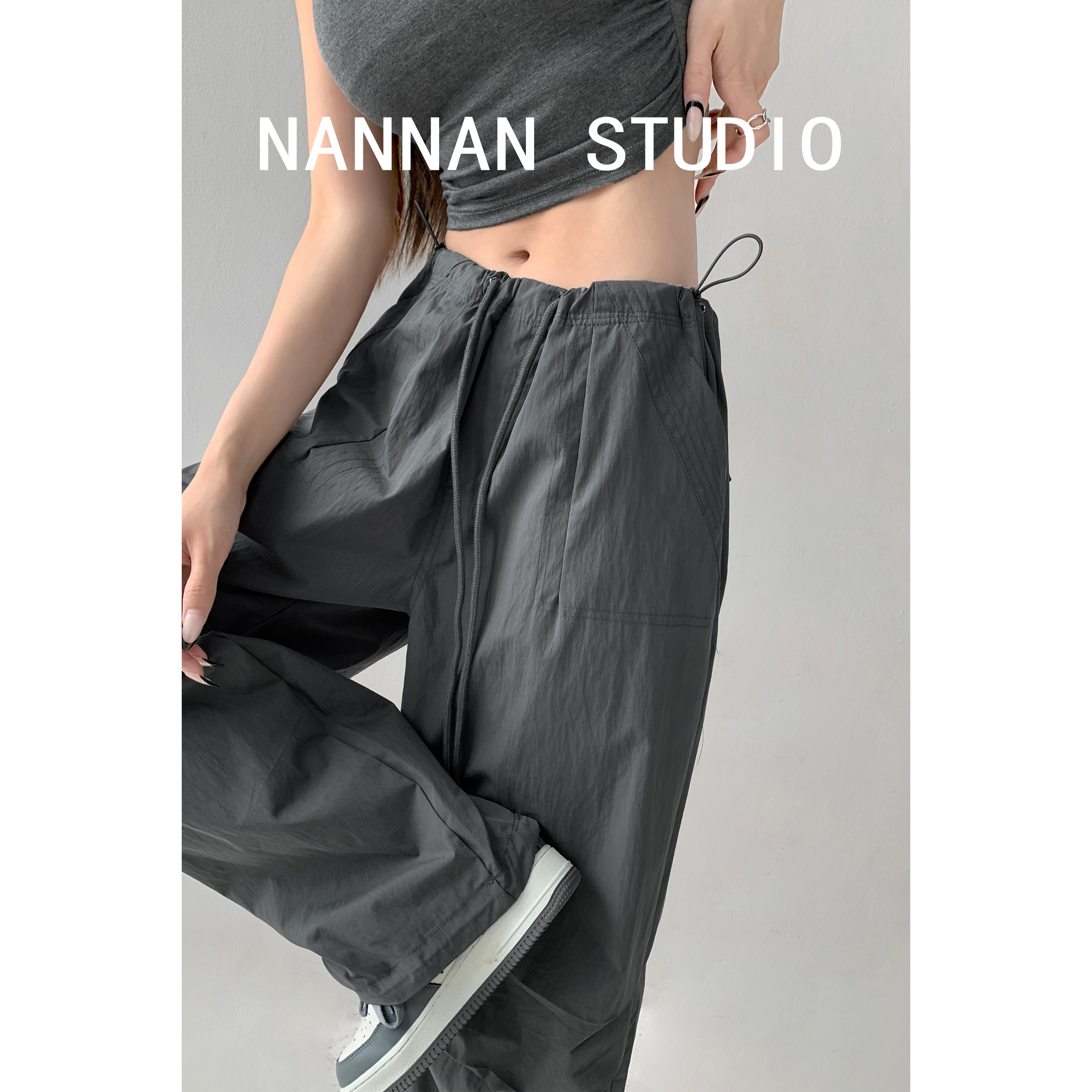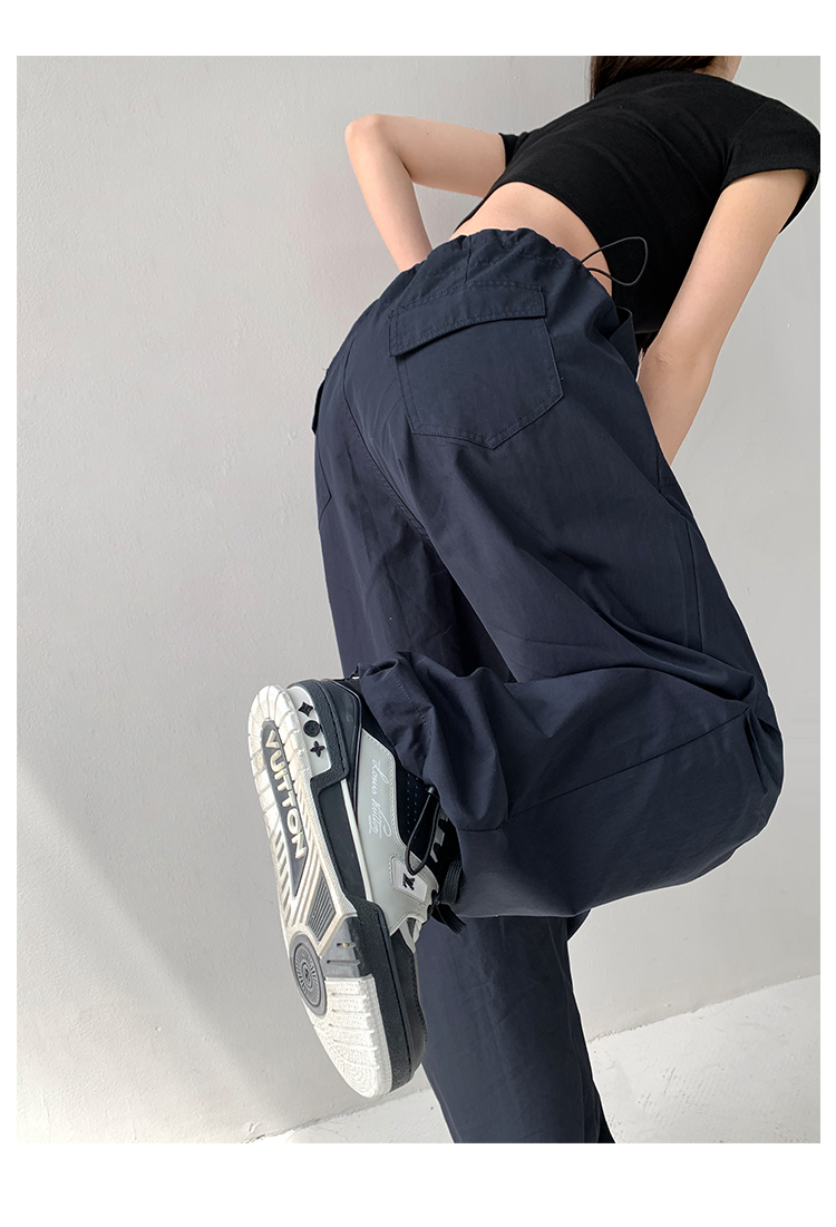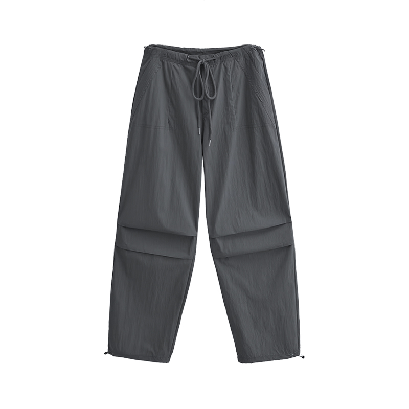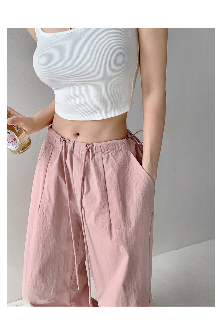 張小奈美式辣妹風寬鬆低腰抽繩工裝褲女春秋薄款褶皺闊腿降落傘褲